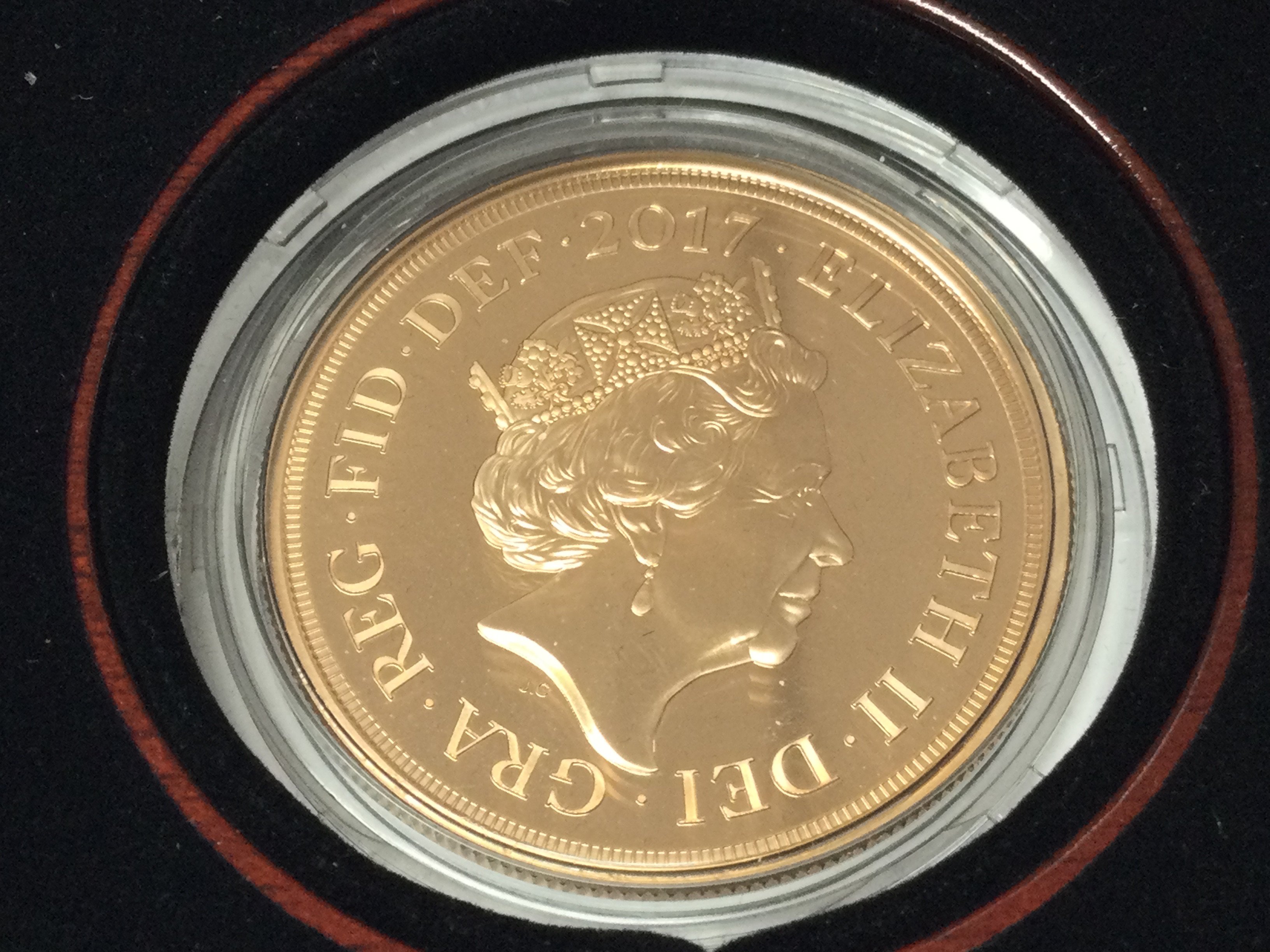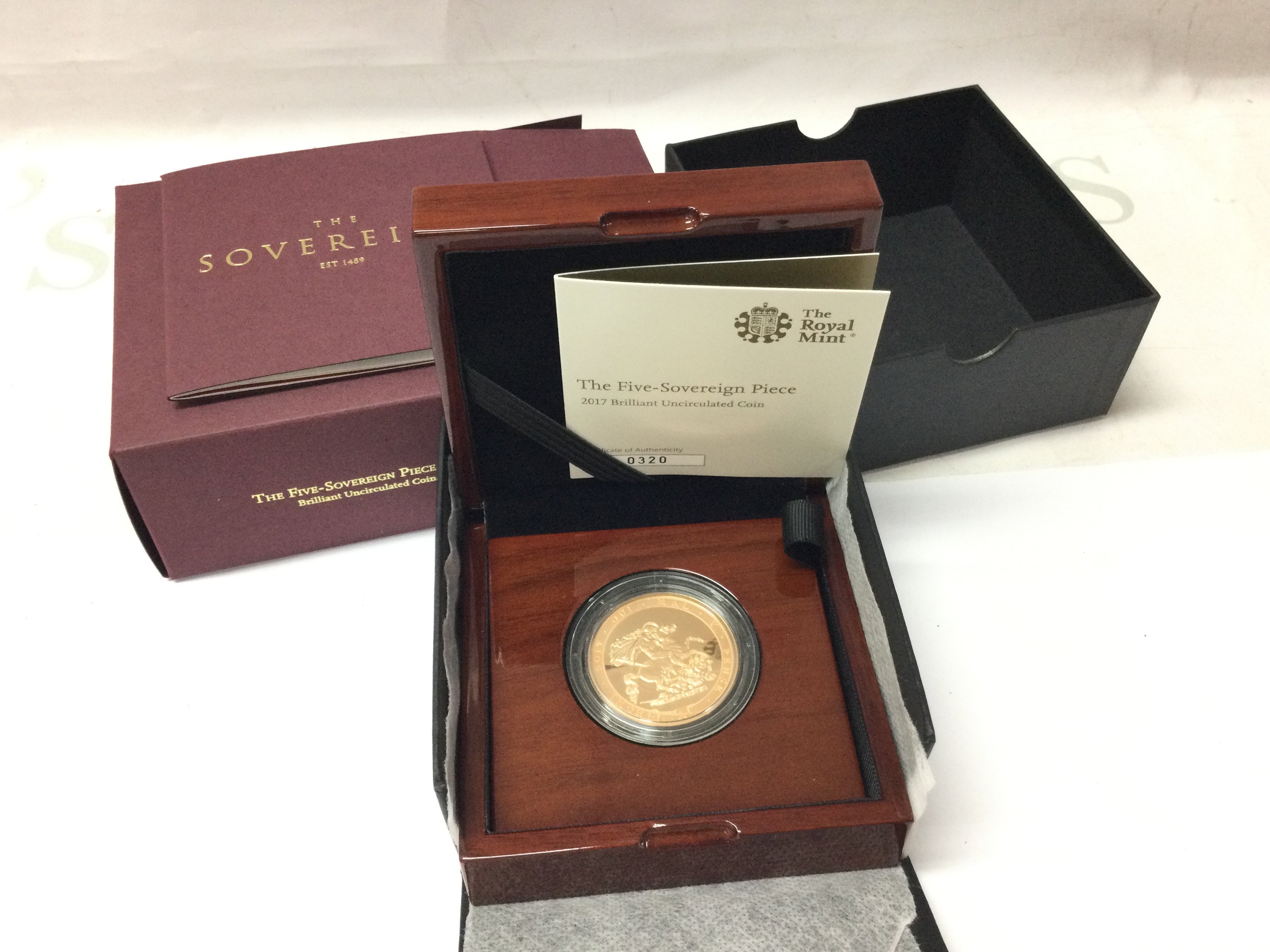 A 2017 five sovereign piece brilliant uncirculated coin with COA.Postage B