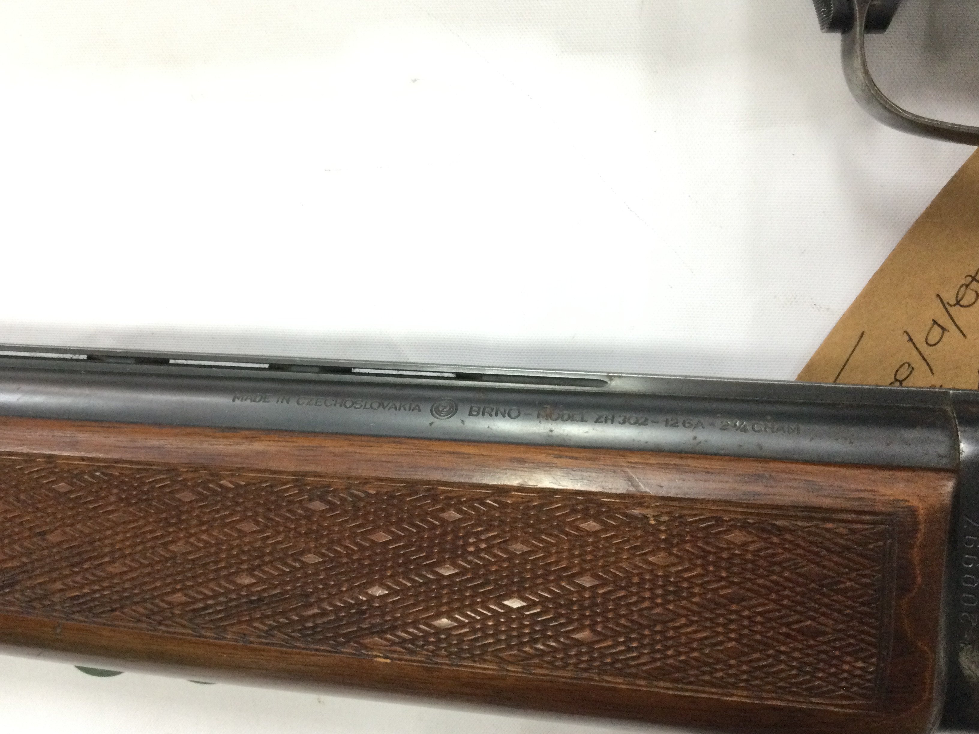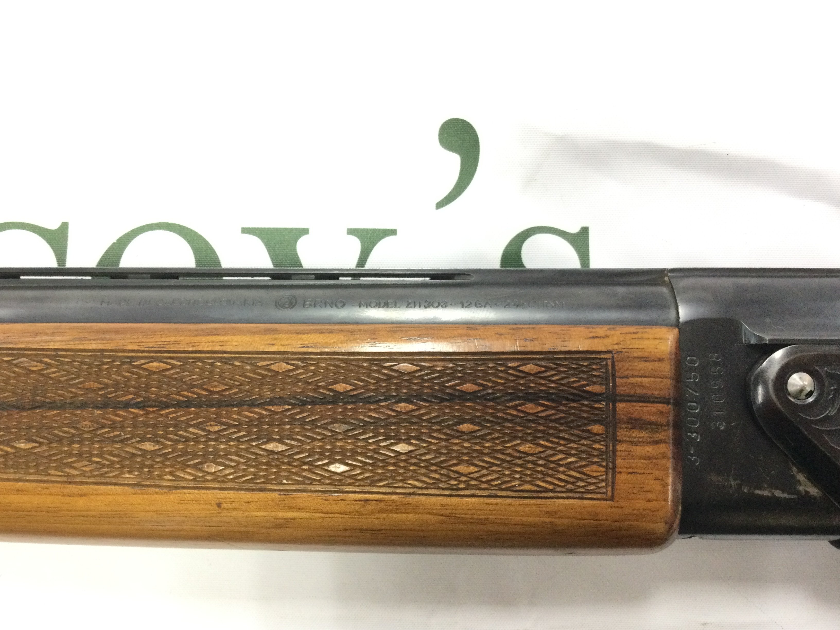 A 12 gauge over and under shotgun with walnut stock. Double trigger with ejector and fixed choke. Comes with spare barrel. BRNO model ZH303. Serial number 317773. PLEASE NOTE THAT A SHOTGUN LICENSE IS REQUIRED TO PURCHASE THIS ITEM. COLLECTION AND VIEWING BY APPOINTMENT ONLY.