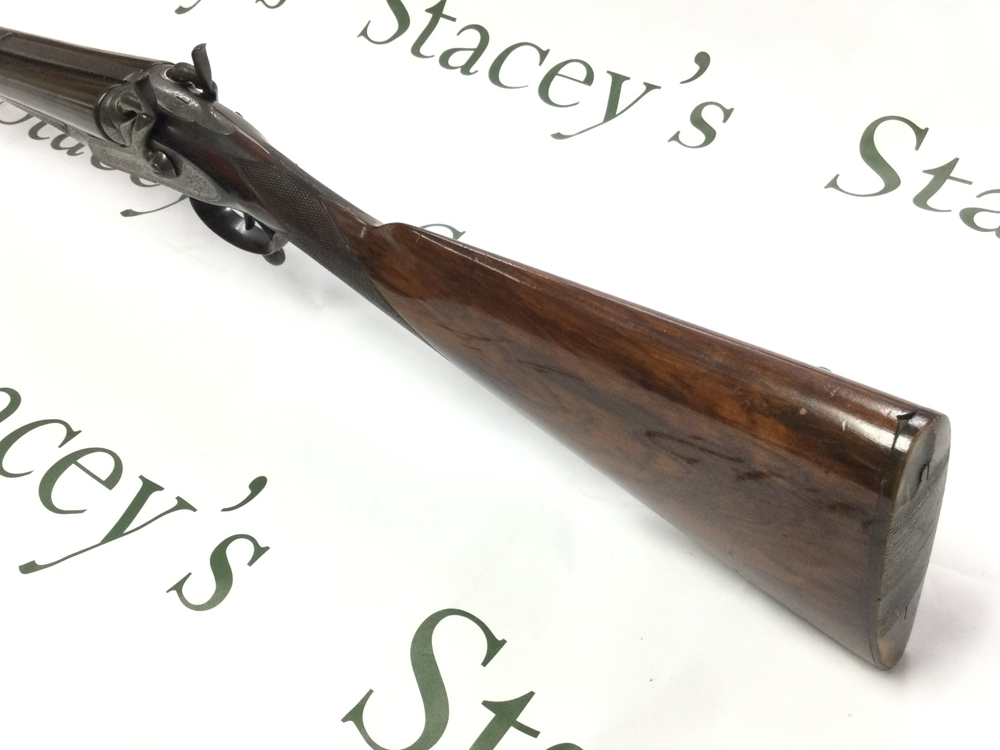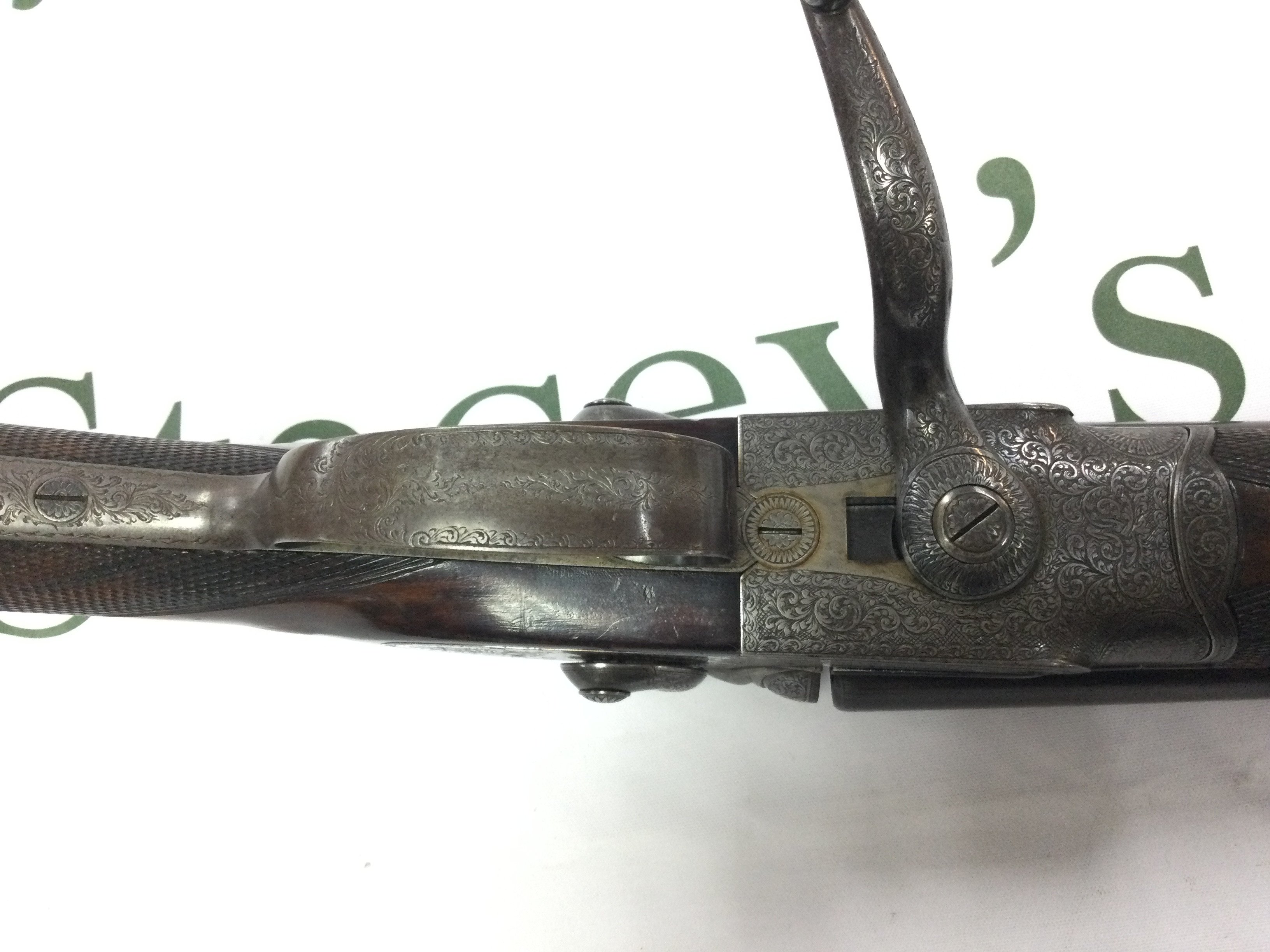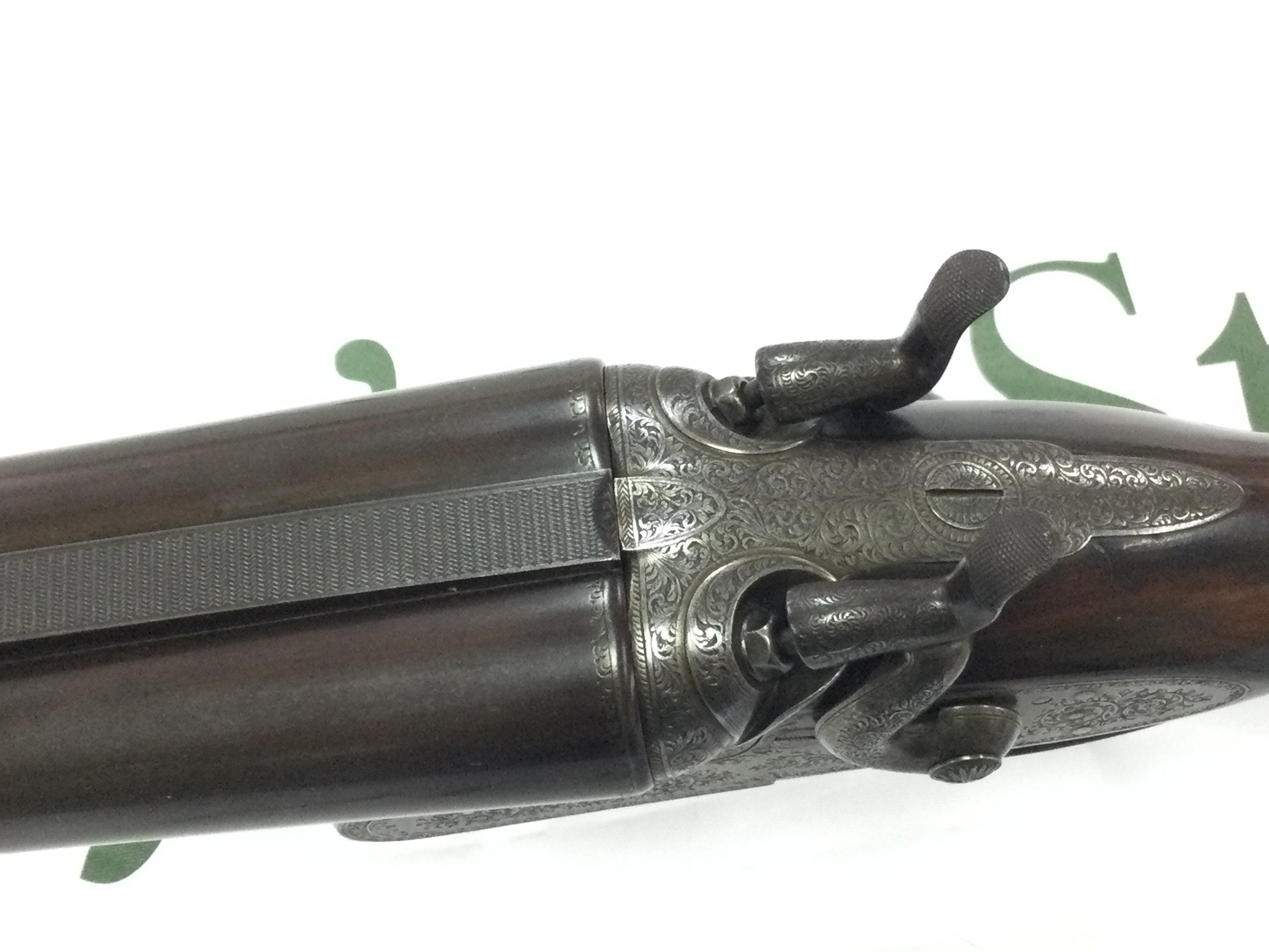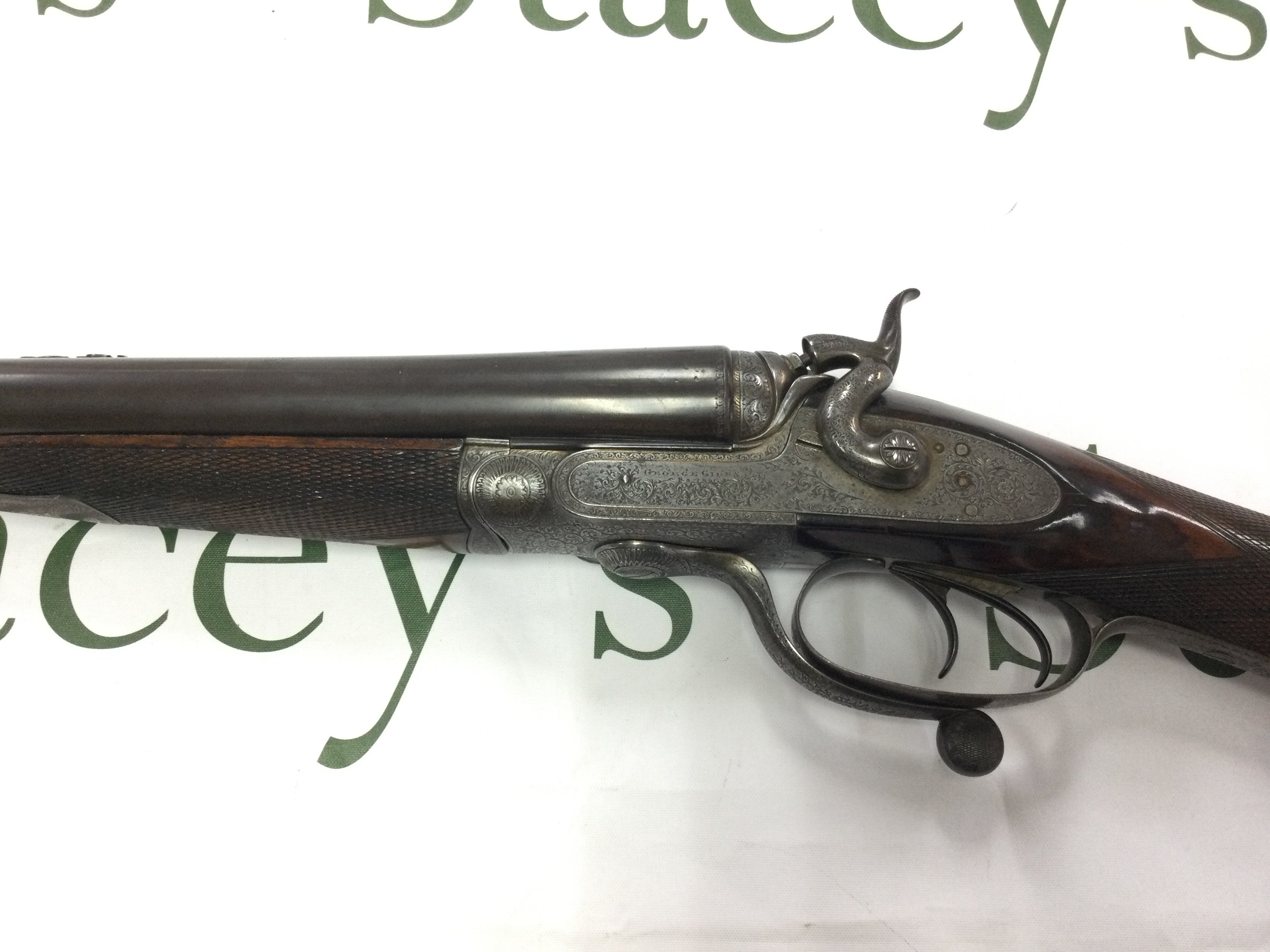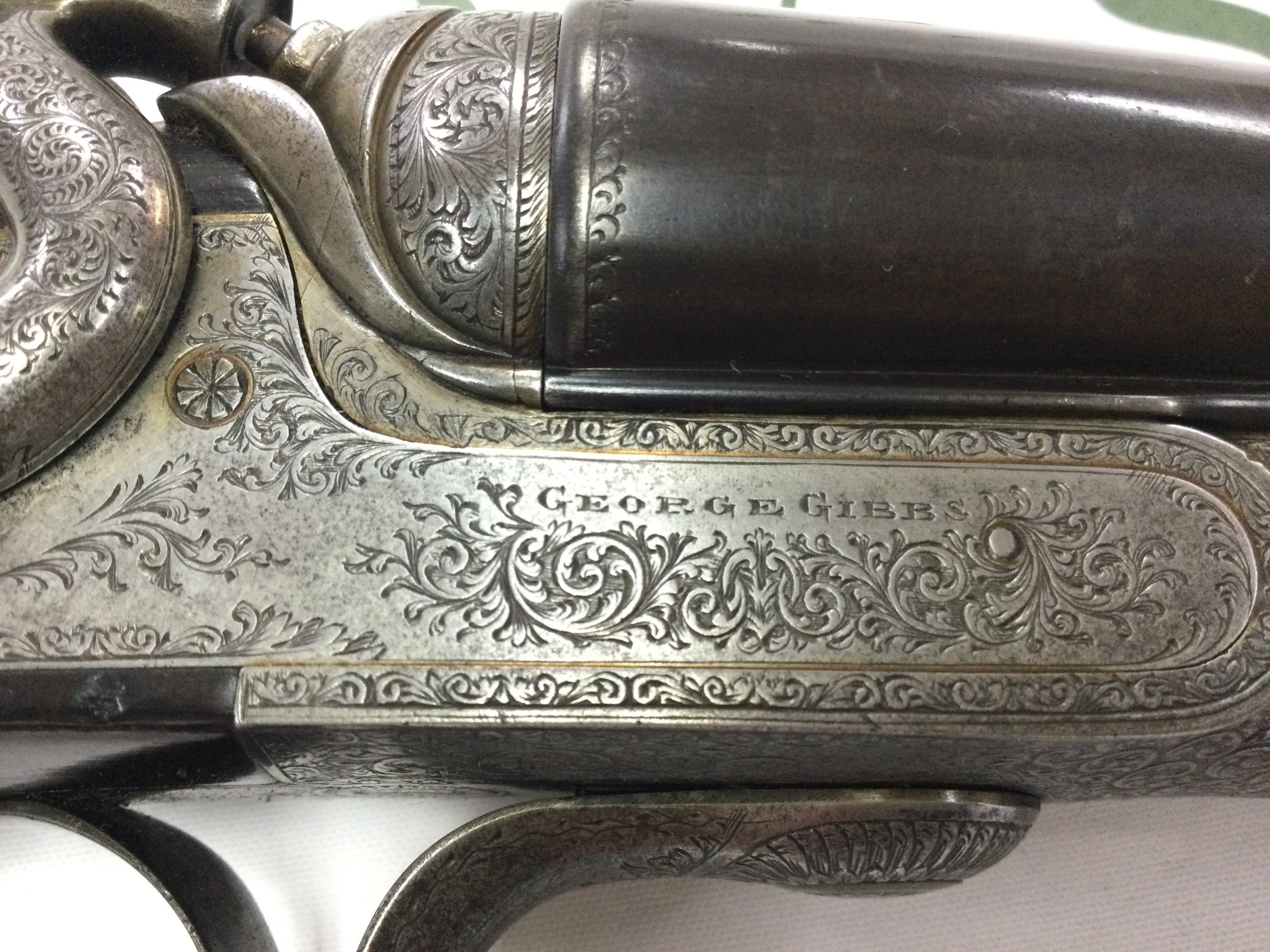A fine example of a 12 gauge side by side hammer shotgun by George Gibbs. Features nice detailed scroll engraving to side and a walnut stock. 28inch barrel and 44.5 inches overall. Serial number 6261. PLEASE NOTE THAT A SHOTGUN LICENSE IS REQUIRED TO PURCHASE THIS ITEM. COLLECTION AND VIEWING BY APPOINTMENT ONLY.