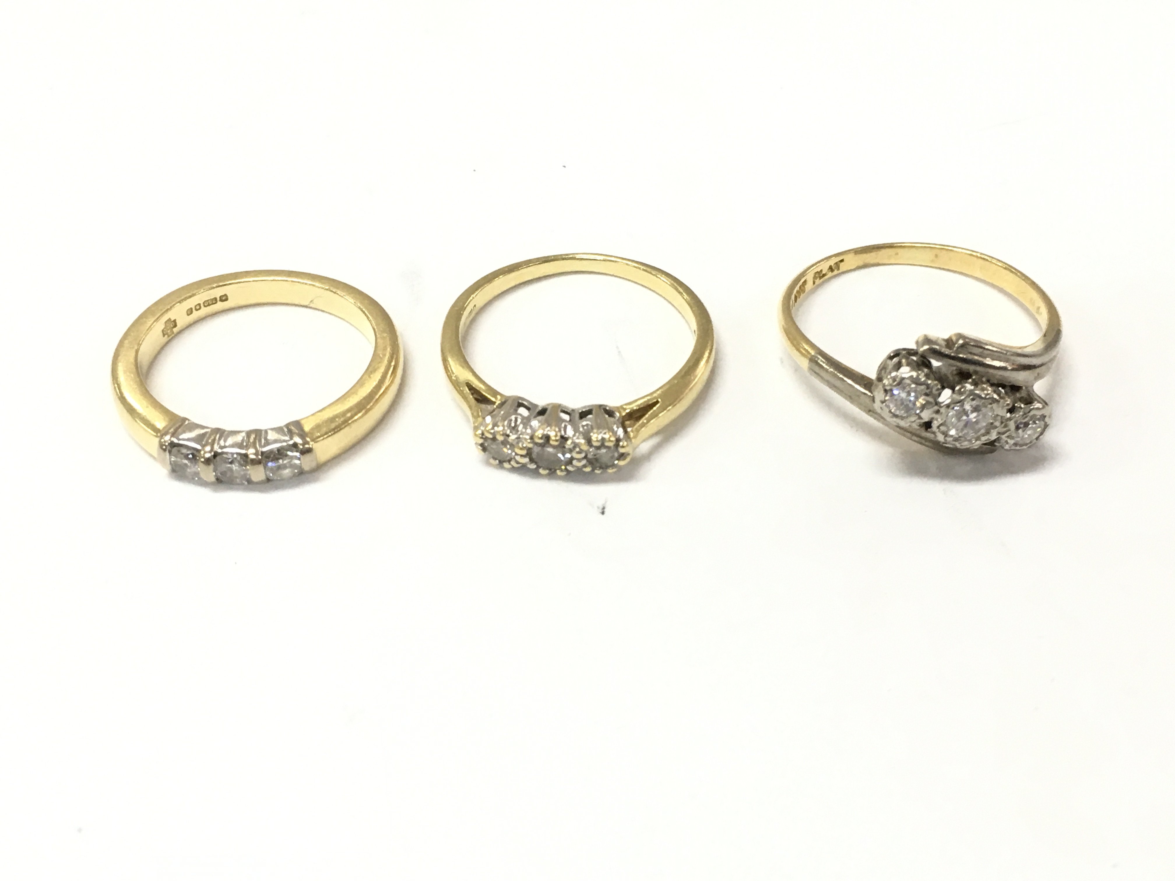 Three 18ct gold 3 stone diamond rings. Sizes K N and O. 11.16g