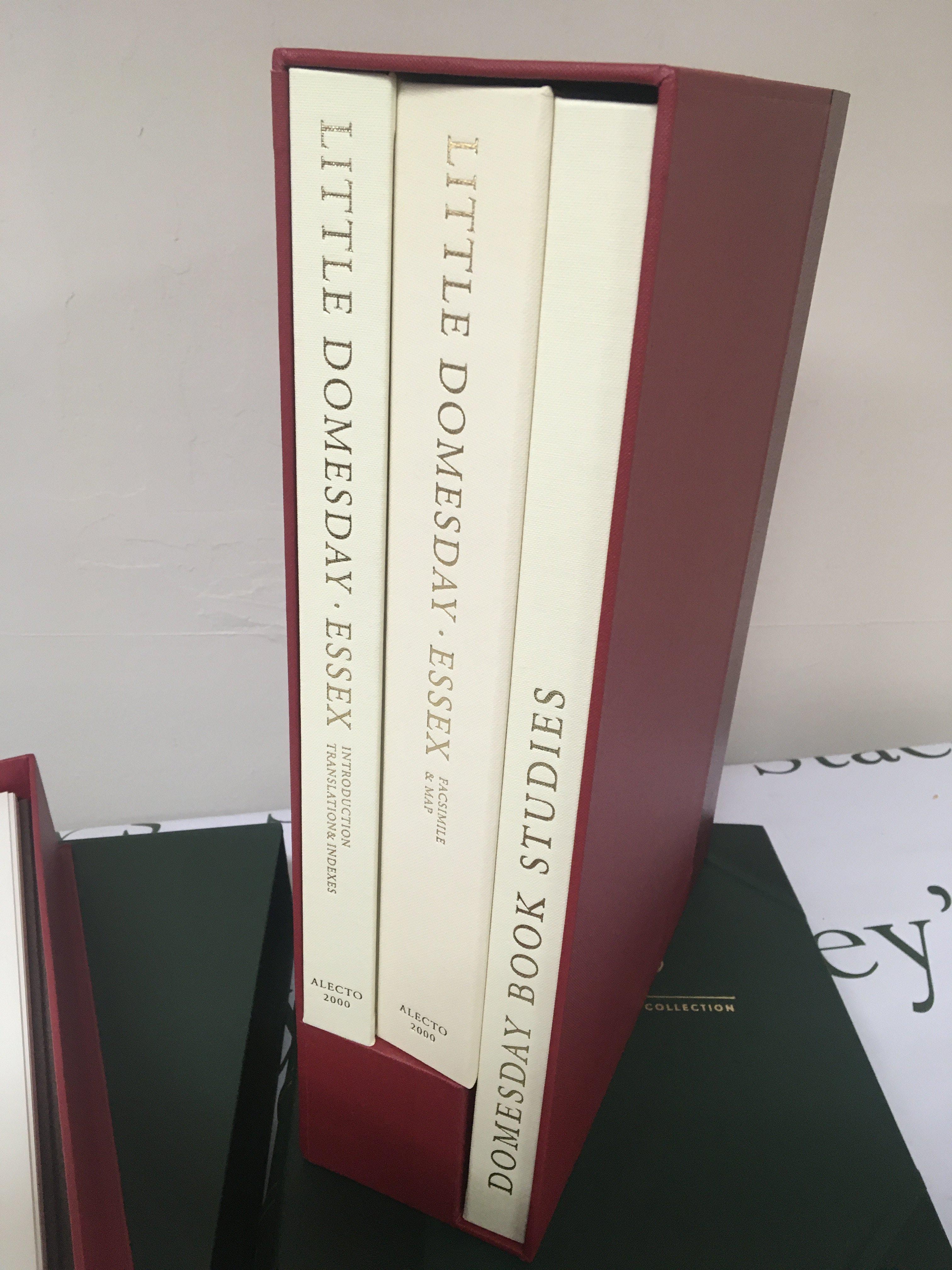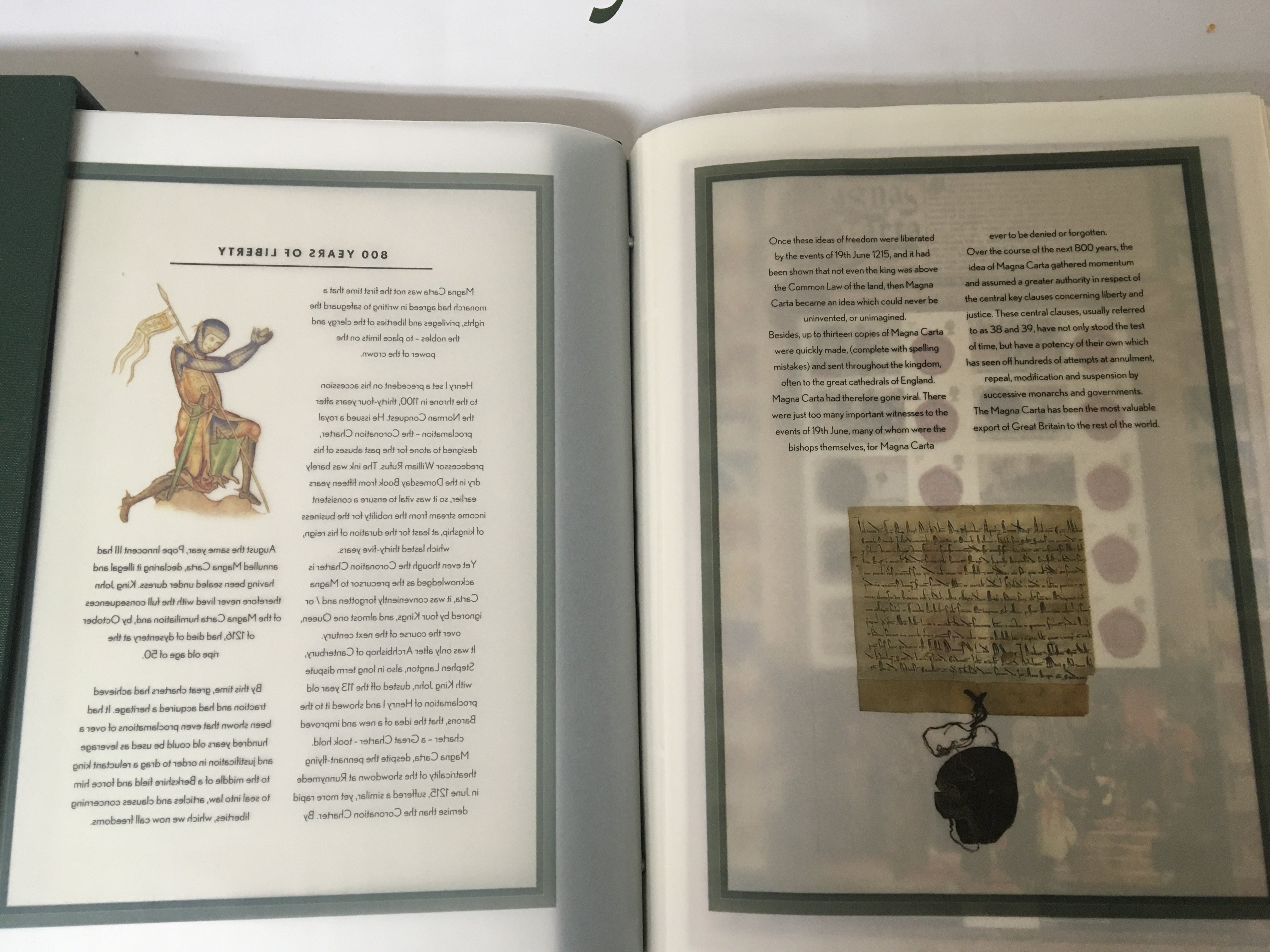 A 2015 Album of Stamps and associated ephemera The 800th Anniversary of the Magna Carter. Probably the first time This Particular album has been available on the market. The album presented to Her Majesty The Queen from the Magna Carter Committee and Stanley Gibbons this album number 3 of just ten produced. In a green half leather binder with outer box cover, sold with quality Alecto boxed Cambridge Doomesday and Essex books boxed in excellent condition.