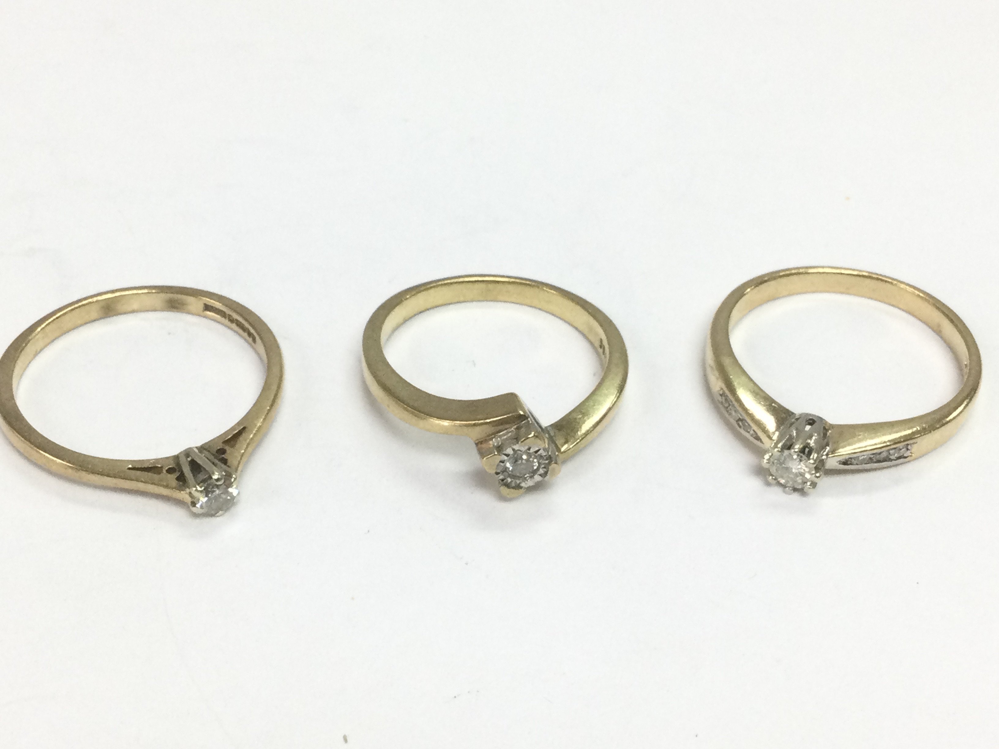 Three 9ct gold solitaire rings, approx sizes O, M and P. Total approx 7g. Shipping category A.