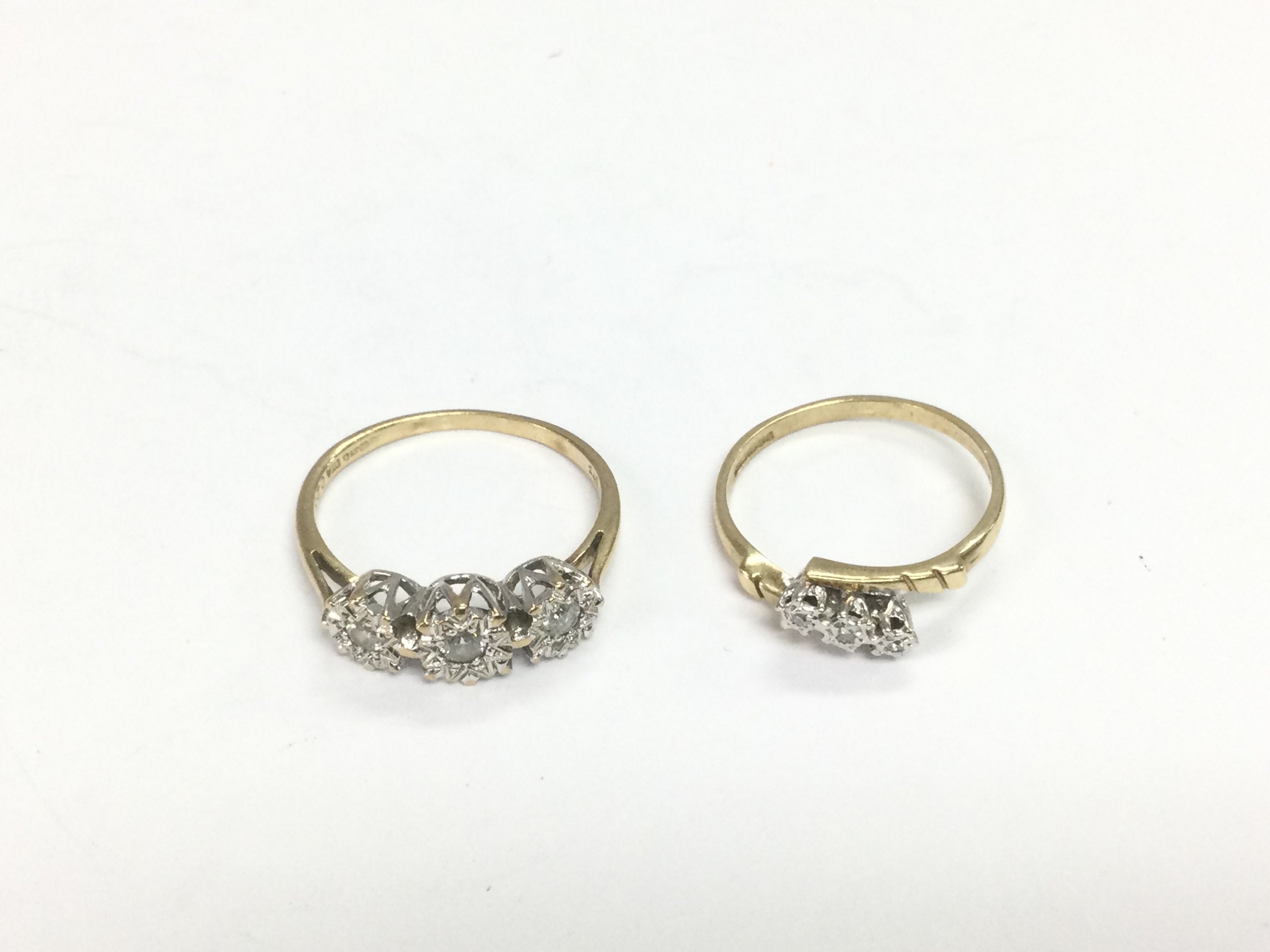 Two 9ct gold three stone diamond rings, approx sizes O and M. Total 3.9g. Shipping category A.