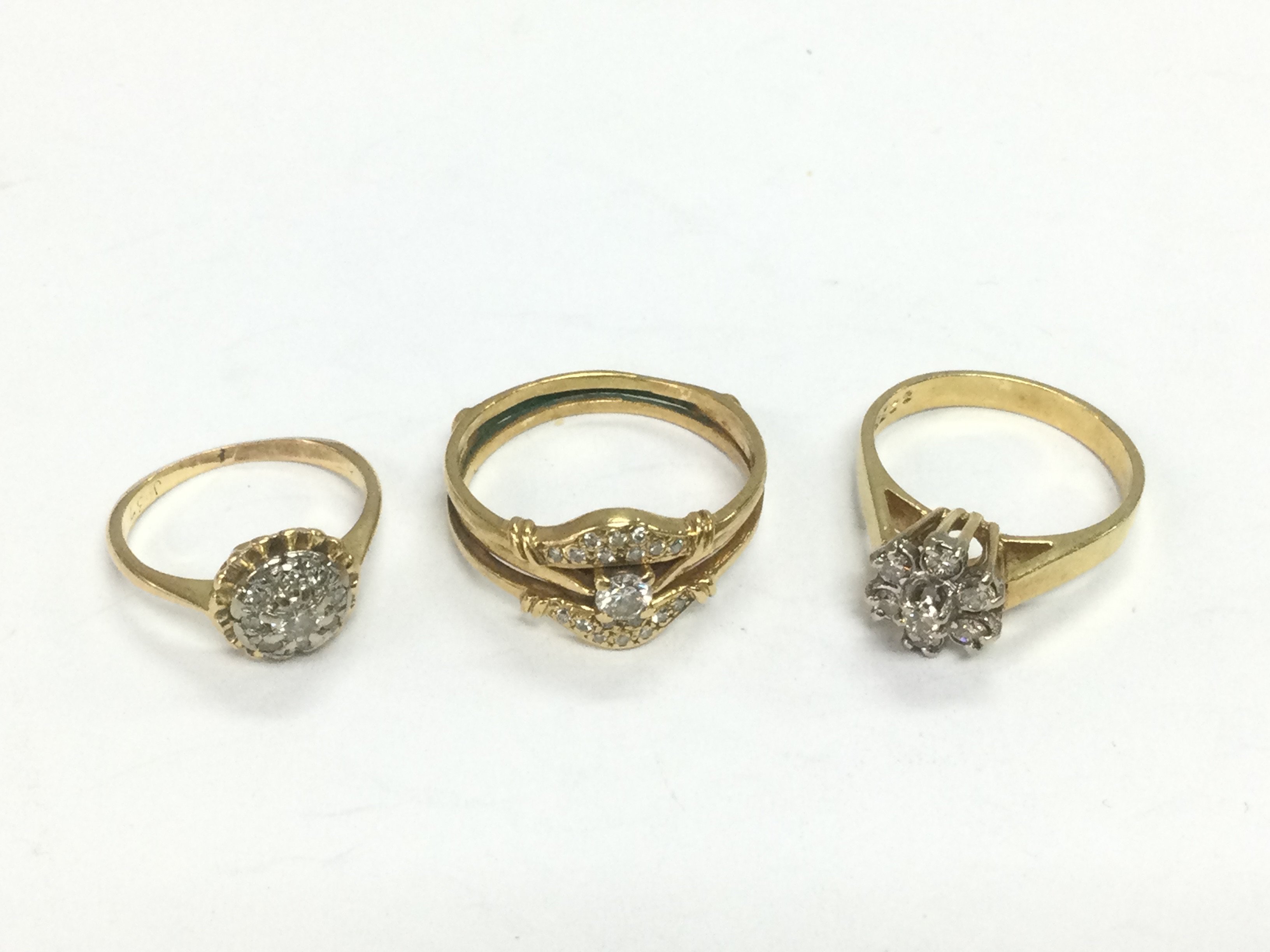 Three unmarked gold diamond cluster rings, approx sizes L, H and Q. Total approx 11.5g. Shipping category A.