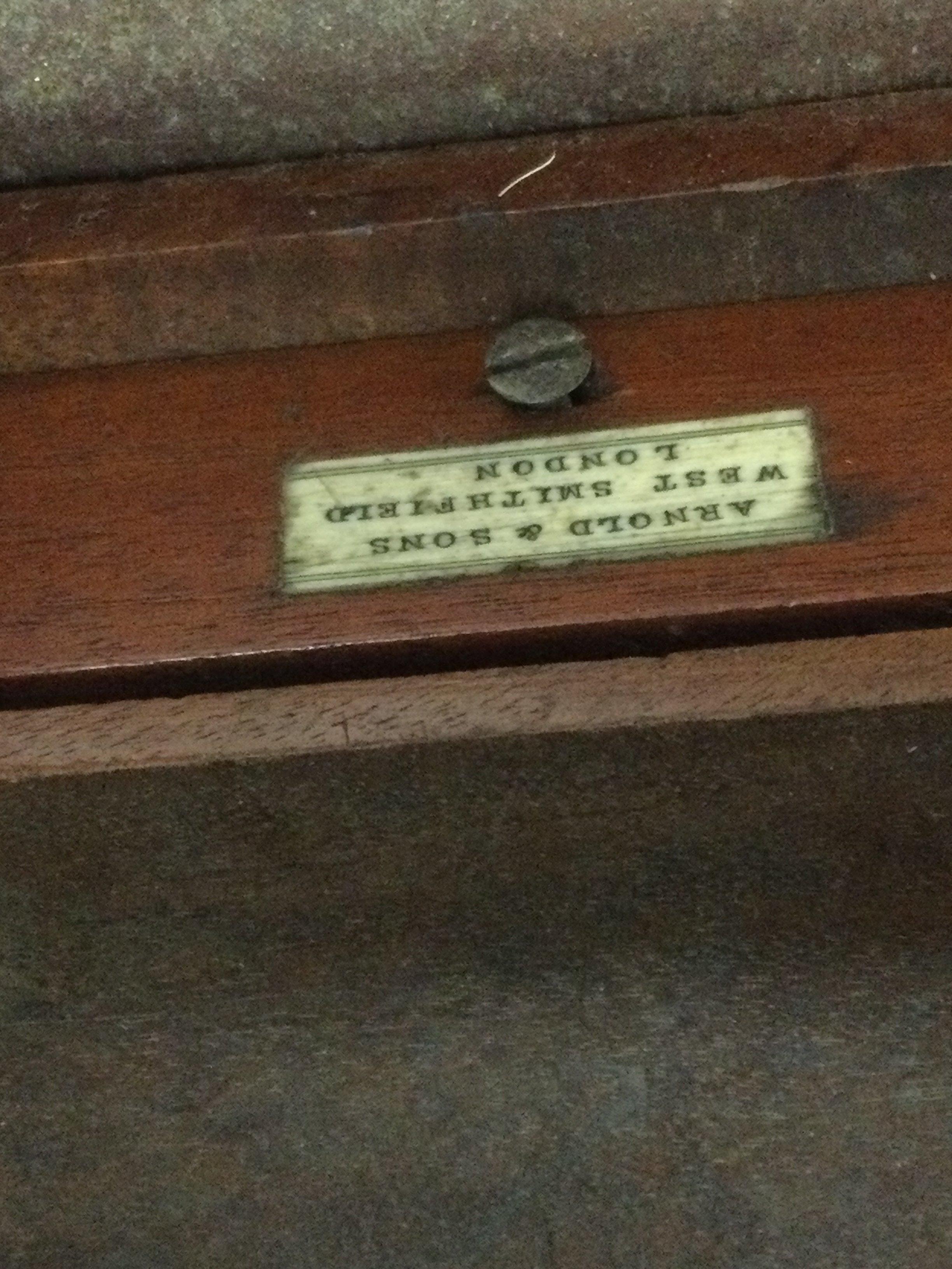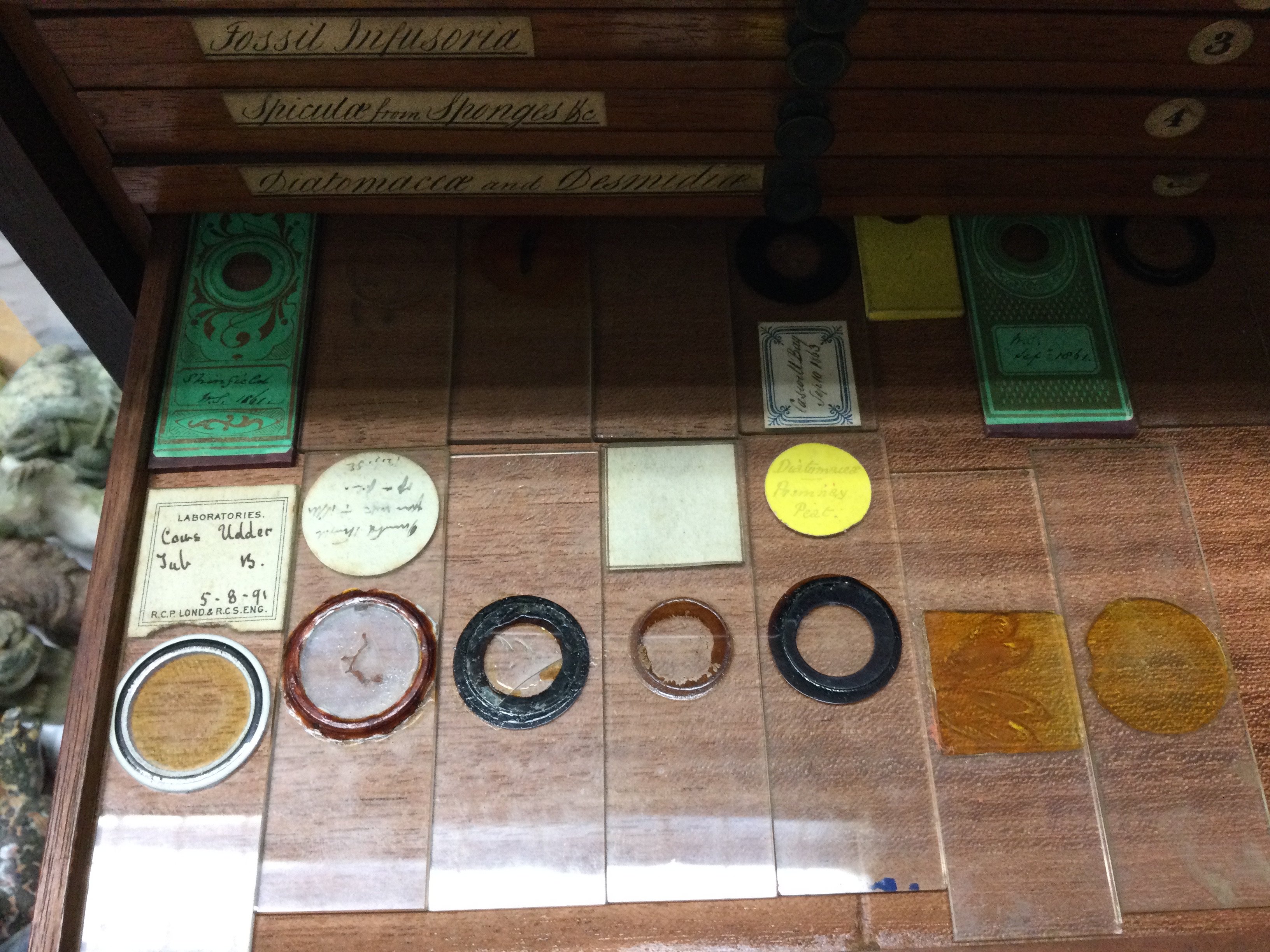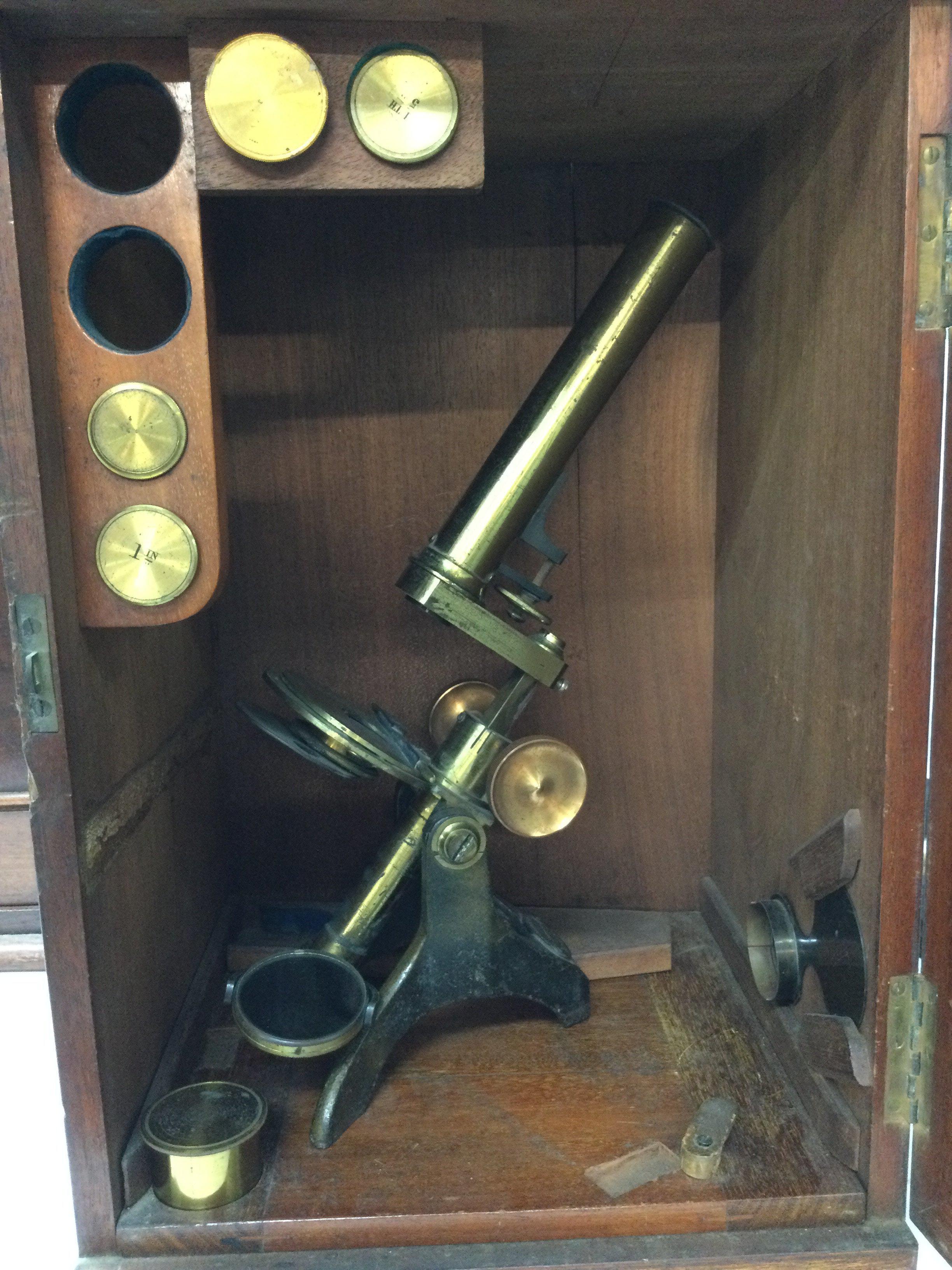 A cased brass Monocular together with a mahogany cabinet fitted with numerous specimen slides one other brass Monocular and a smaller case of slides.