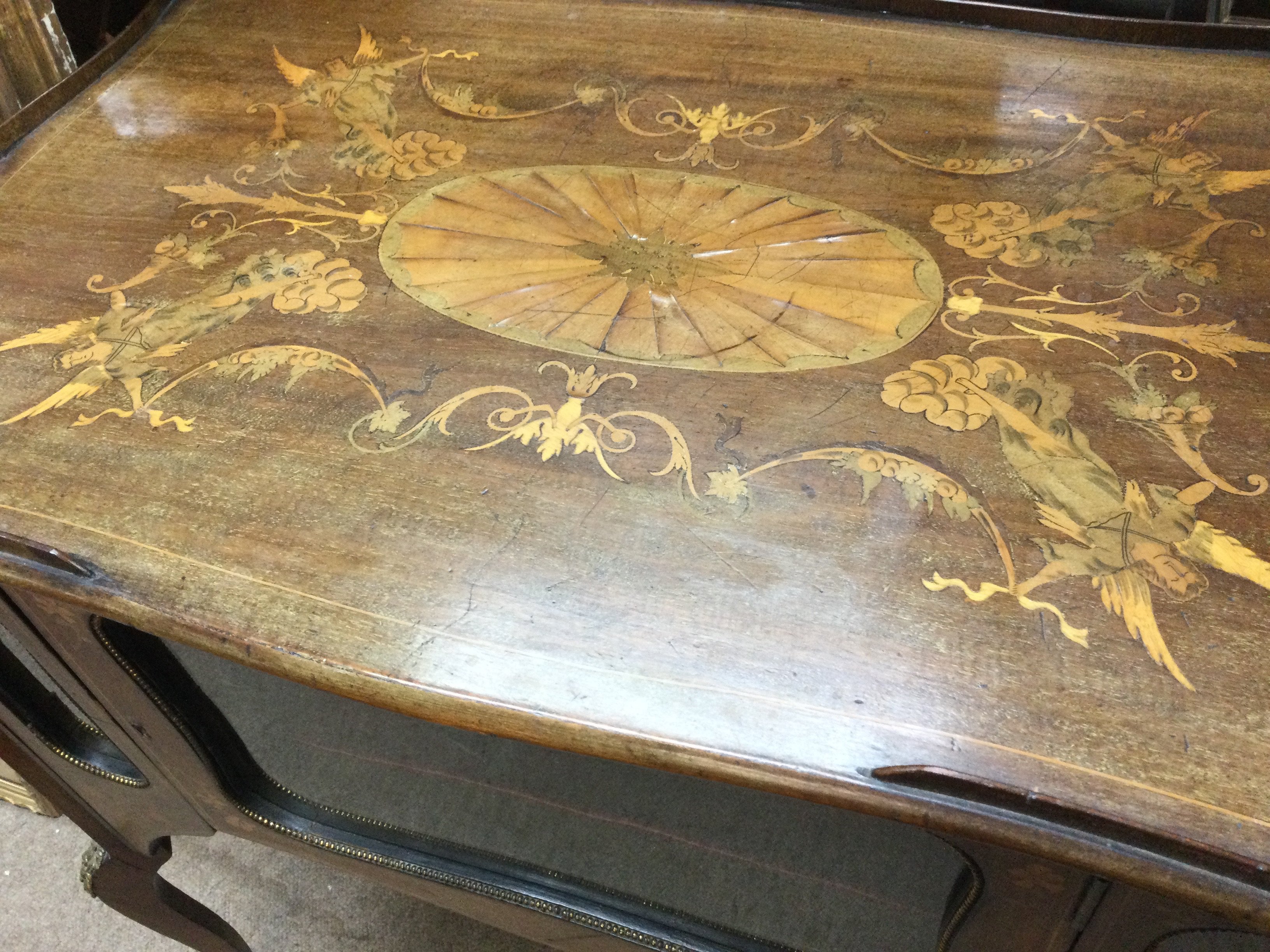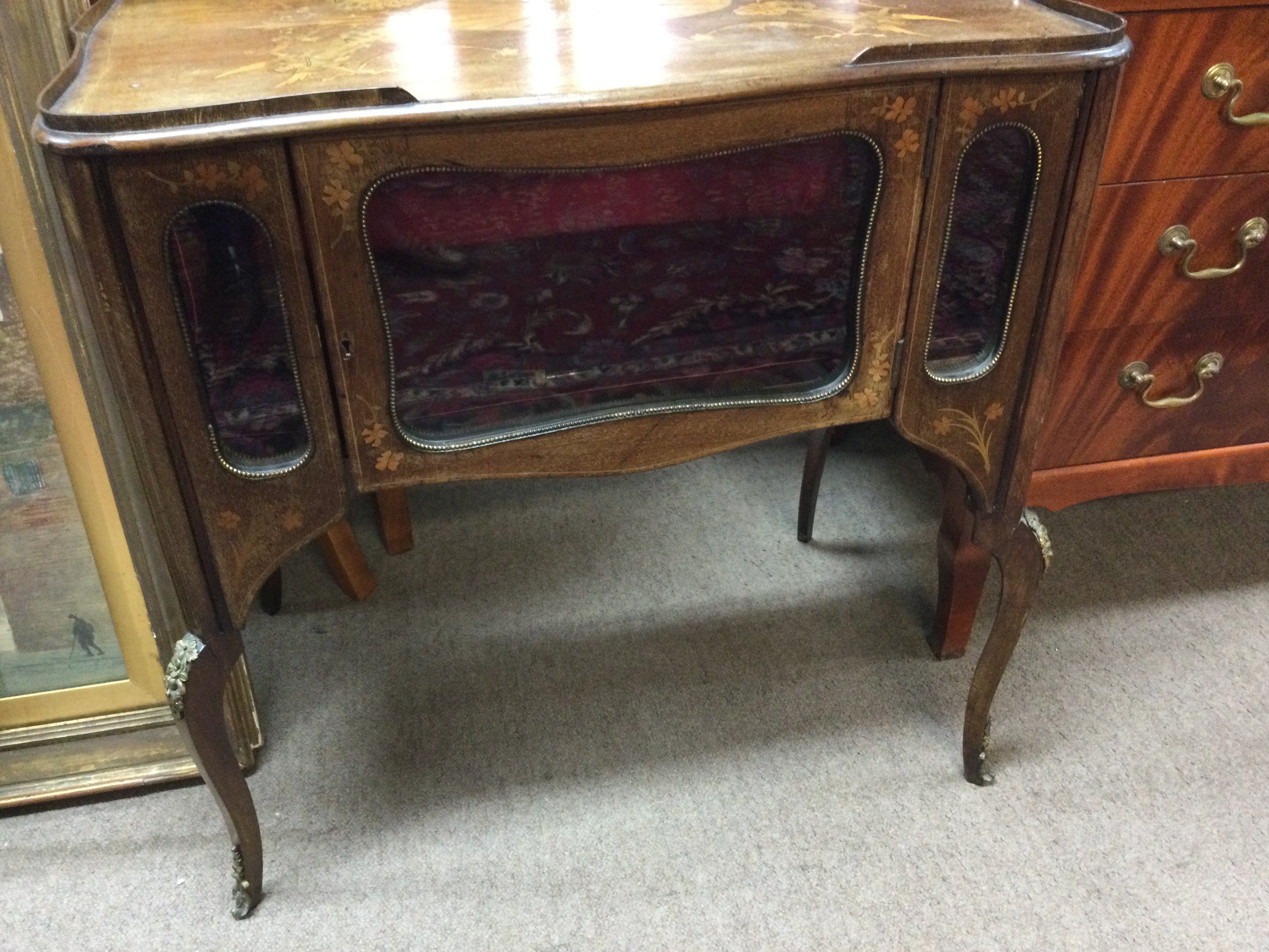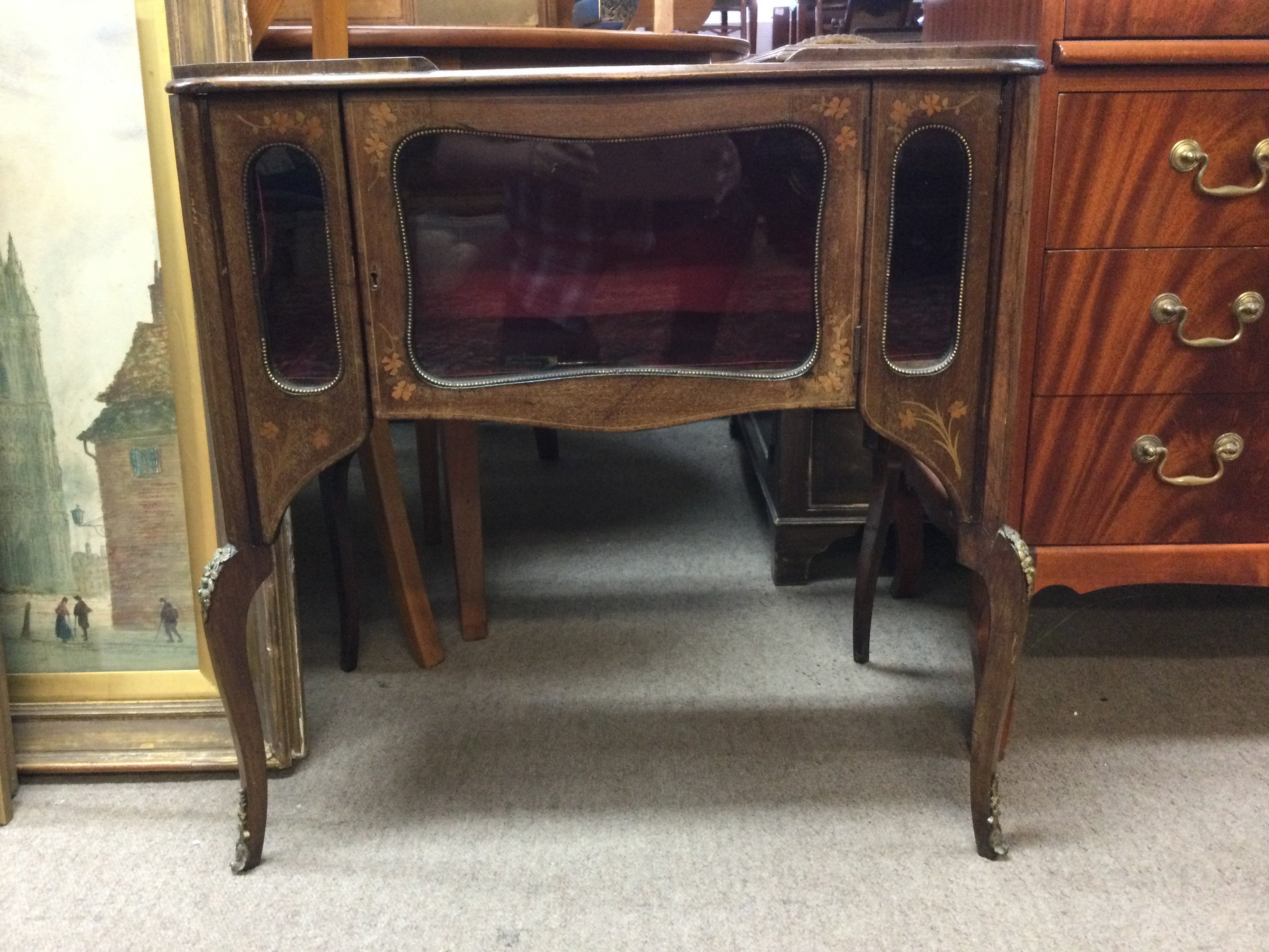 A small Edwardian inlaid display cabinet the raised gallery above a single glazed door The cabriole legs with gilt mounts .