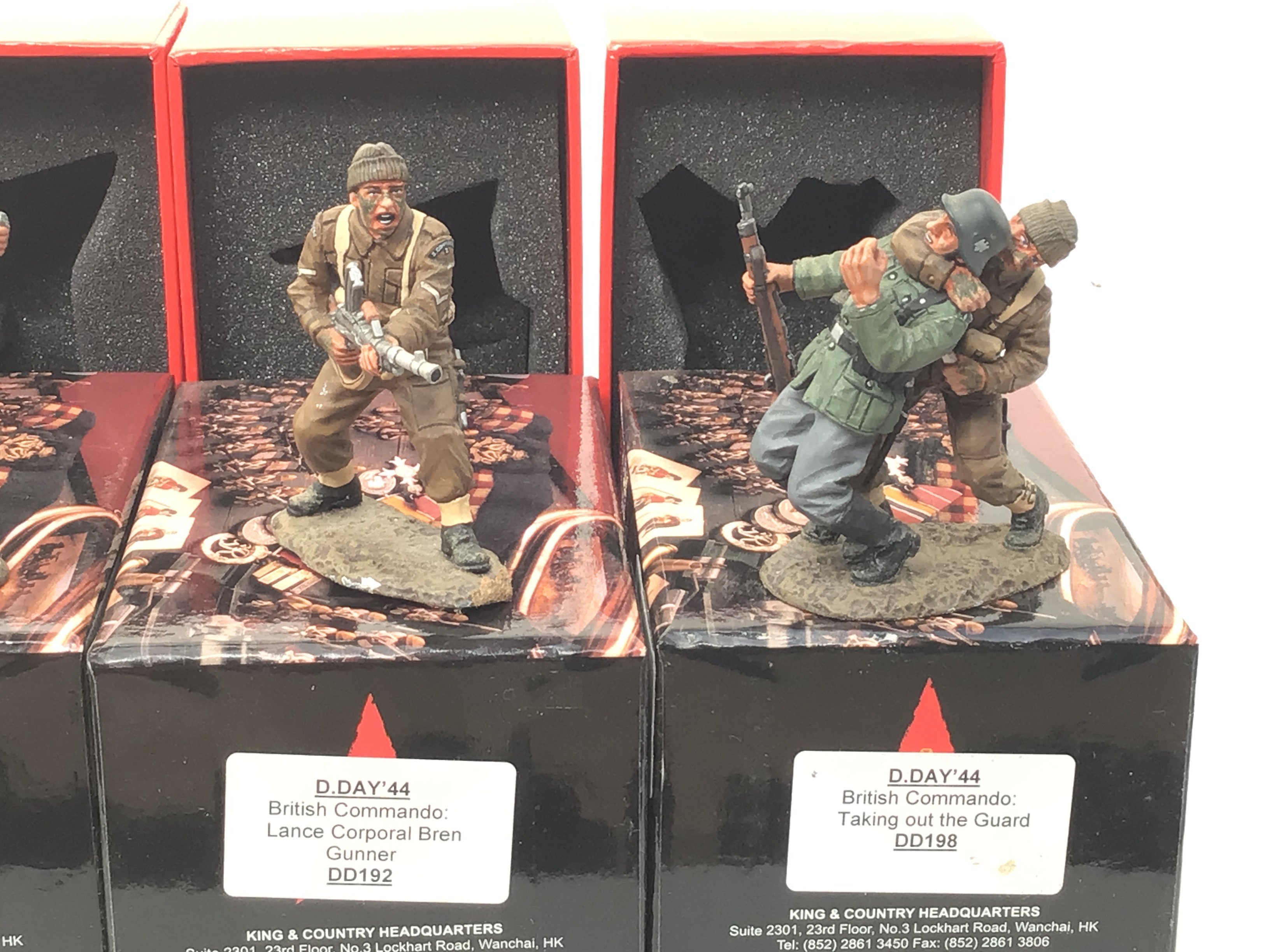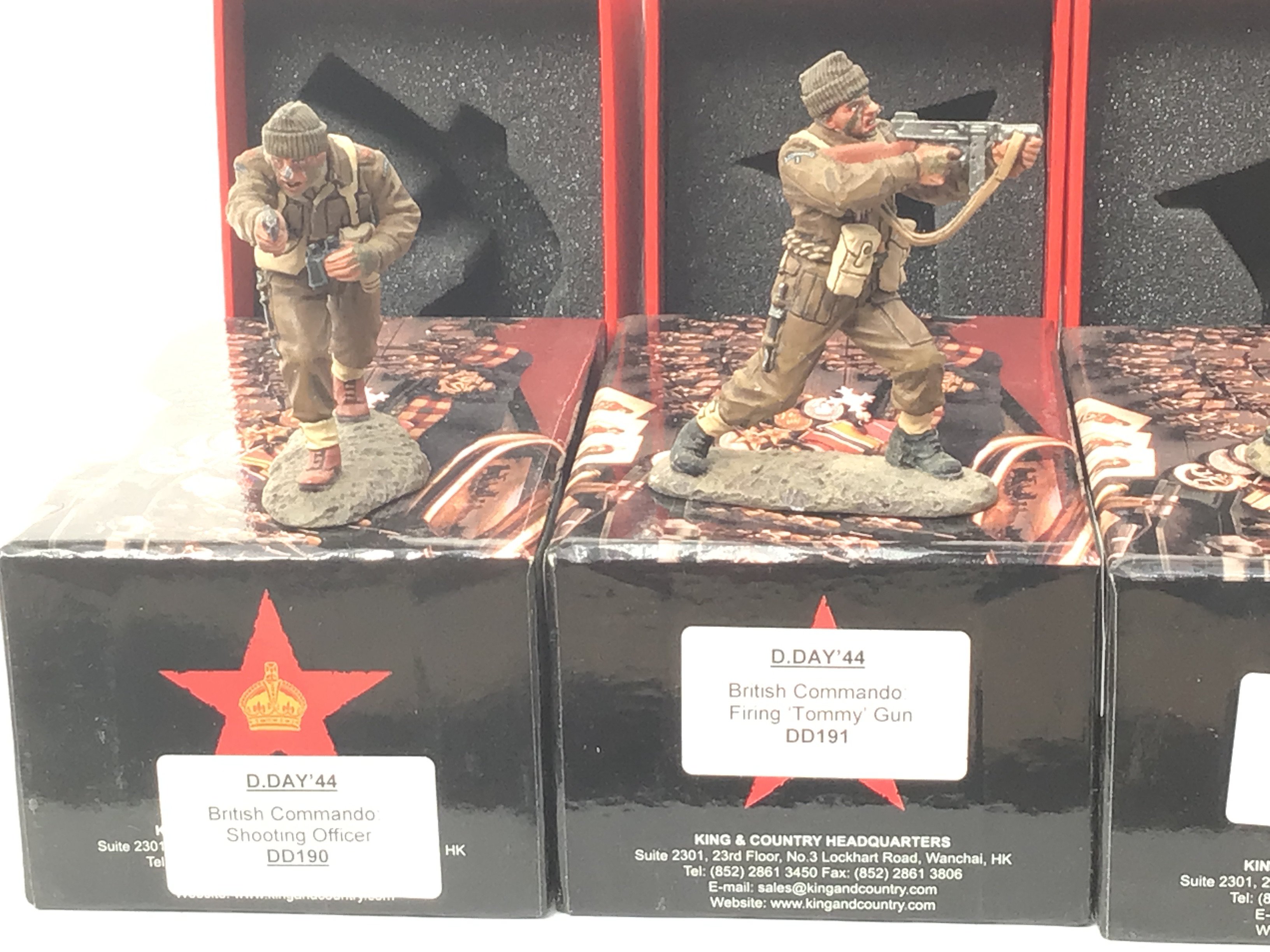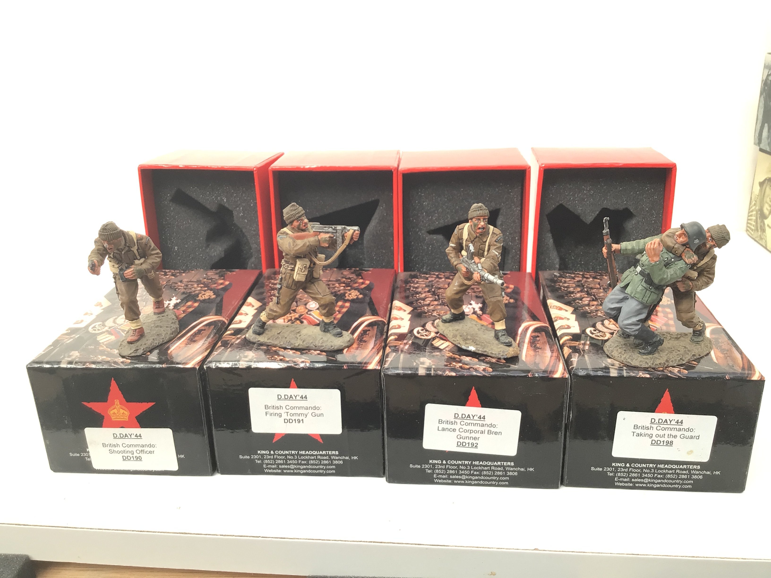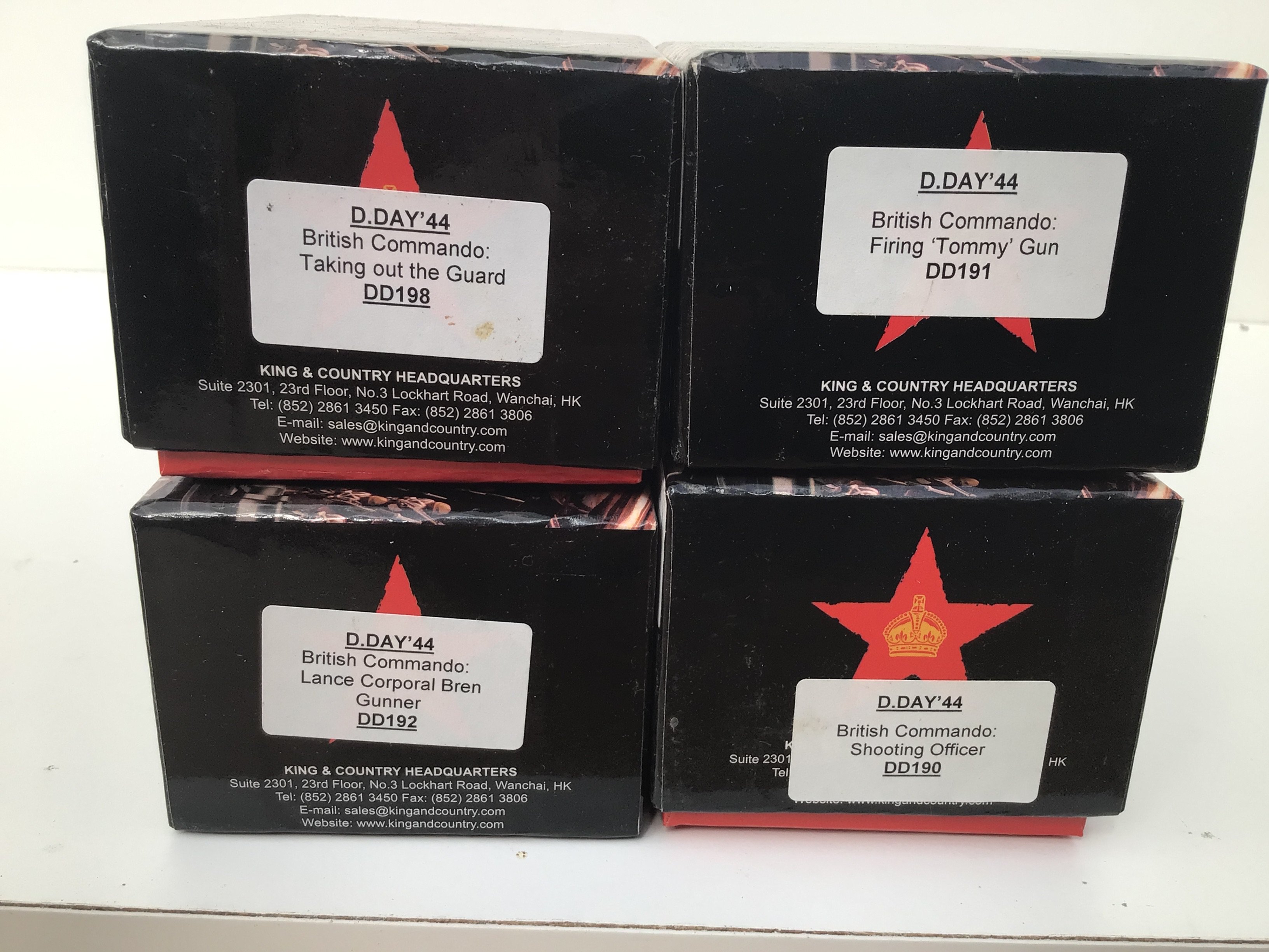 4x boxed King and Country Minature Military models from the D Day 1944 series. Featuring DD190 British Commando shooting officer..DD191 British Commando firing Tommy gun..DD192 British Commando Lance Corporal Bren Gunner..DD198 British Commando Taking out the Guard. No reserve