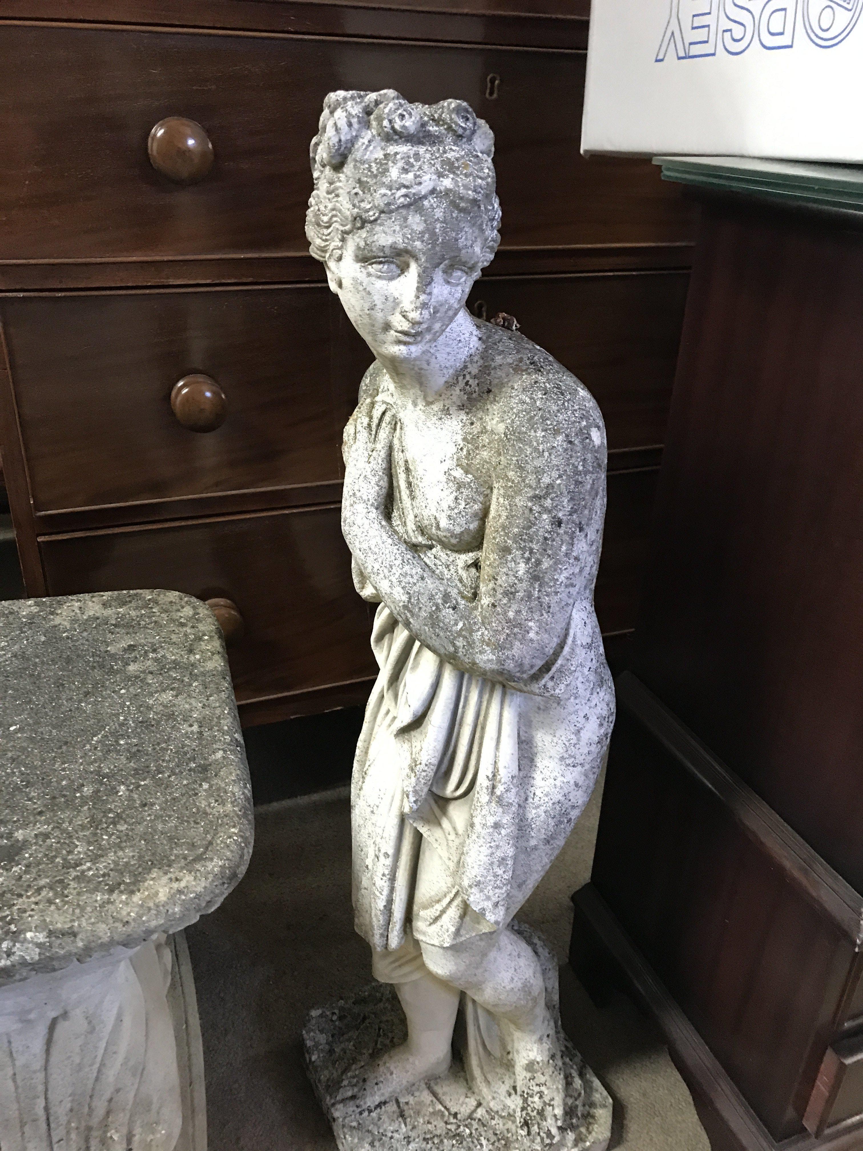 A composition classical garden ornament bench (122cm wide 40cm tall) bird Bath (54cm tall) and woman figure , (80cm tall).