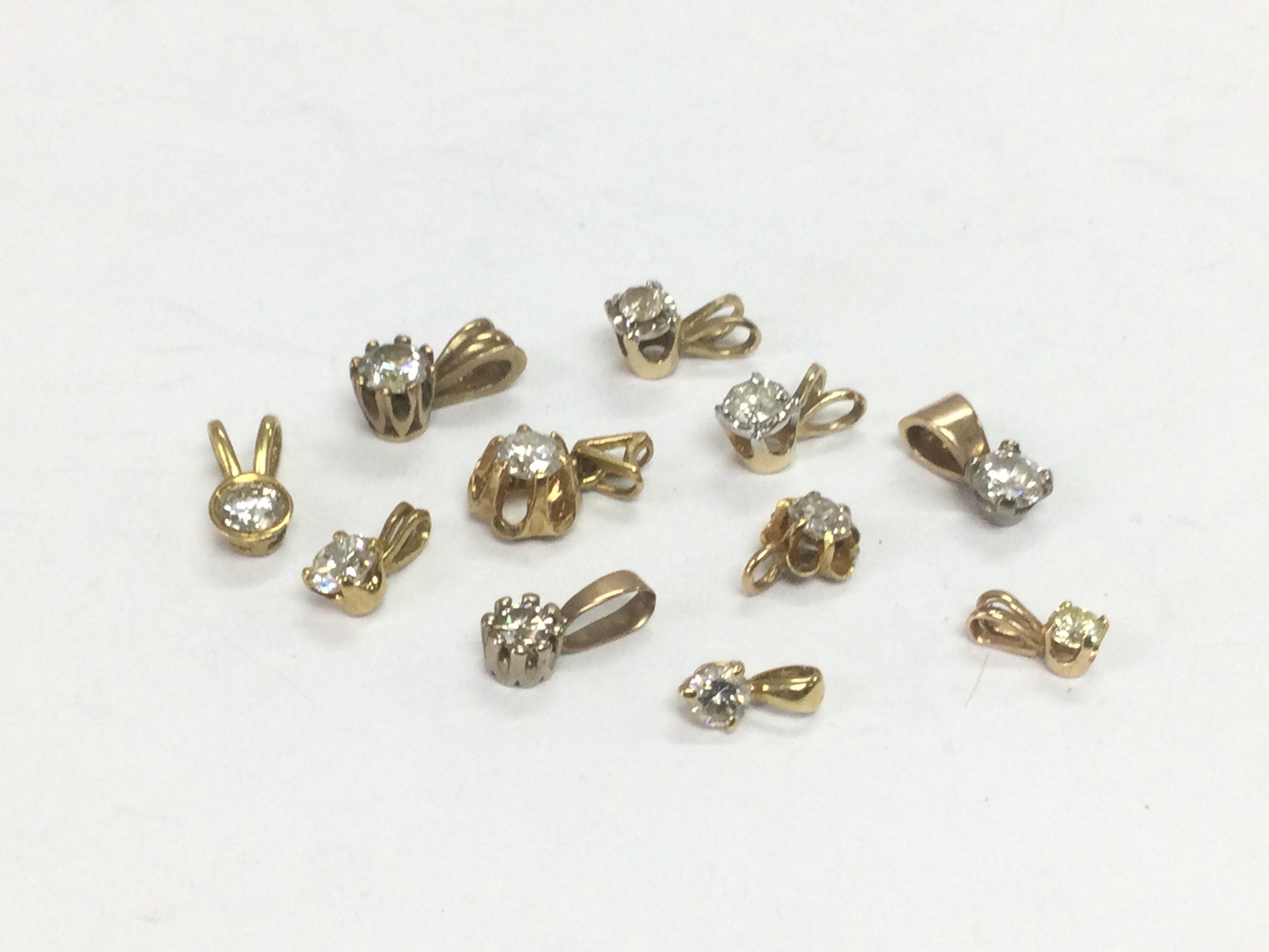 Eleven gold solitaire diamond pendants, total approx 5g. Shipping category A.