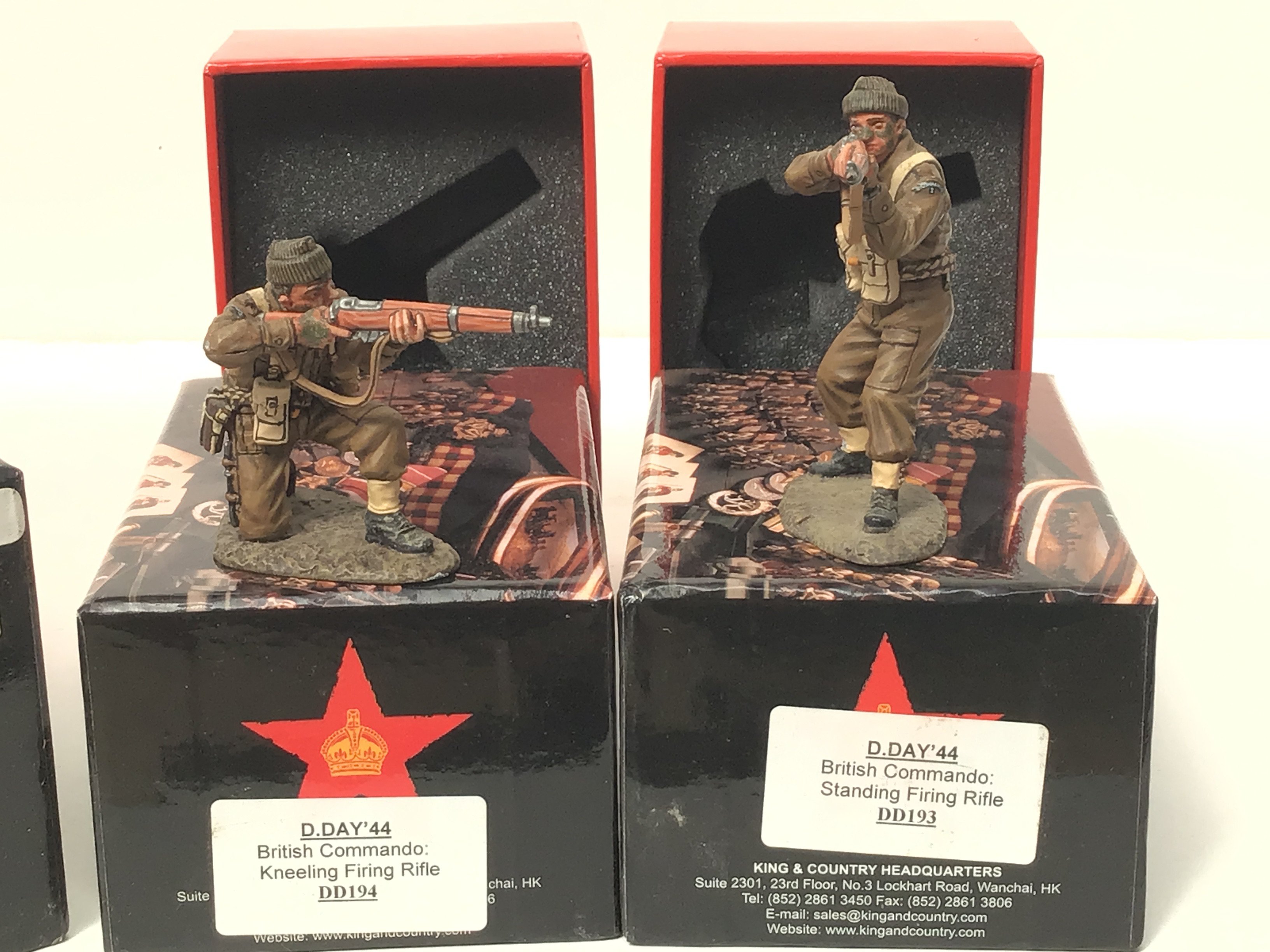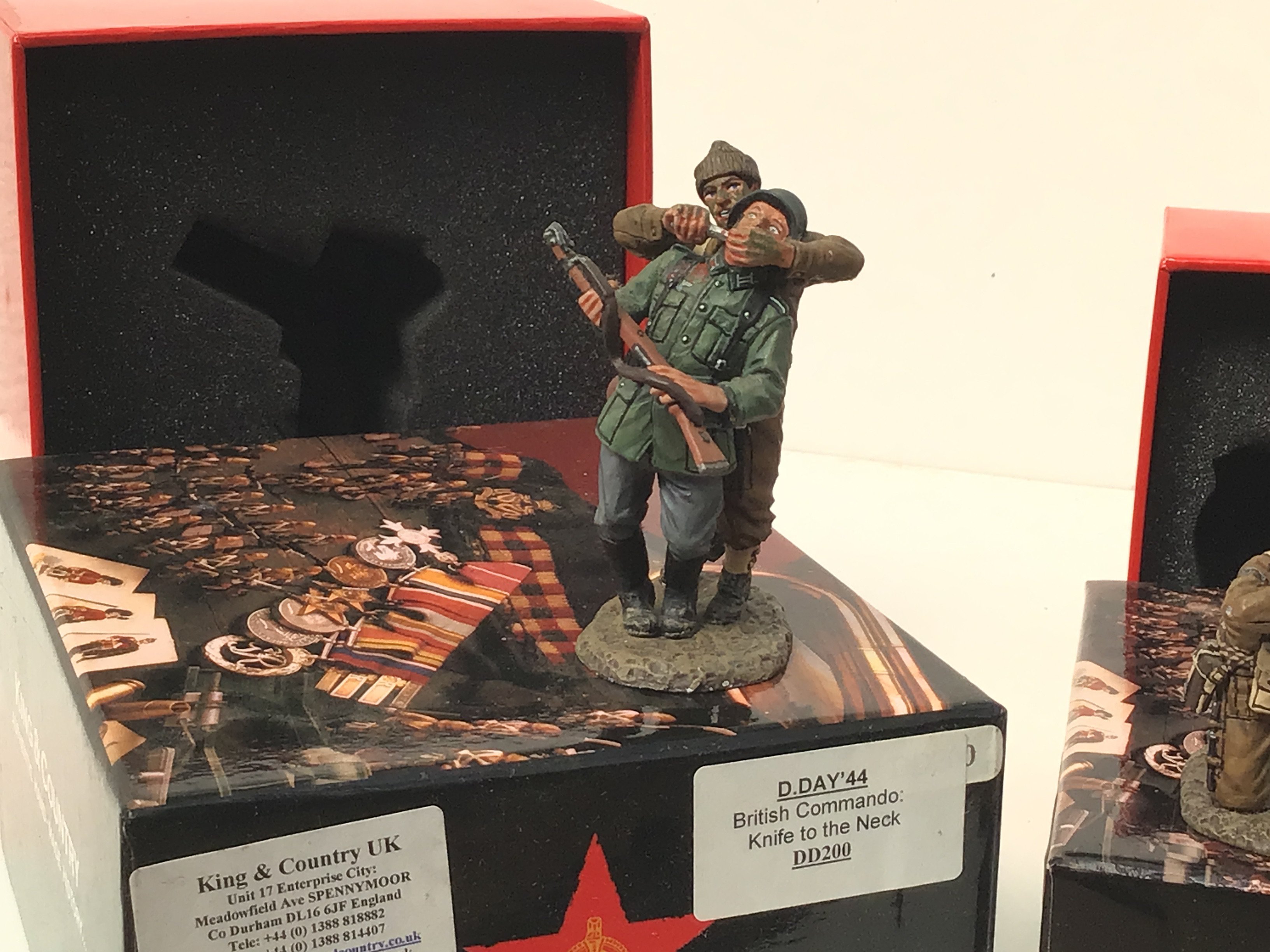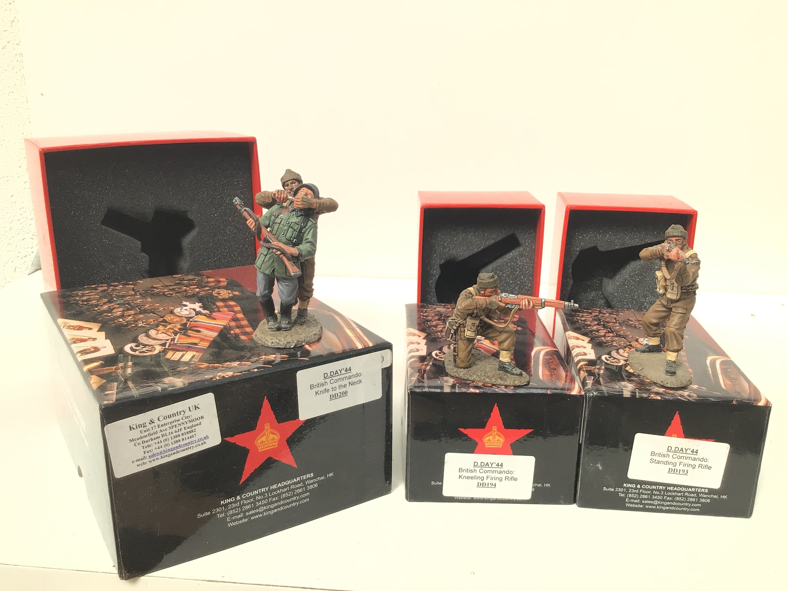 3 x boxed King and Country Minature Military models from the D Day 1944 Commando series. Featuring DD193. BC Standing firing rifle..DD 194 BC kneeling firing rifle..DD200 BC Knife to the neck. No reserve.