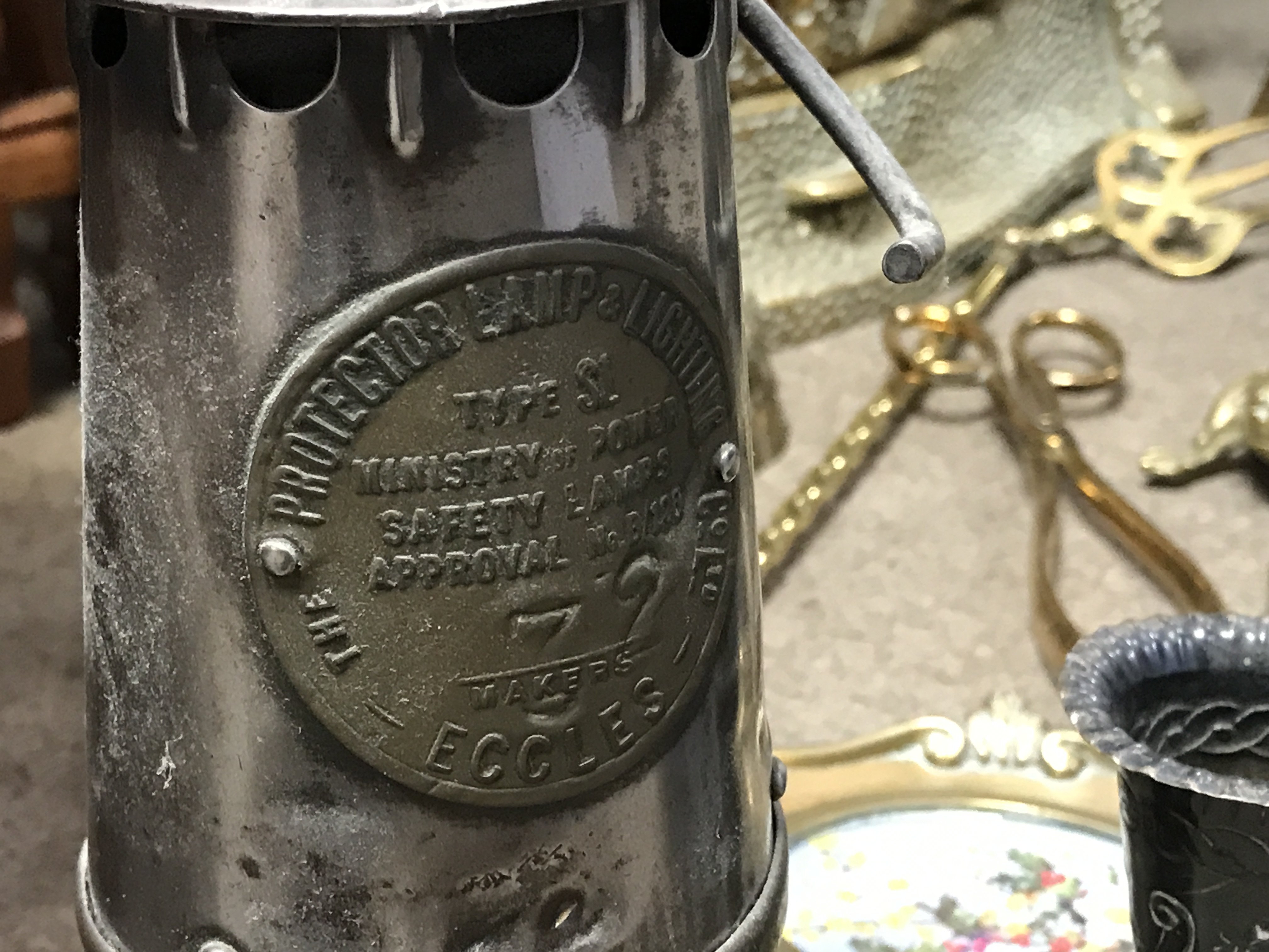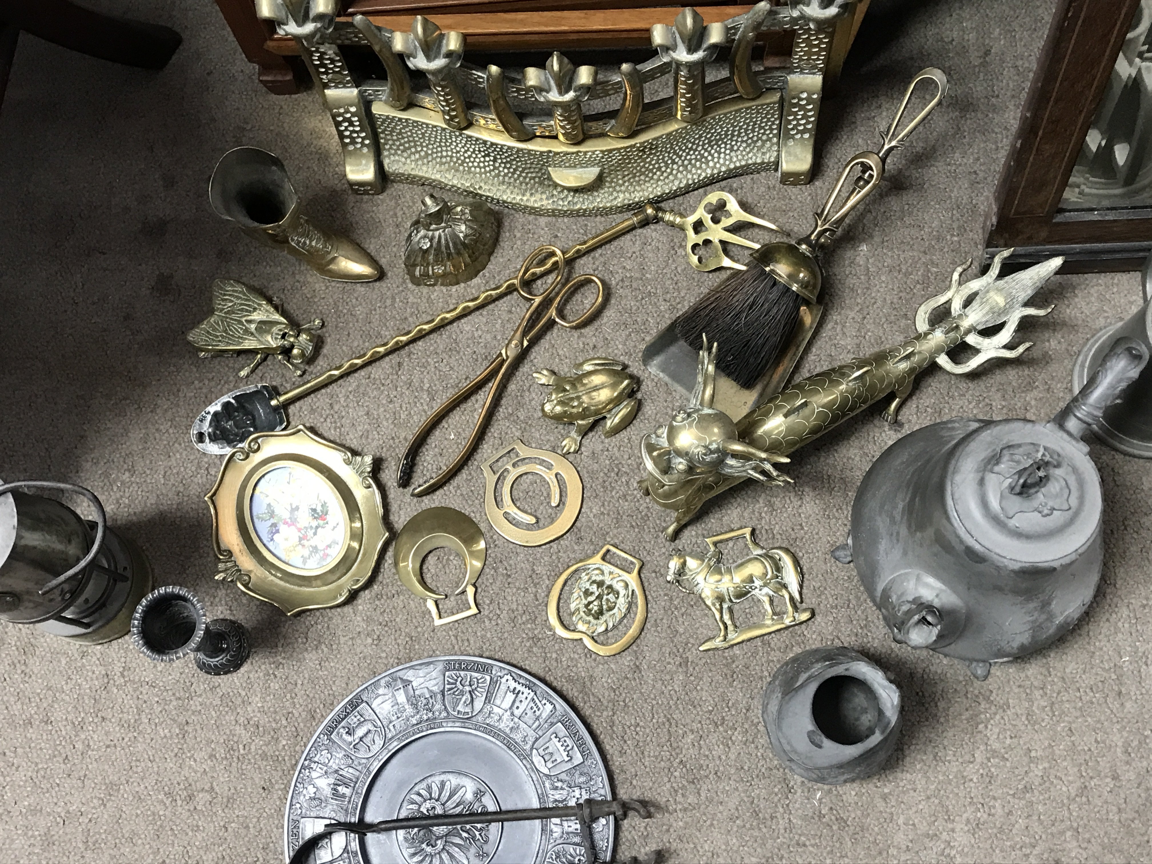A miners Lamp and brassware including a dragon figure, fireplace grate etc