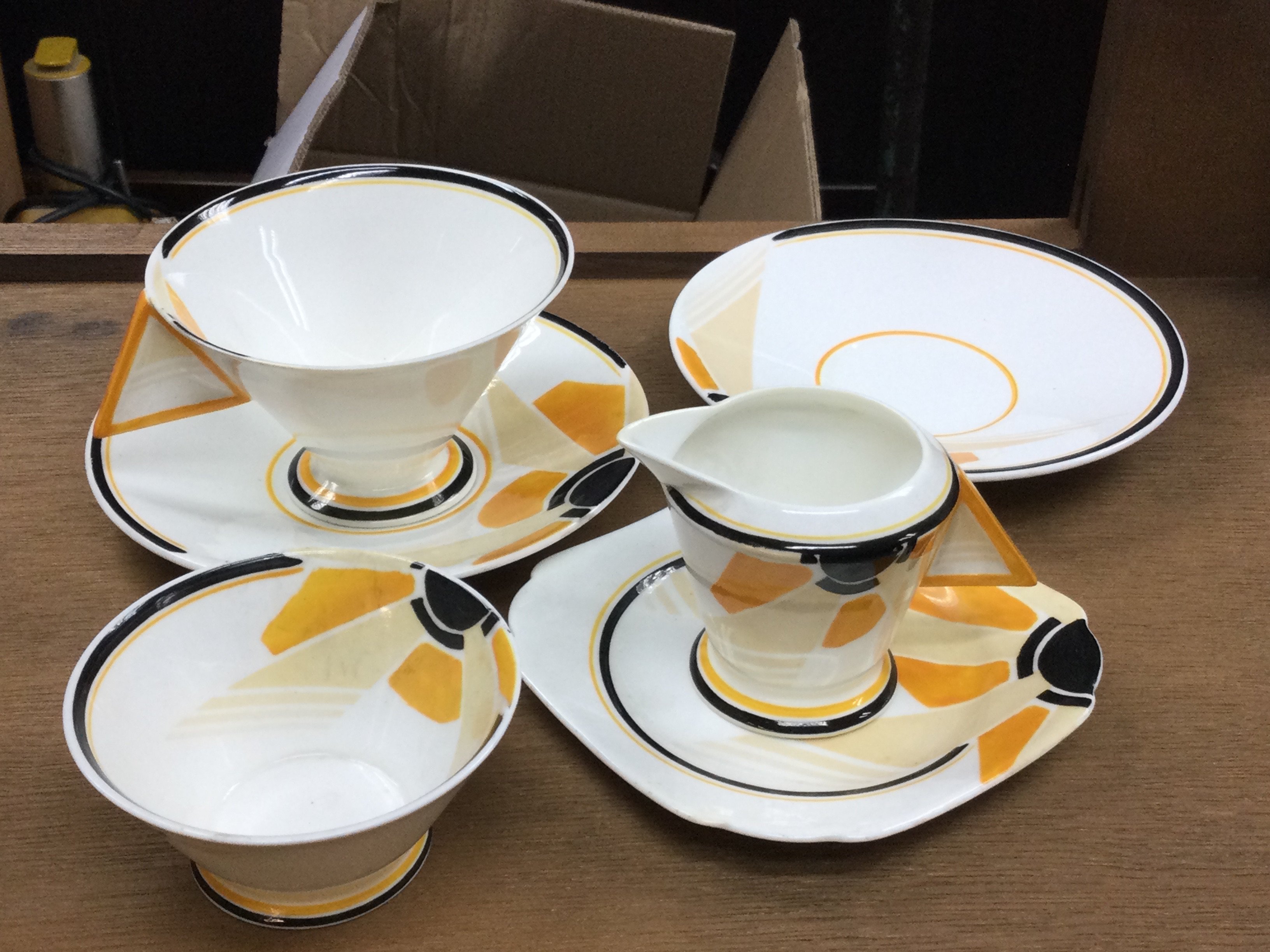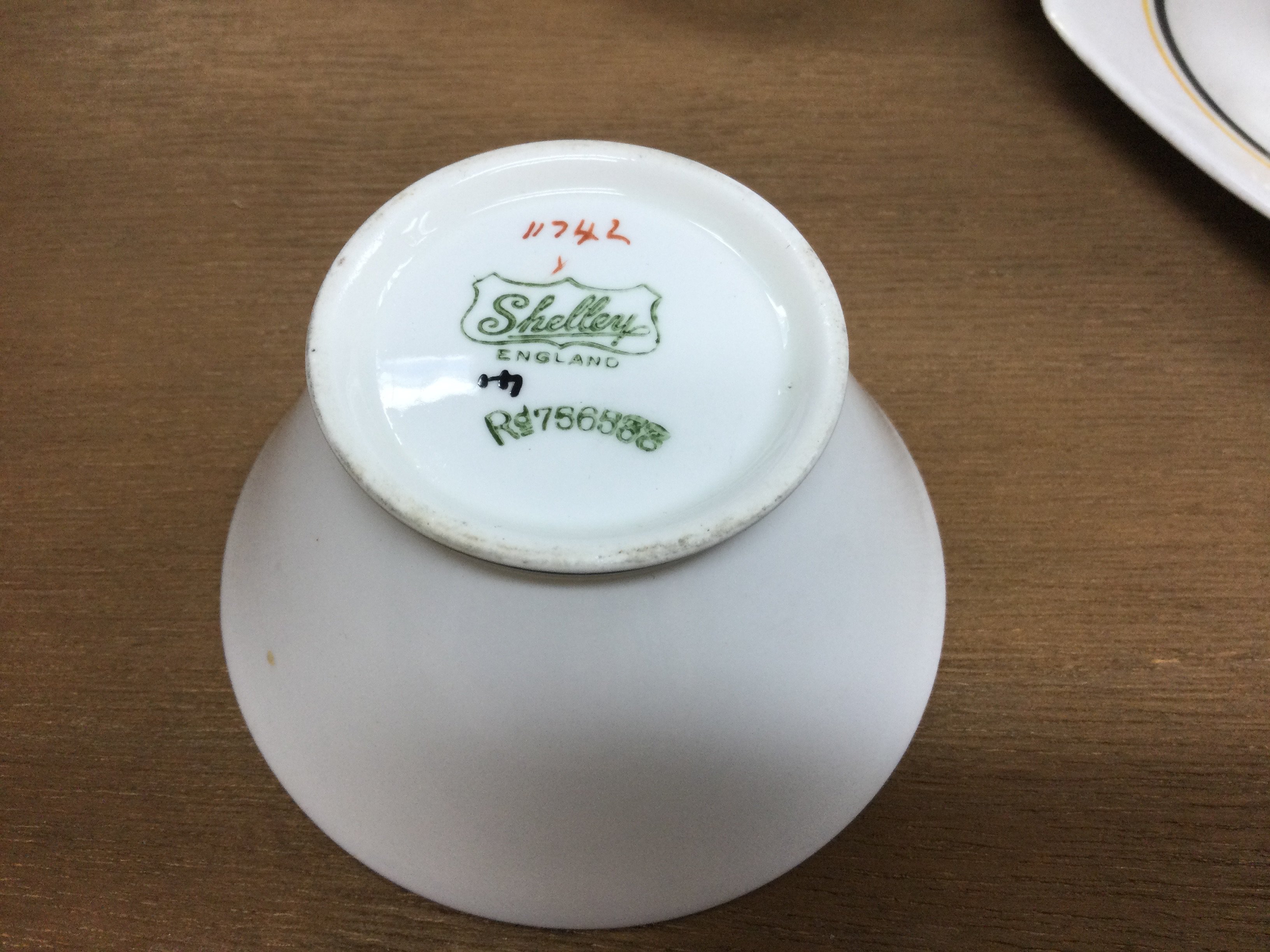 A Shelley tea cup, two saucers, sugar bowl, cream jug and side plate