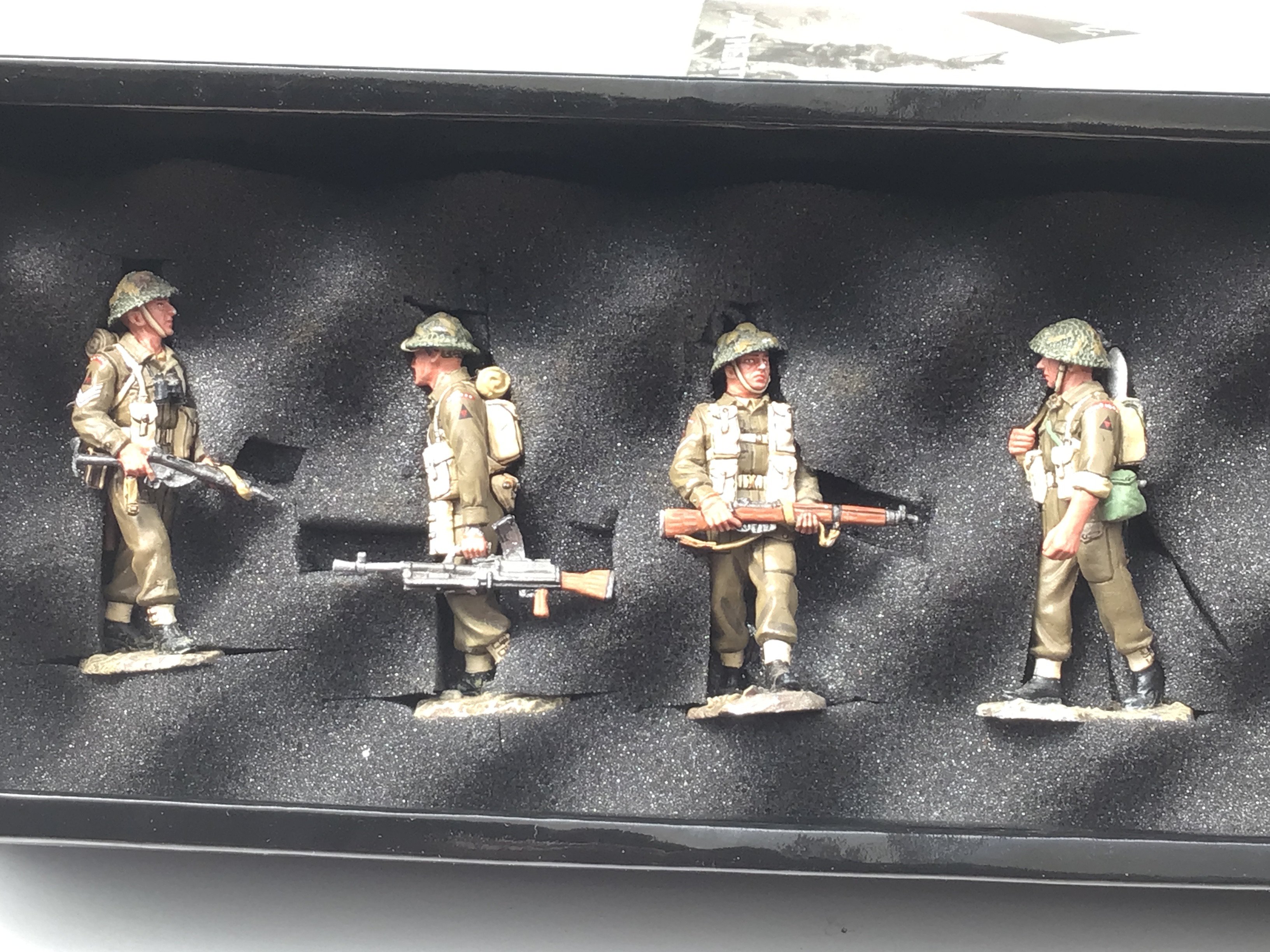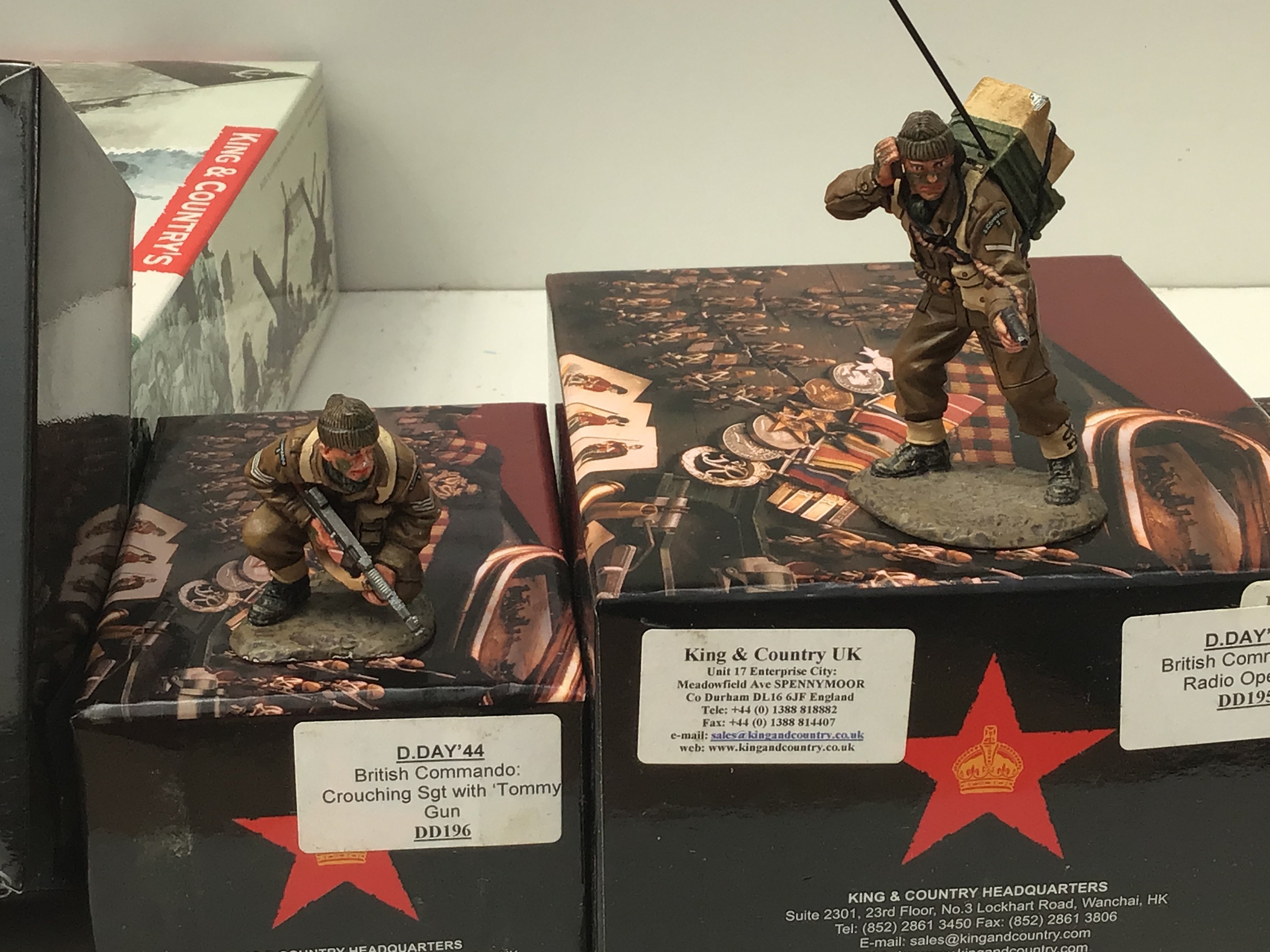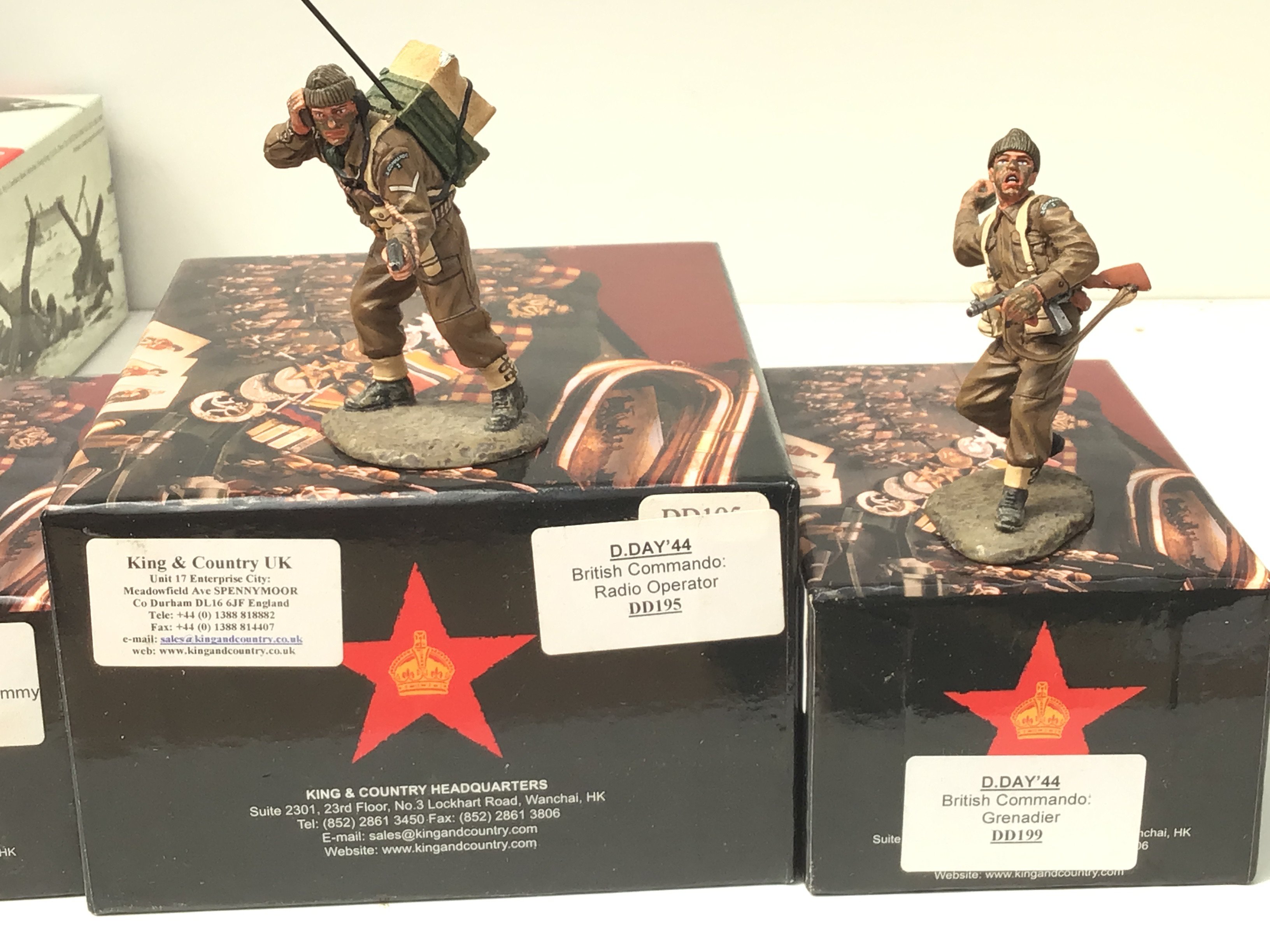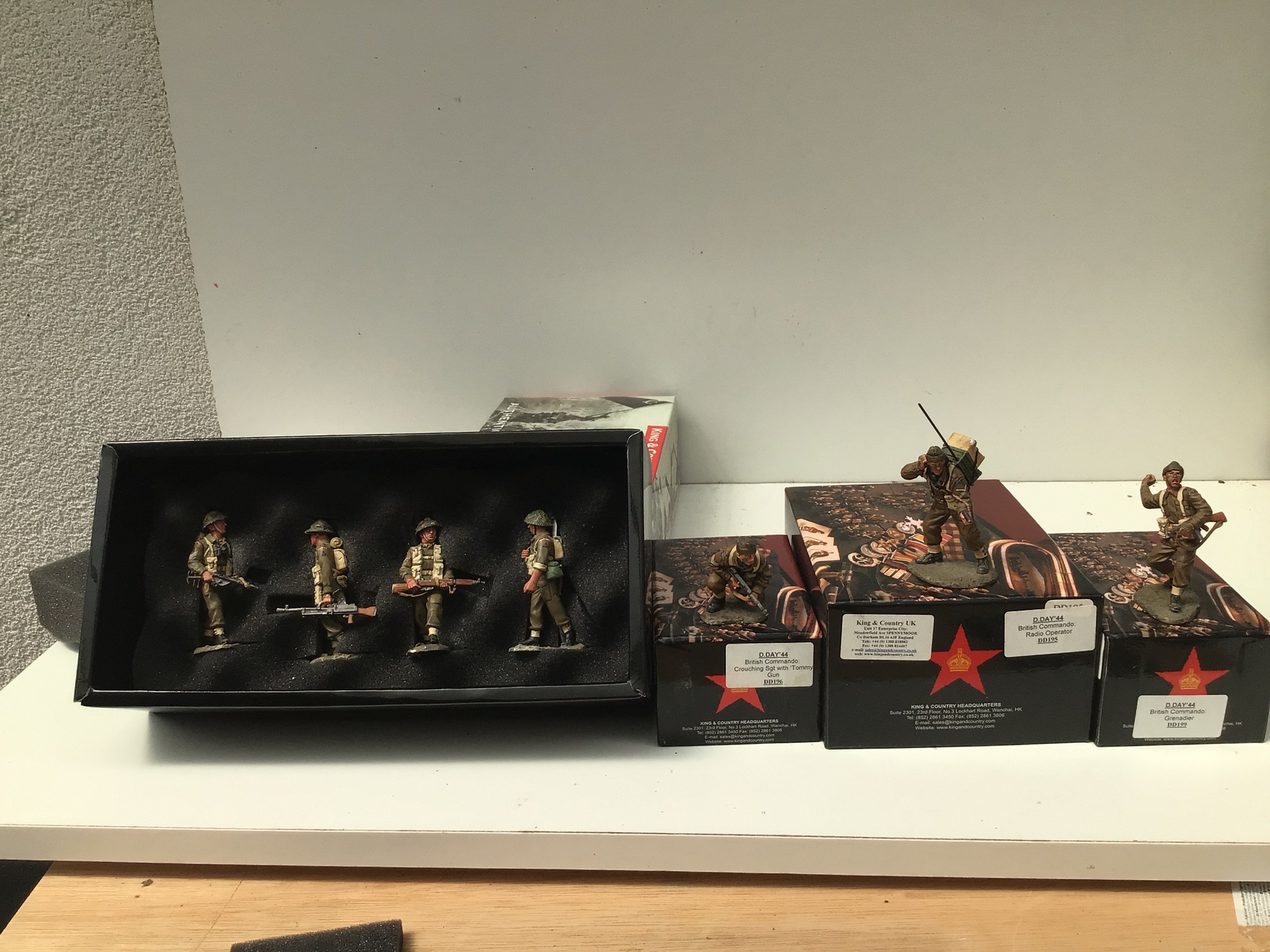 4x boxed King and Country Minature Military models from the D Day 1944 series featuring British Commandos. Includes DD195 Bc Radio Operator..DD196 BC crouching sgt with Tommy Gun. DD199 BC Grenadier..DD64. Tommy Patrol.. No reserve