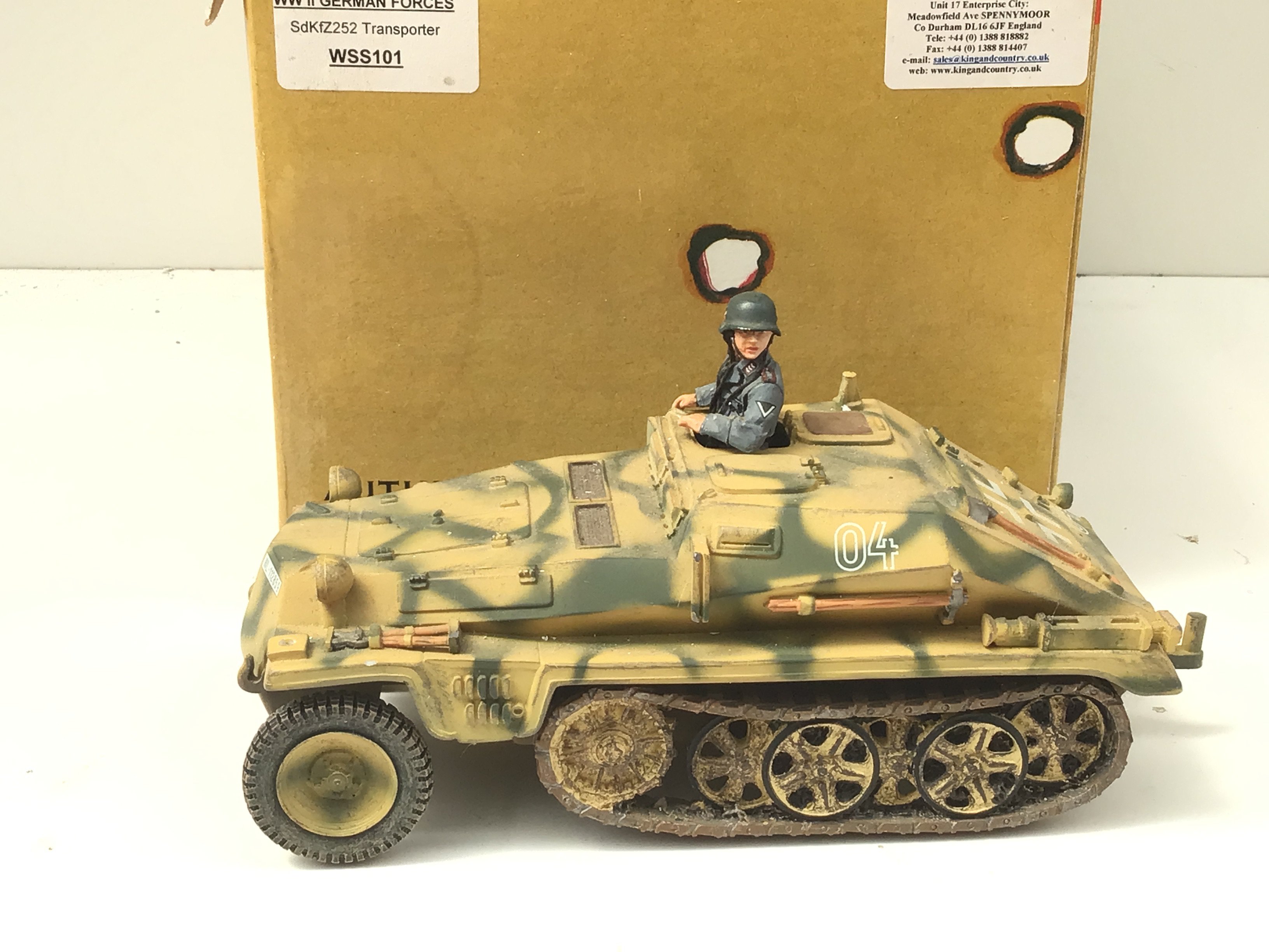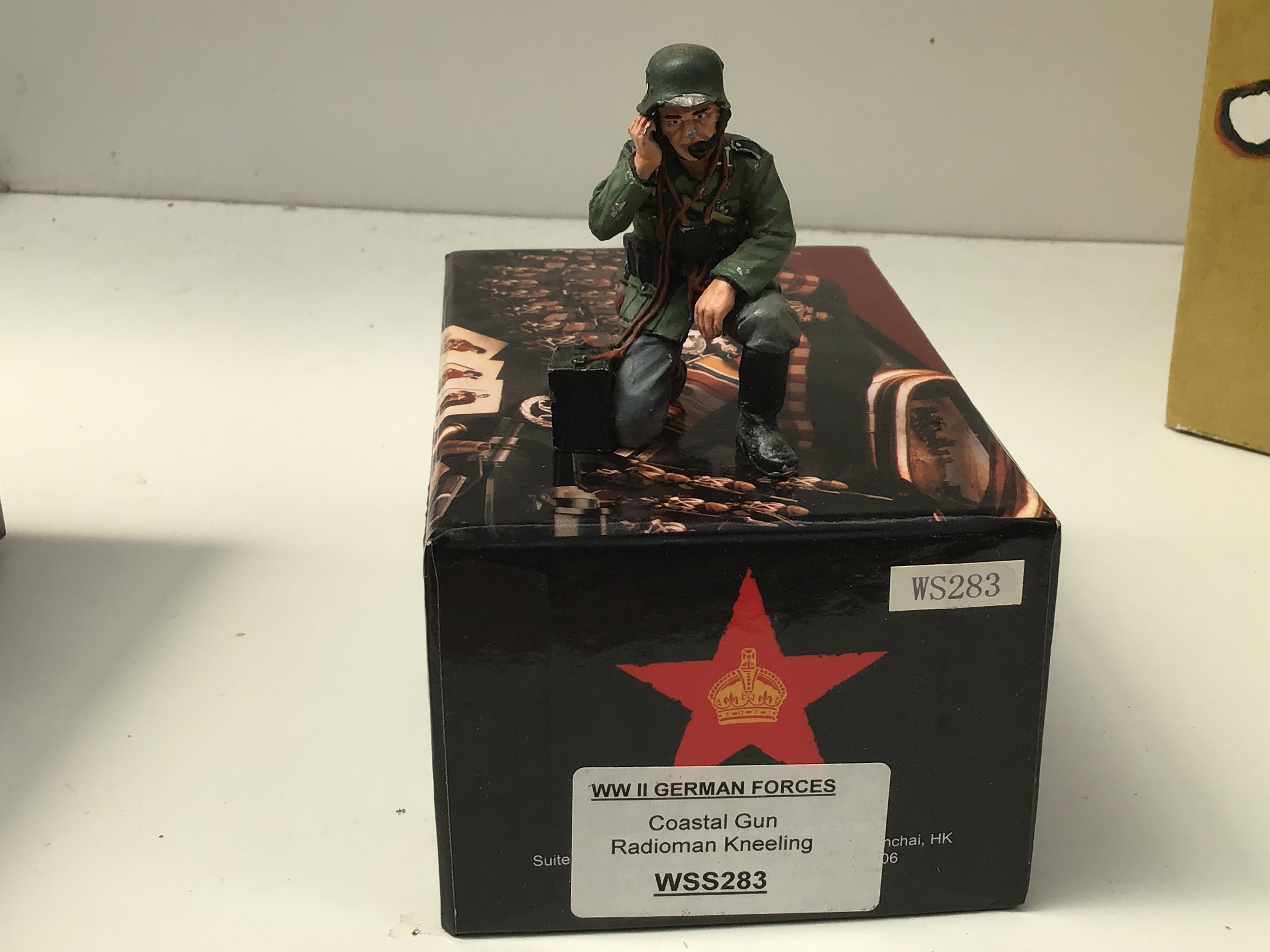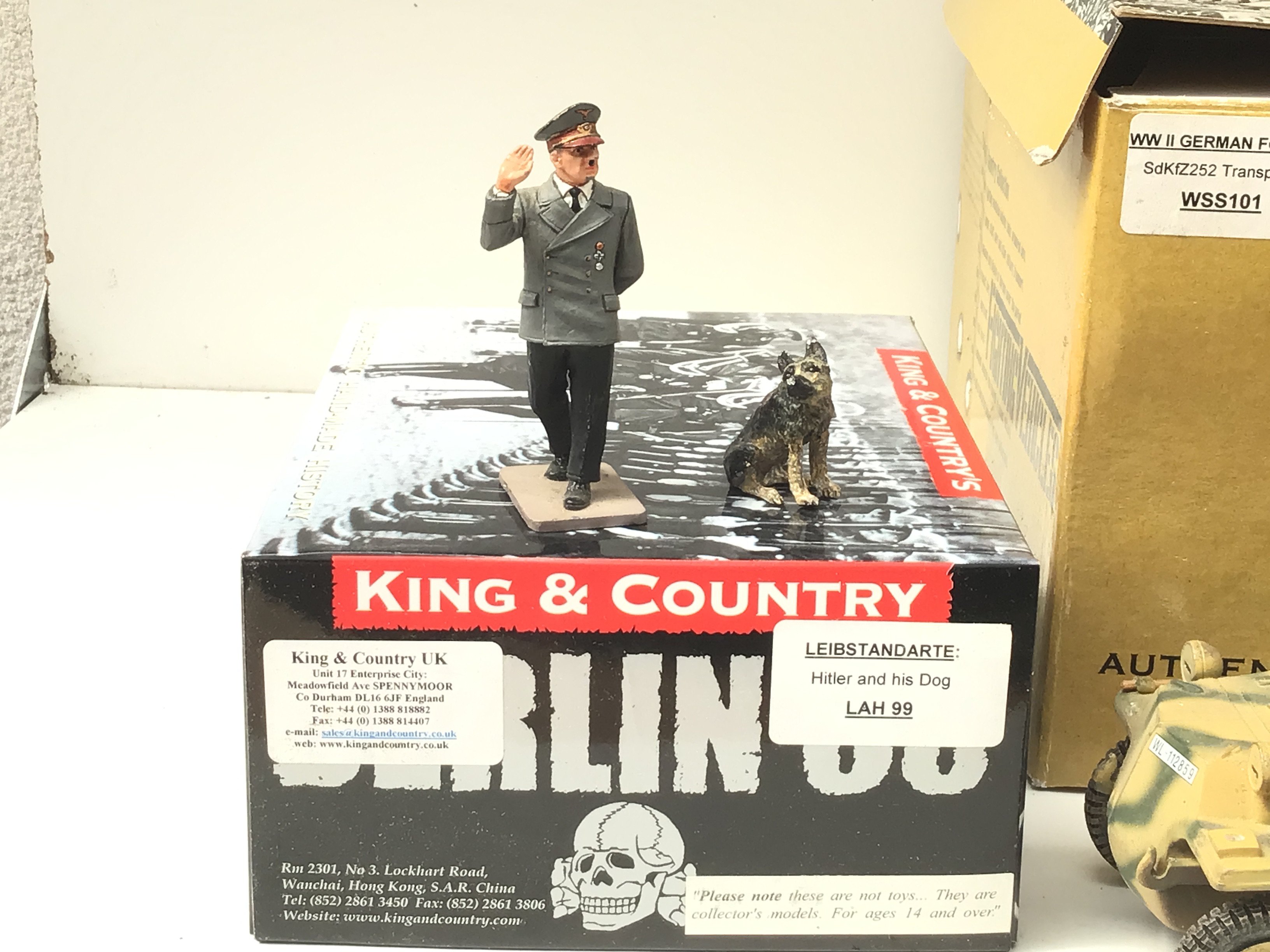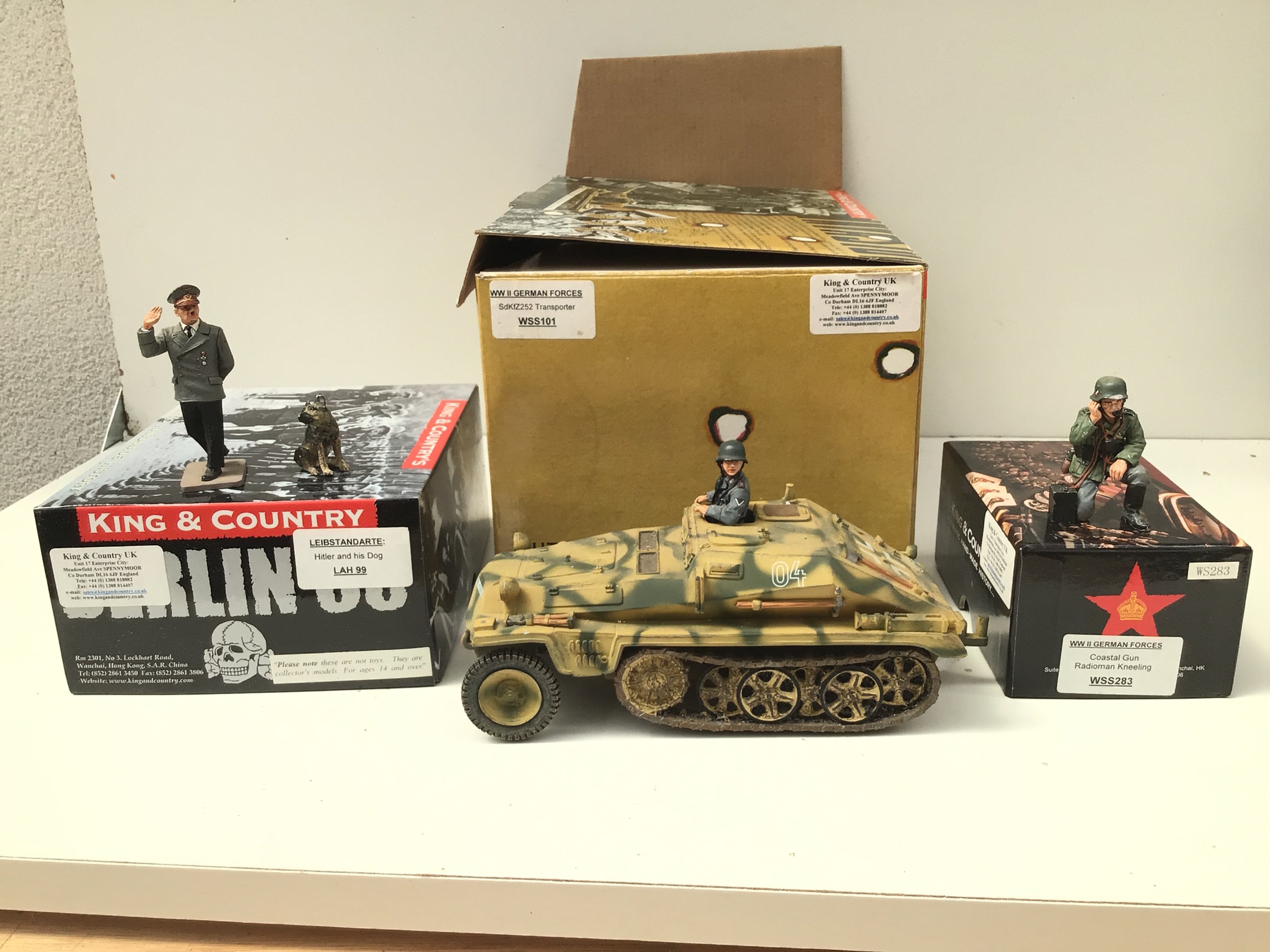 3 x boxed King and Country Minature Military models featuring German For es. Includes WSS101 Transporter. WSS283 Coastal gun Radioman kneeling..LAH99. Hitler and his dog. No reserve