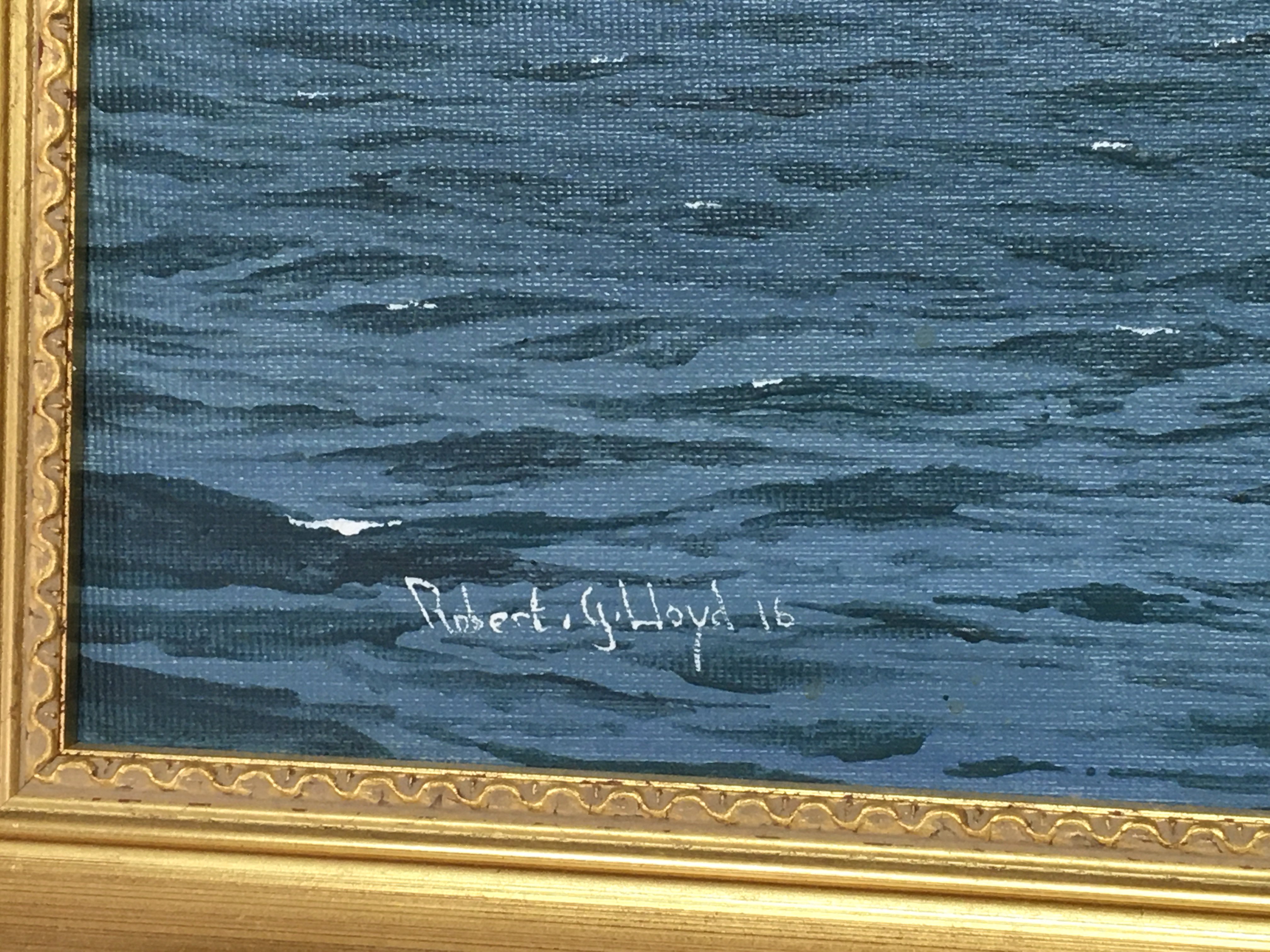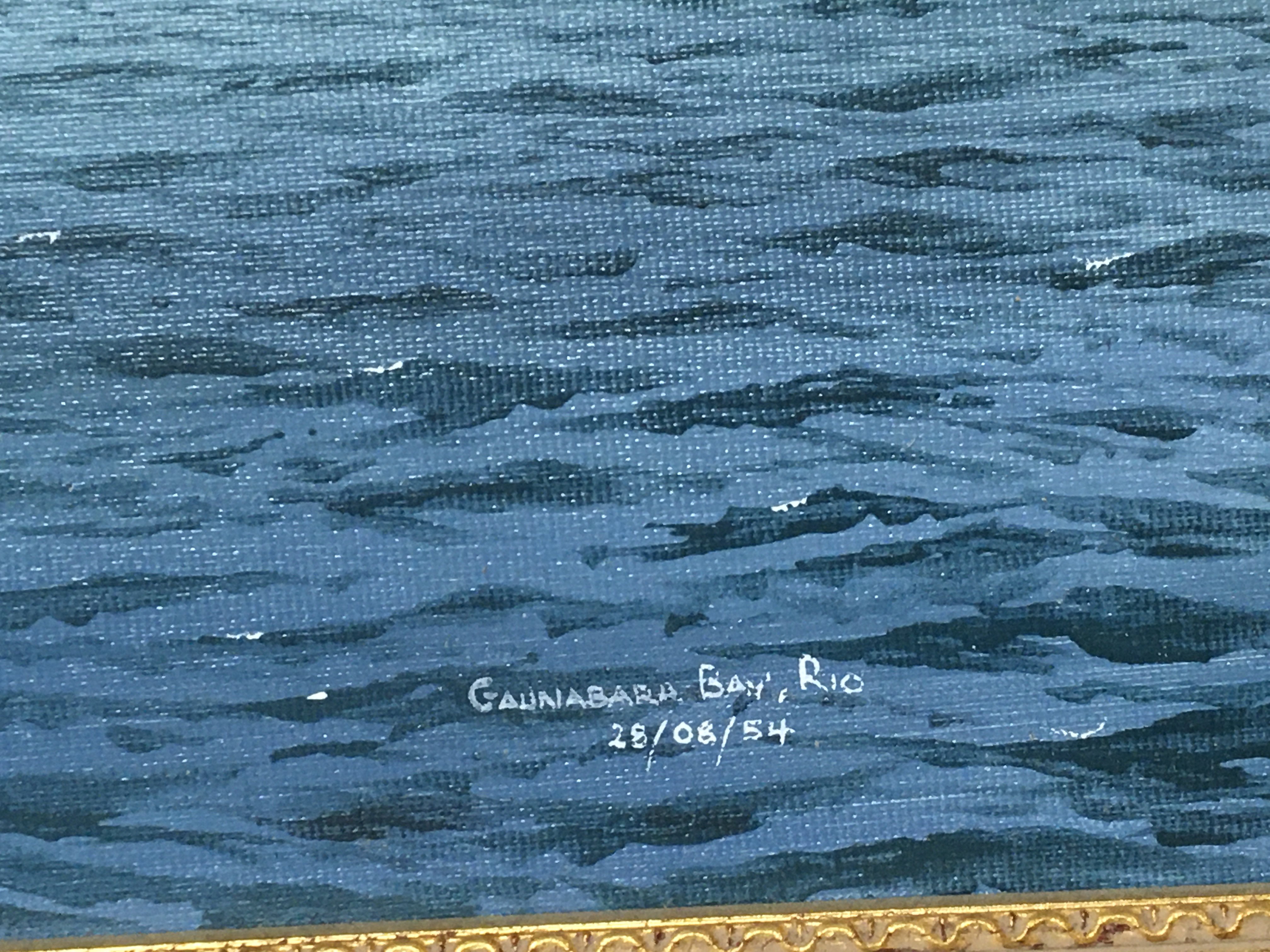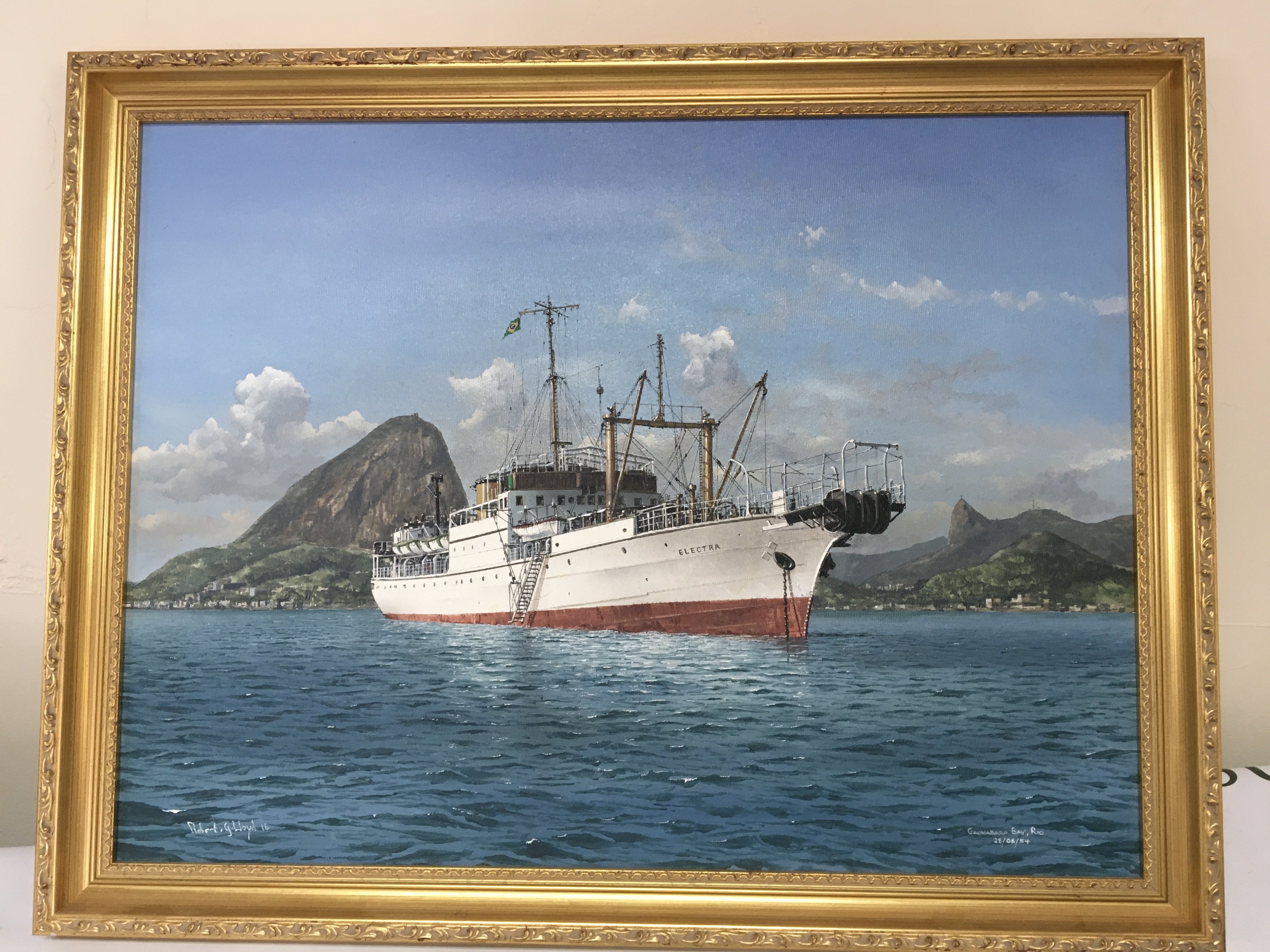 A Framed oil painting on board Marine study of the ship Electra moored with anchor down at Guanabara Bay Rio dated 28/04/1954. Signed by Robert G Lloyd 16 67x54cm approximately.