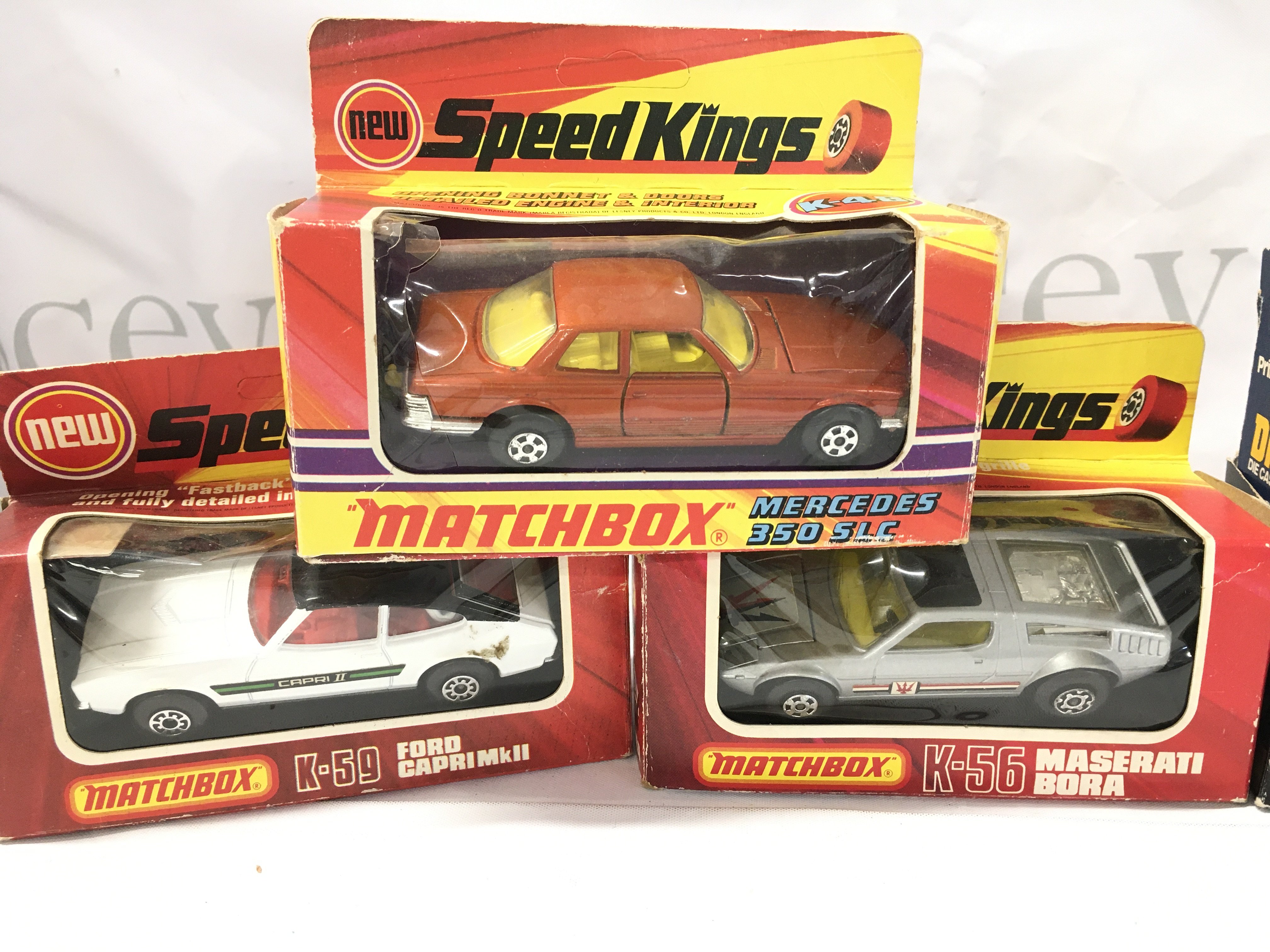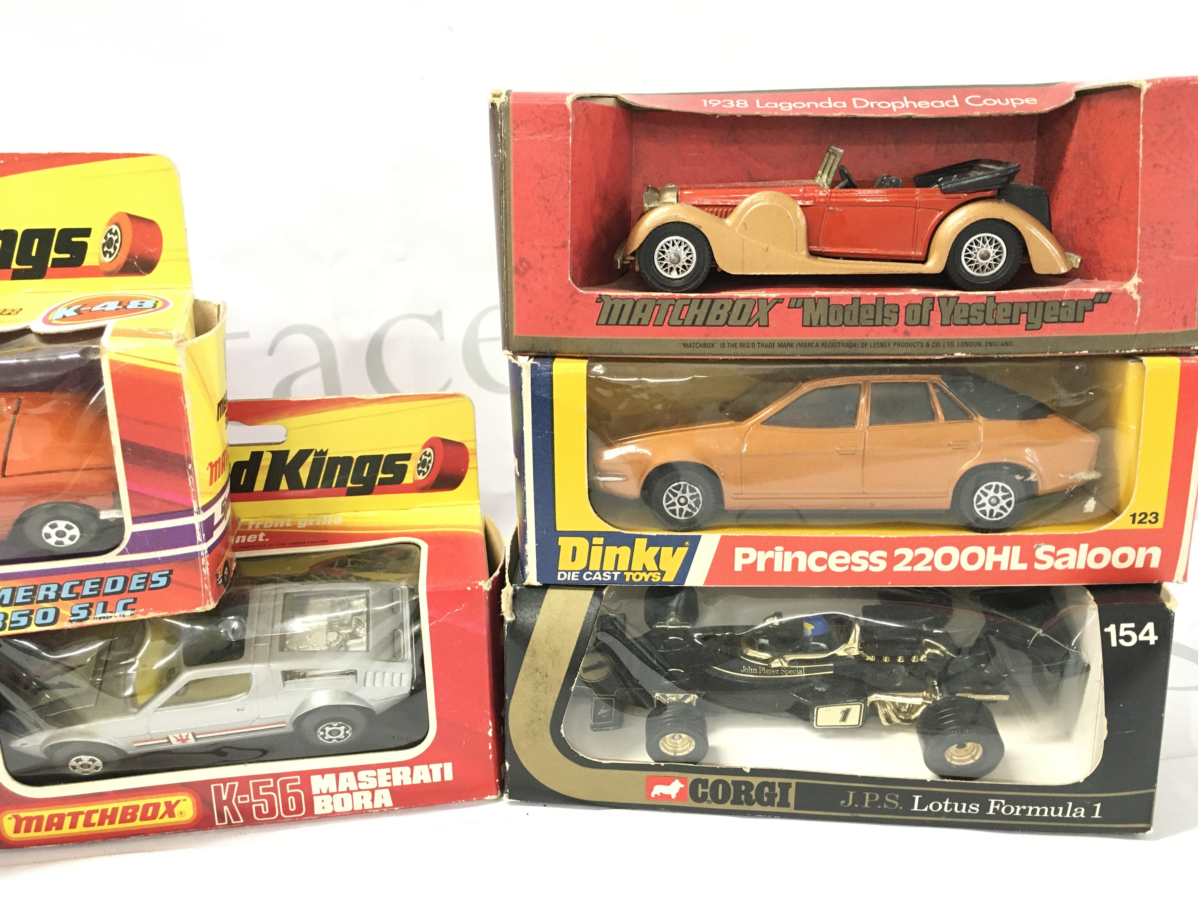 3 Boxed Matchbox Speed Kings. A Mercedes 350 5LC. A Ford Capri MK II. A Maserati Bora. And A Corgi JPS Lotus F1. A Dinky Princess 2200HL Saloon And. A Matchbox 1938 Luganda Drophead Coupe. Boxes In Various States.