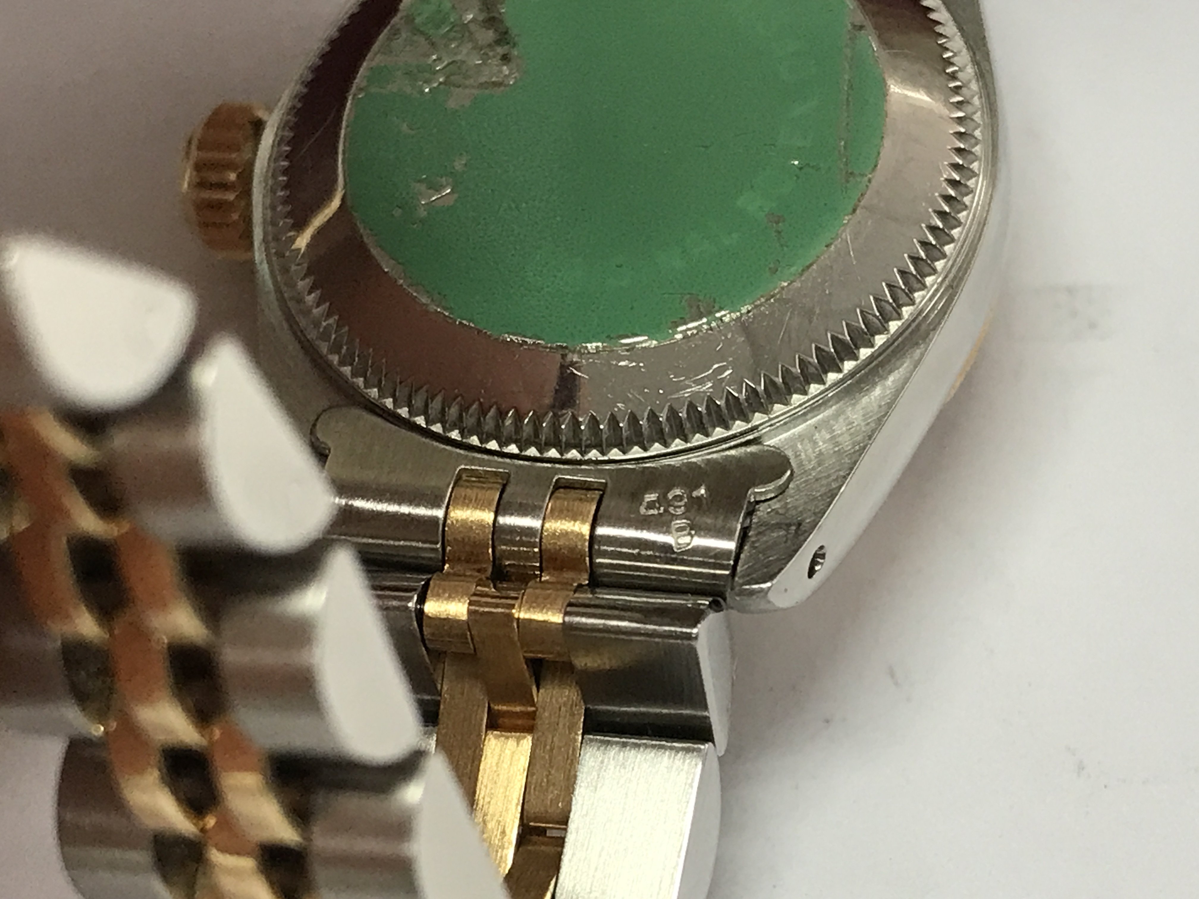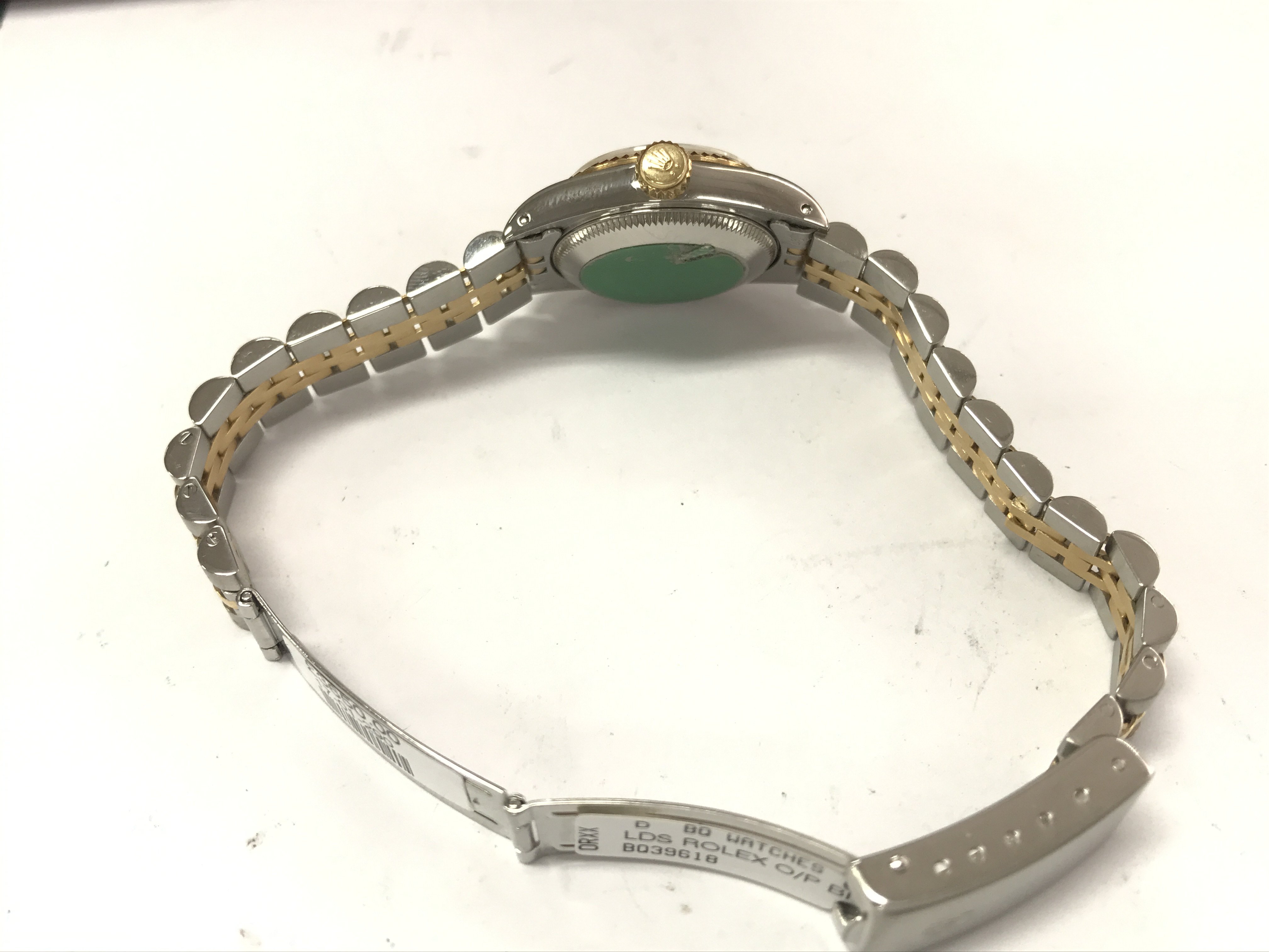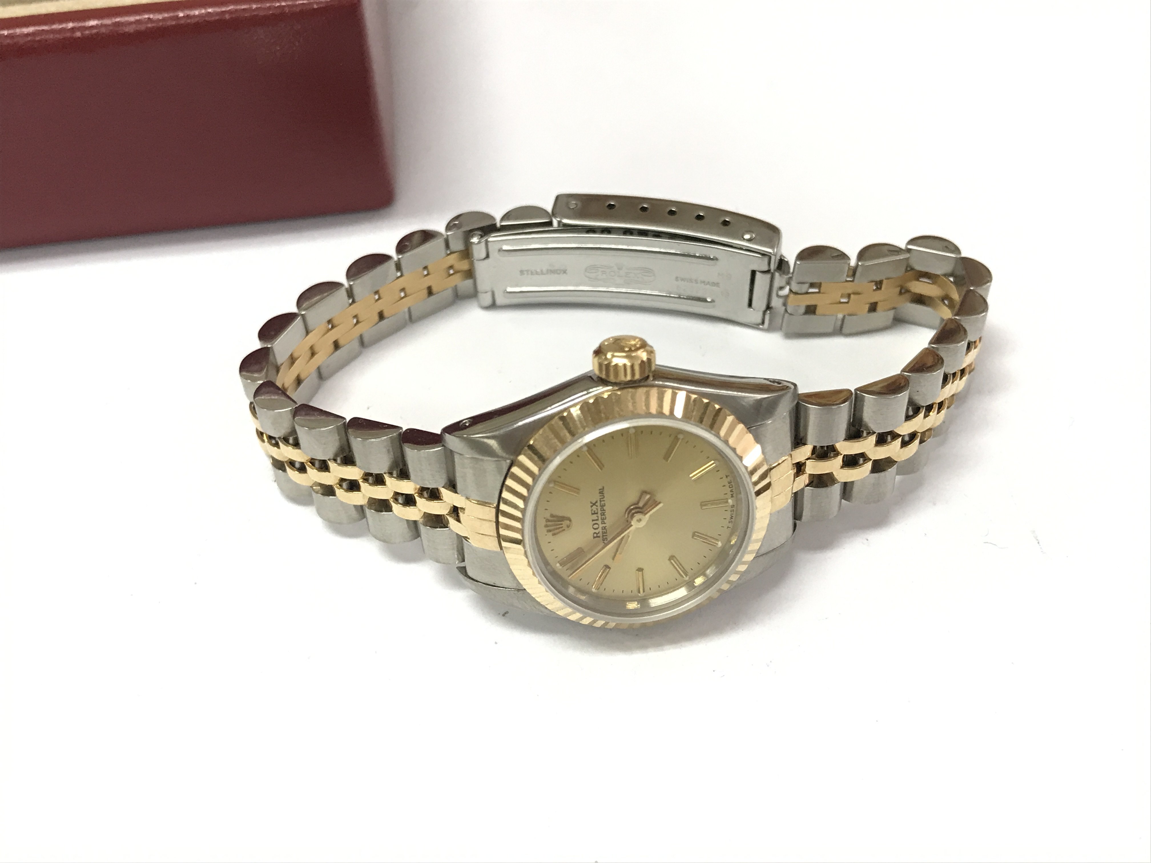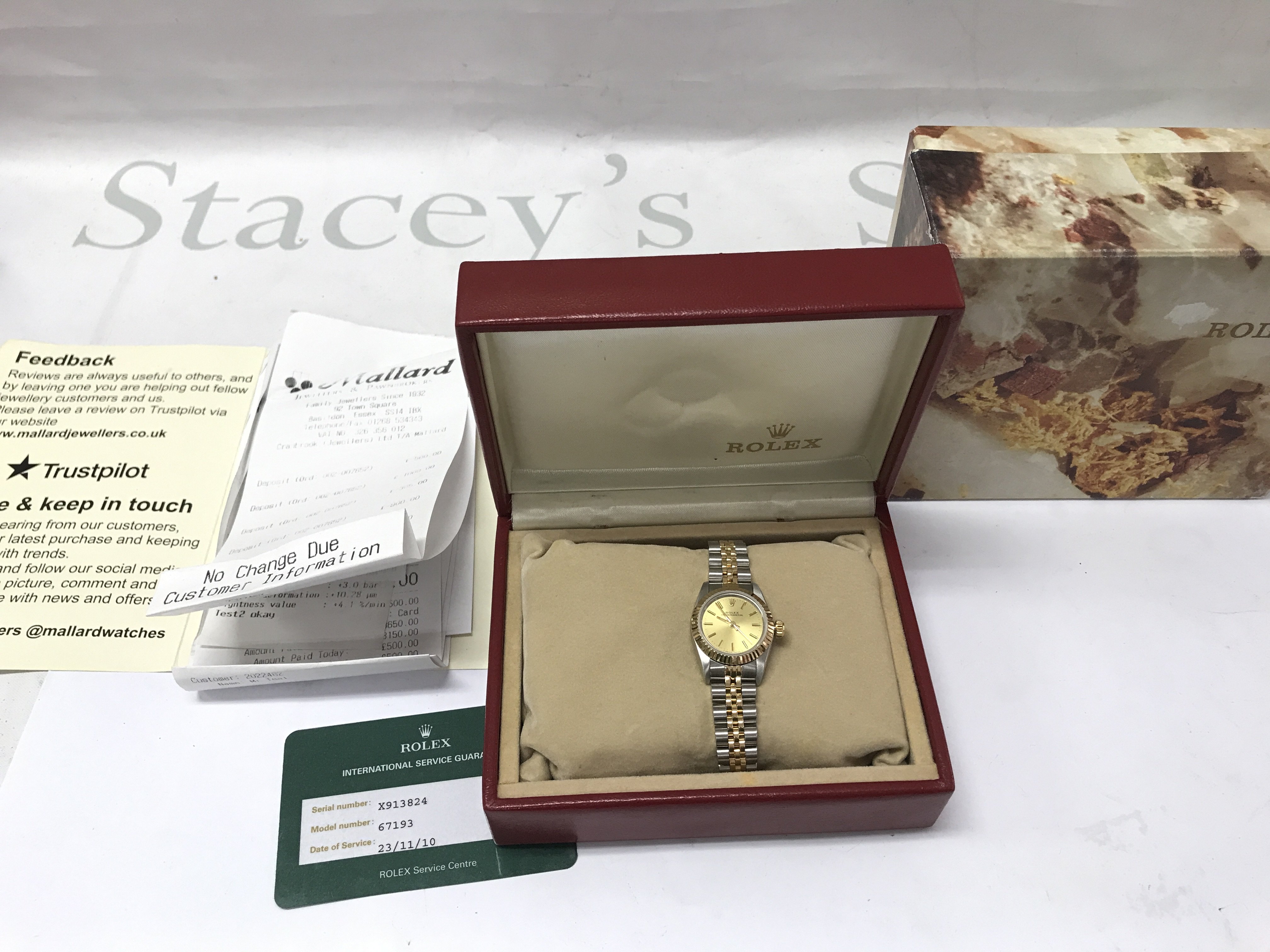 A ladies Rolex Oyster perpetual ref 67193 with gold and steel case and strap and a champagne dial. 26mm case. Watch in very good condition seen running. Comes with box and a 2010 service card. Watch circa 1991. Postage B