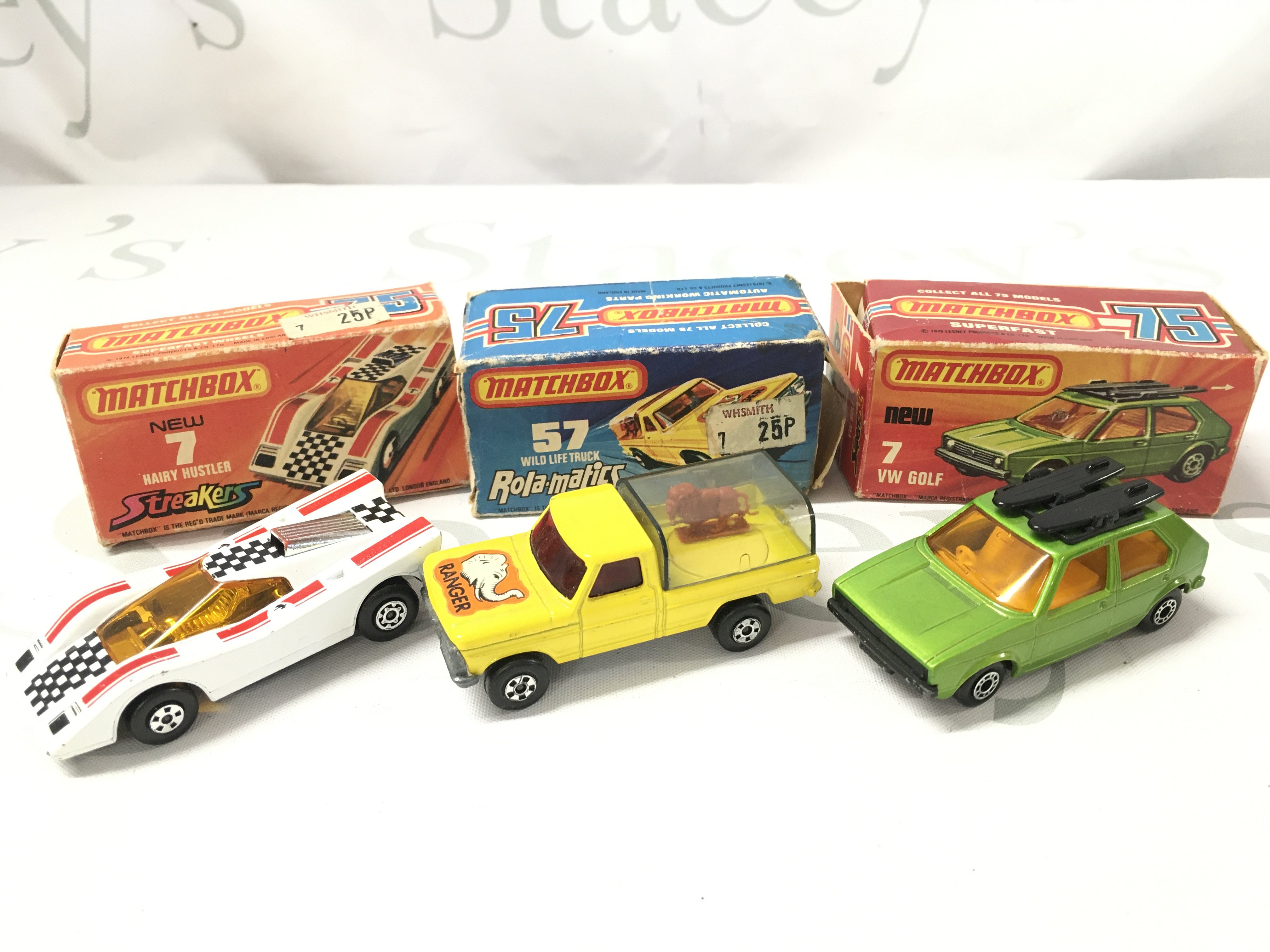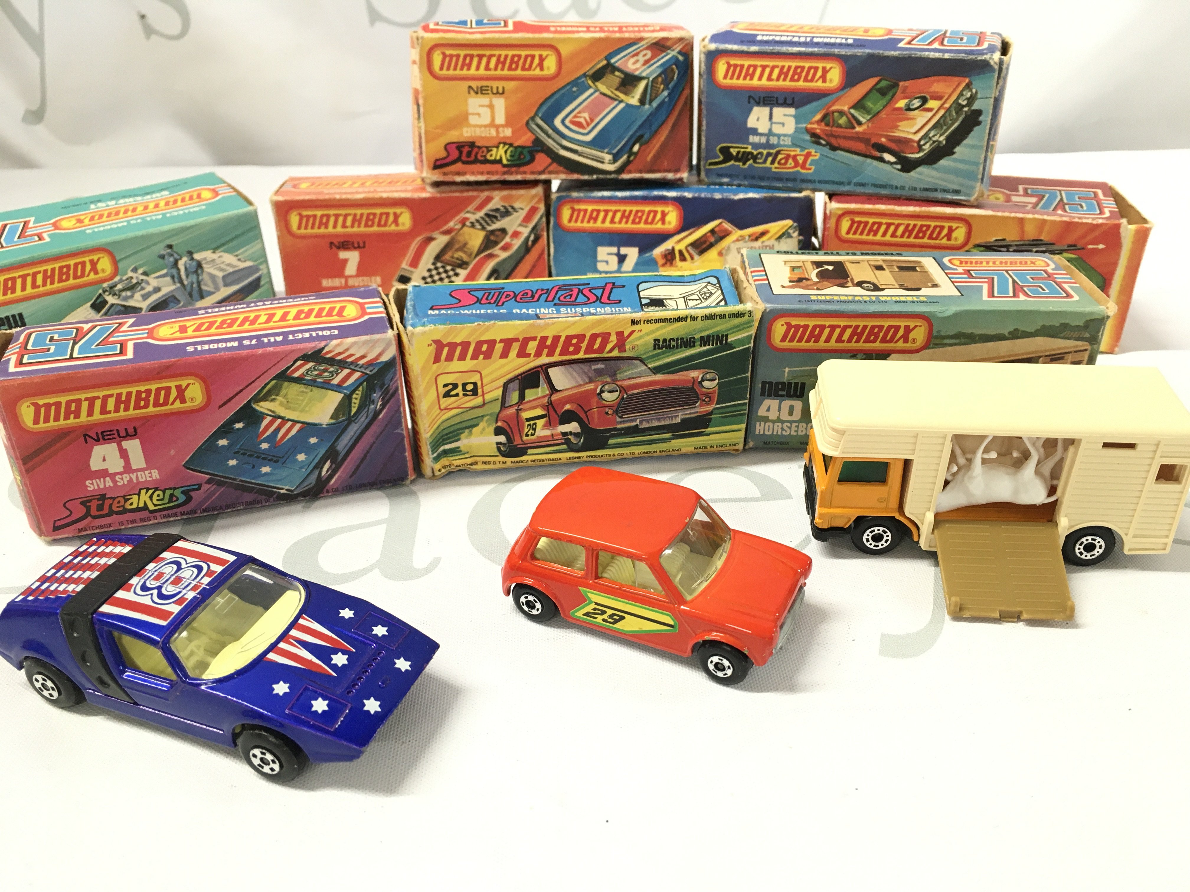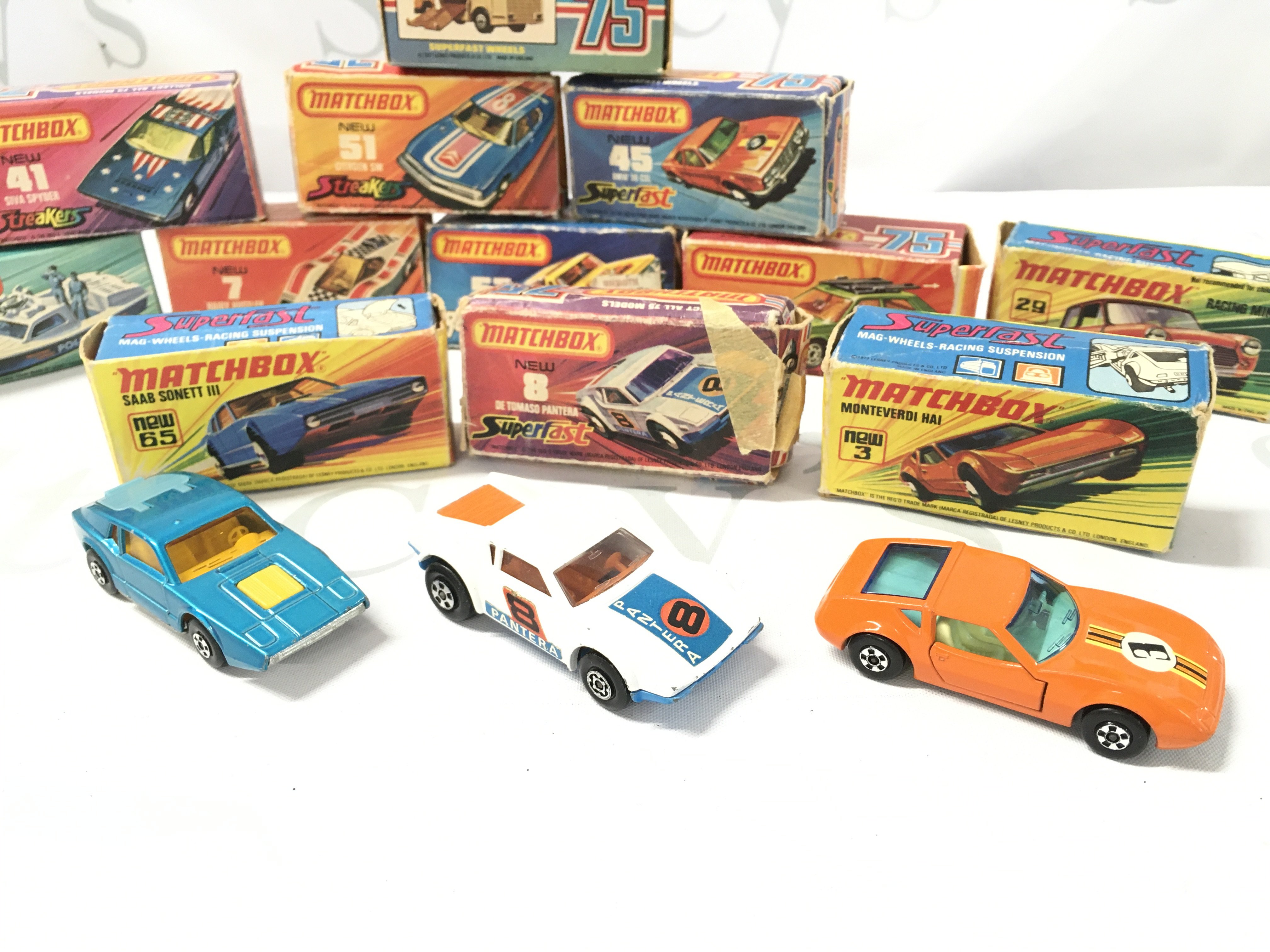 A Collection of Boxed Matcbox Cars. Boxes Are In Various States. Some Cars Have Damage.