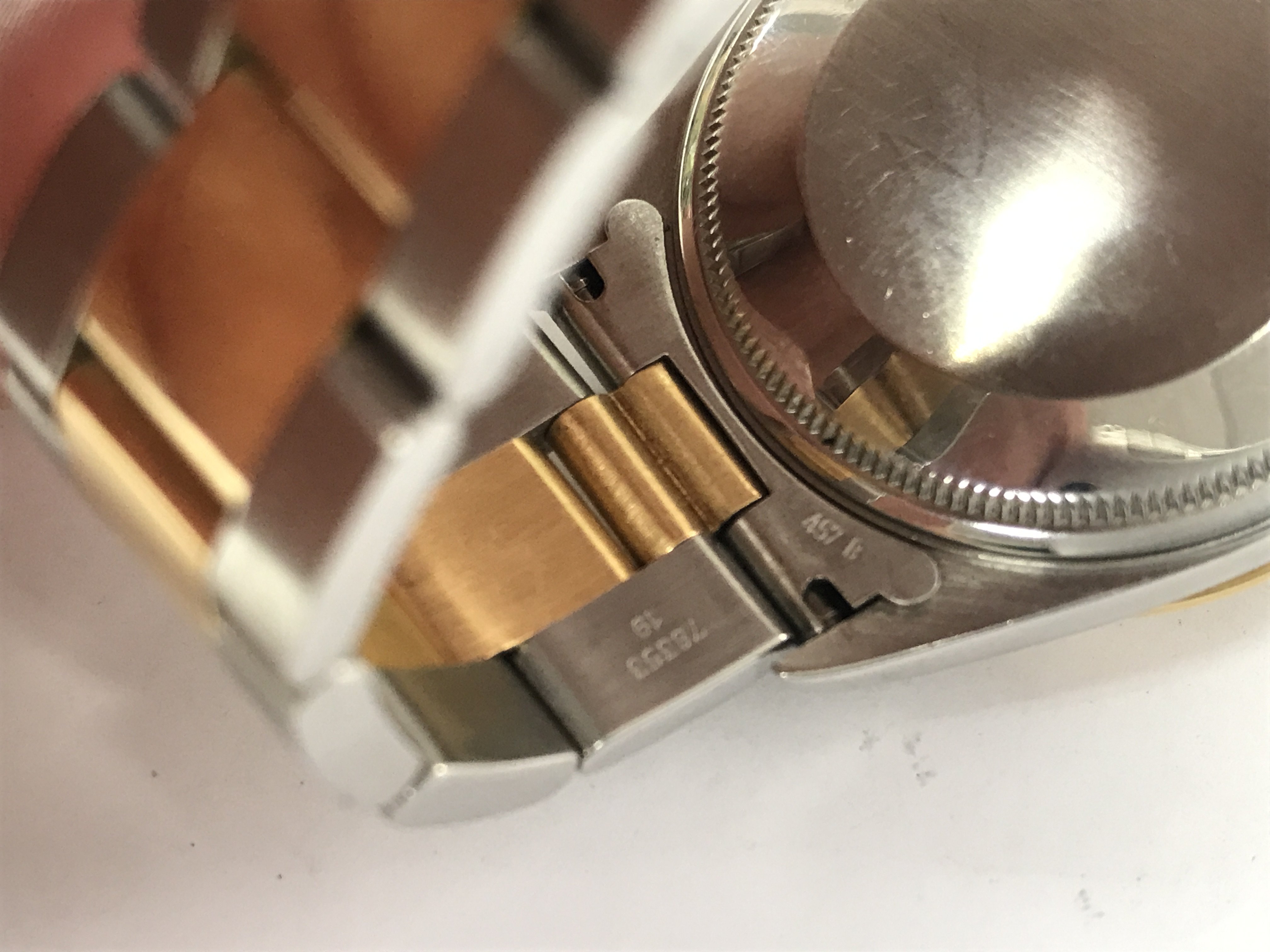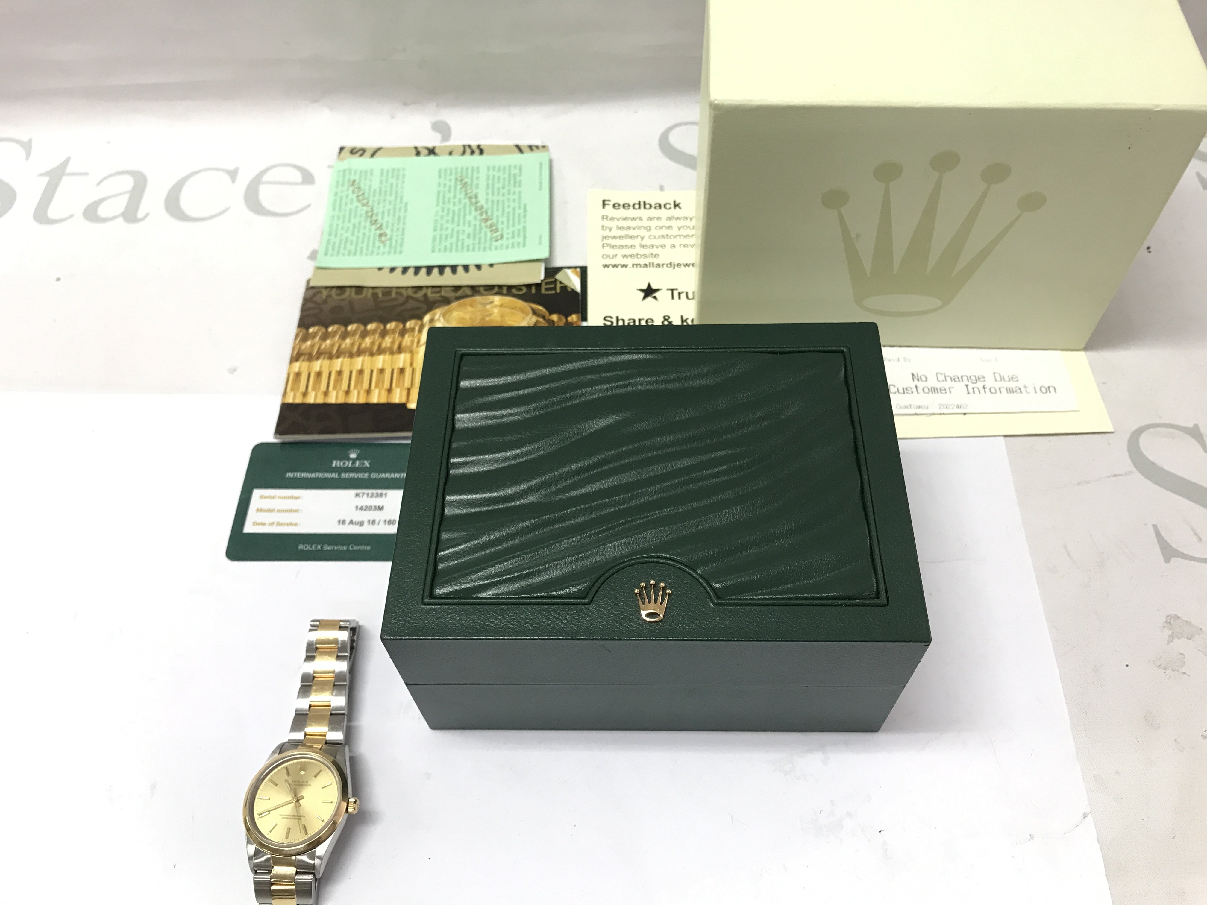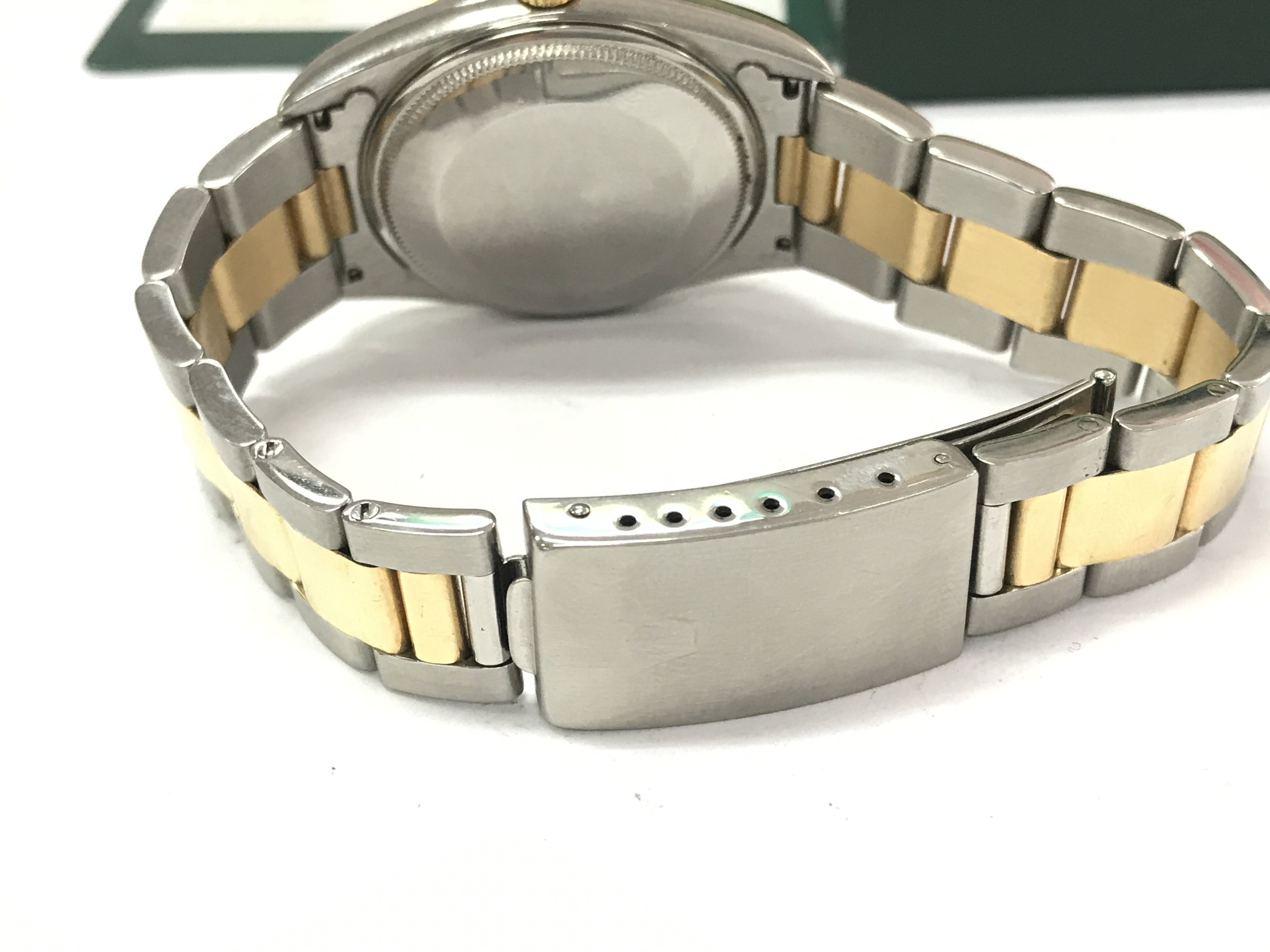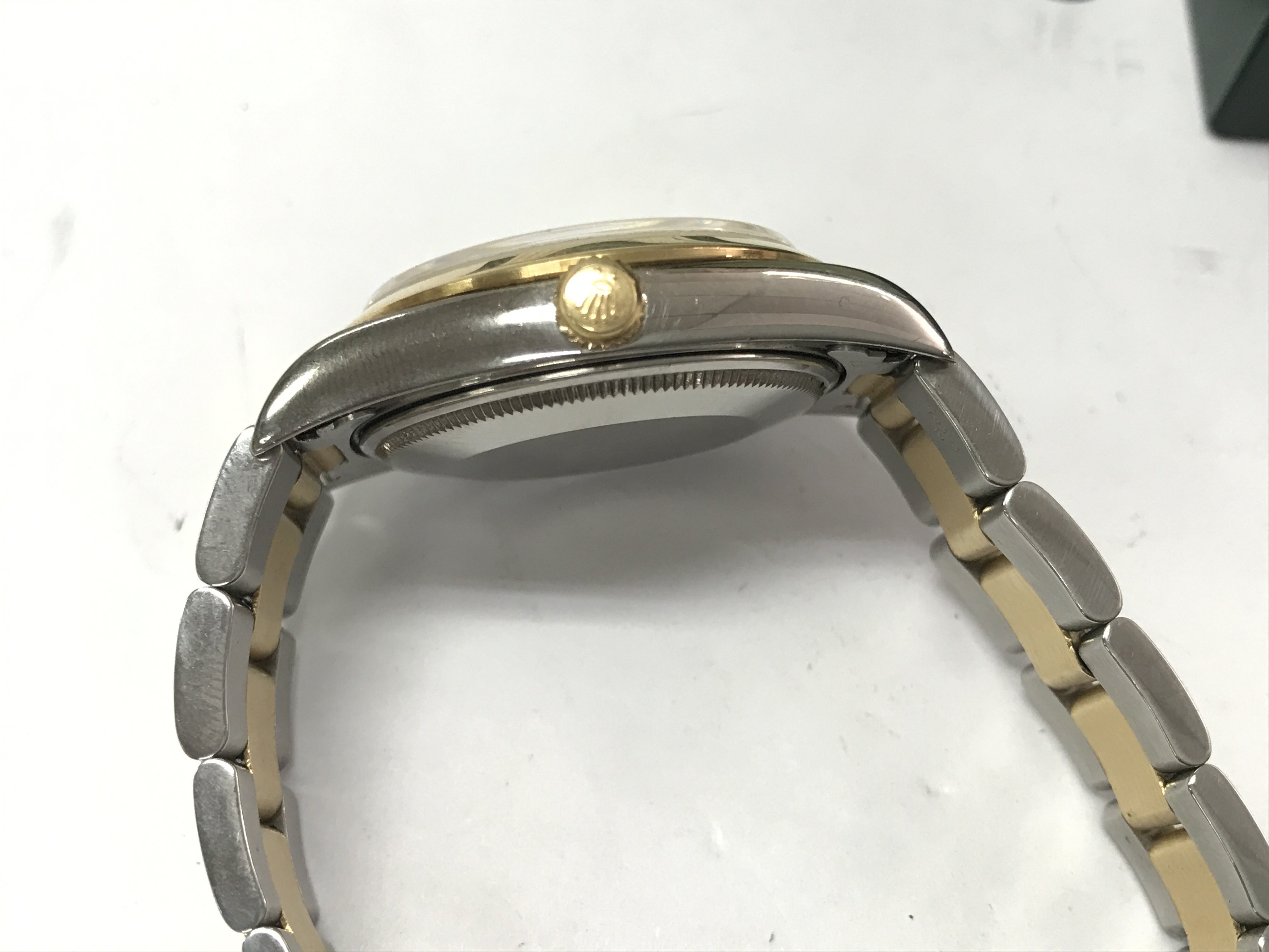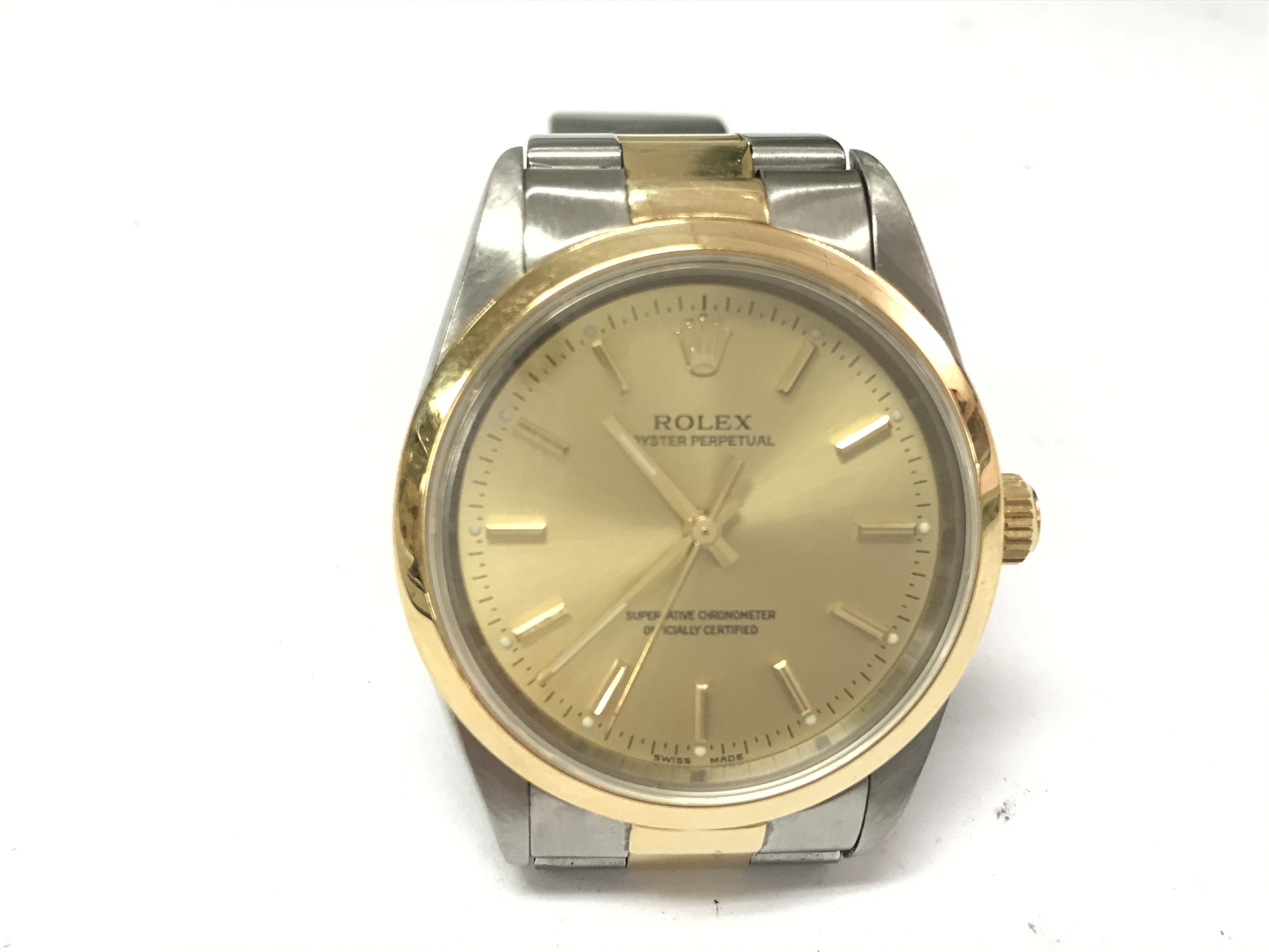 A gents Rolex oyster perpetual with bi colour case and strap. Case 34mm. Watch seen running. Comes with Rolex box (no cushion) and a service card. Circa 2001
