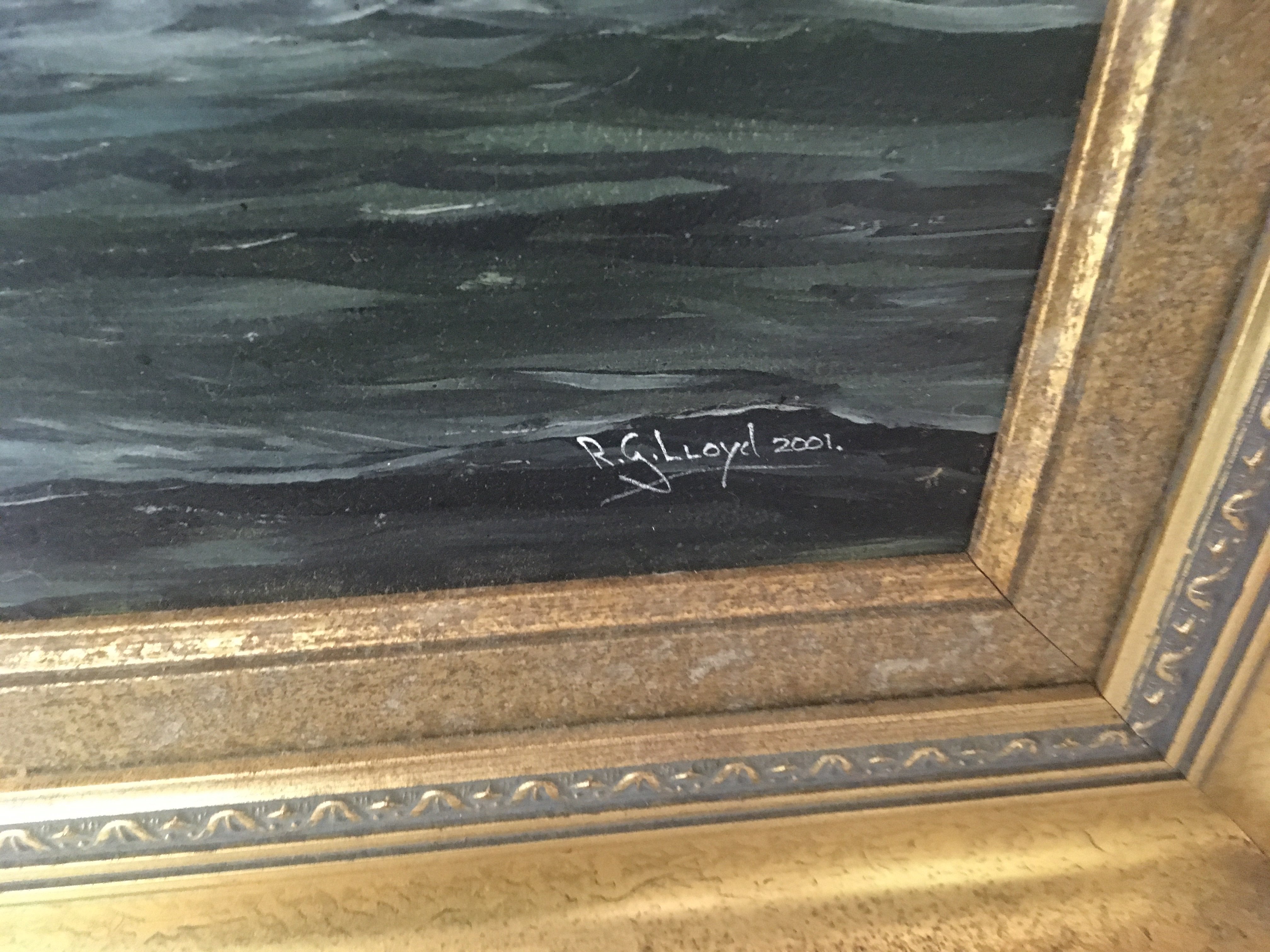 A framed oil painting on board Marine study of SS Dorset of Cape Bon during operation Pedestal. 13.8 1942 a convoy of ships sent to give relief and supplies to Malta which engaged with the enemy and incurred the loss of several merchant ships and Royal Navy ships. The painting signed by the artist Robert G Lloyd. 93x69cm