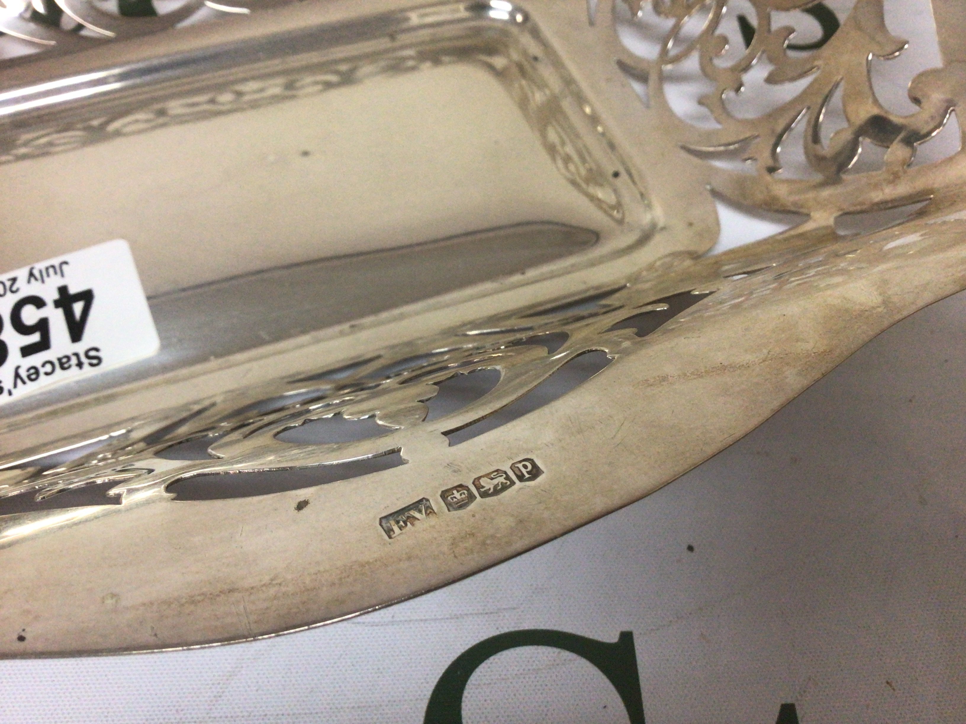 A silver dish with pierced shape sides Sheffield hallmarks maker EV. 28x22cm. Weight 366g.