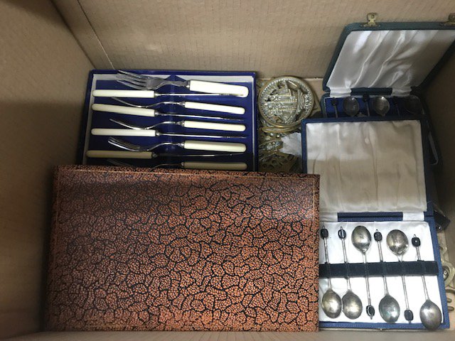 A collection of silver plate including Egyptian style flower vases, Egg Coddler, silver hallmarked hand brush, some silver hallmarked spoons . Postage category C