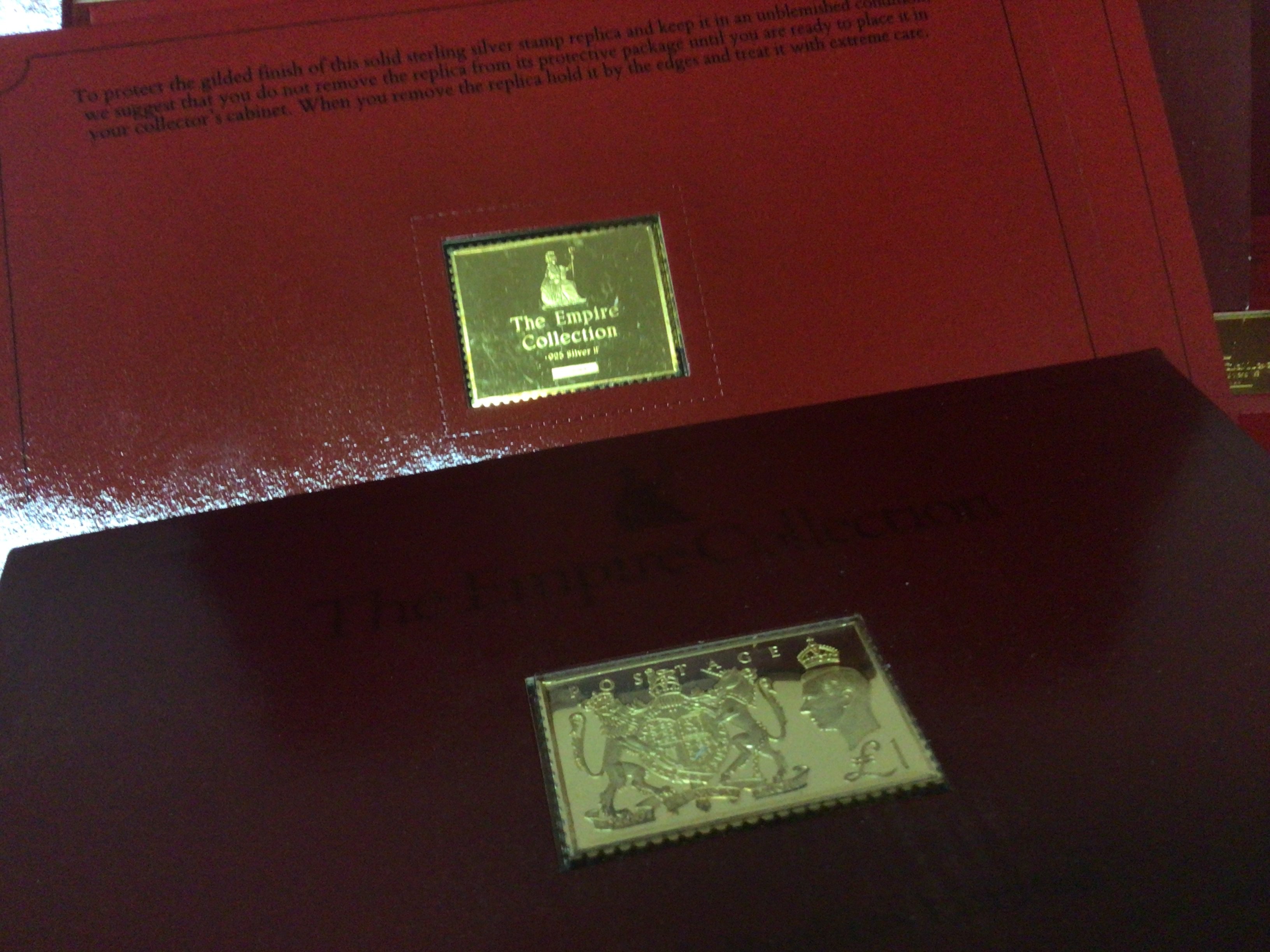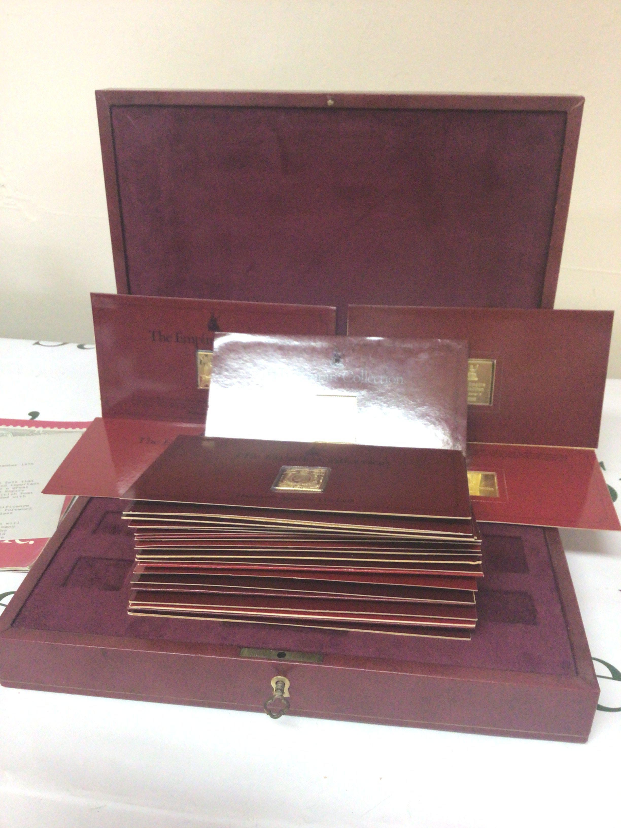 A collection of silver gilt Hallmarked Replica stamps The Empire collection 25 stamps in original packaging sold with a presentation fitted box.