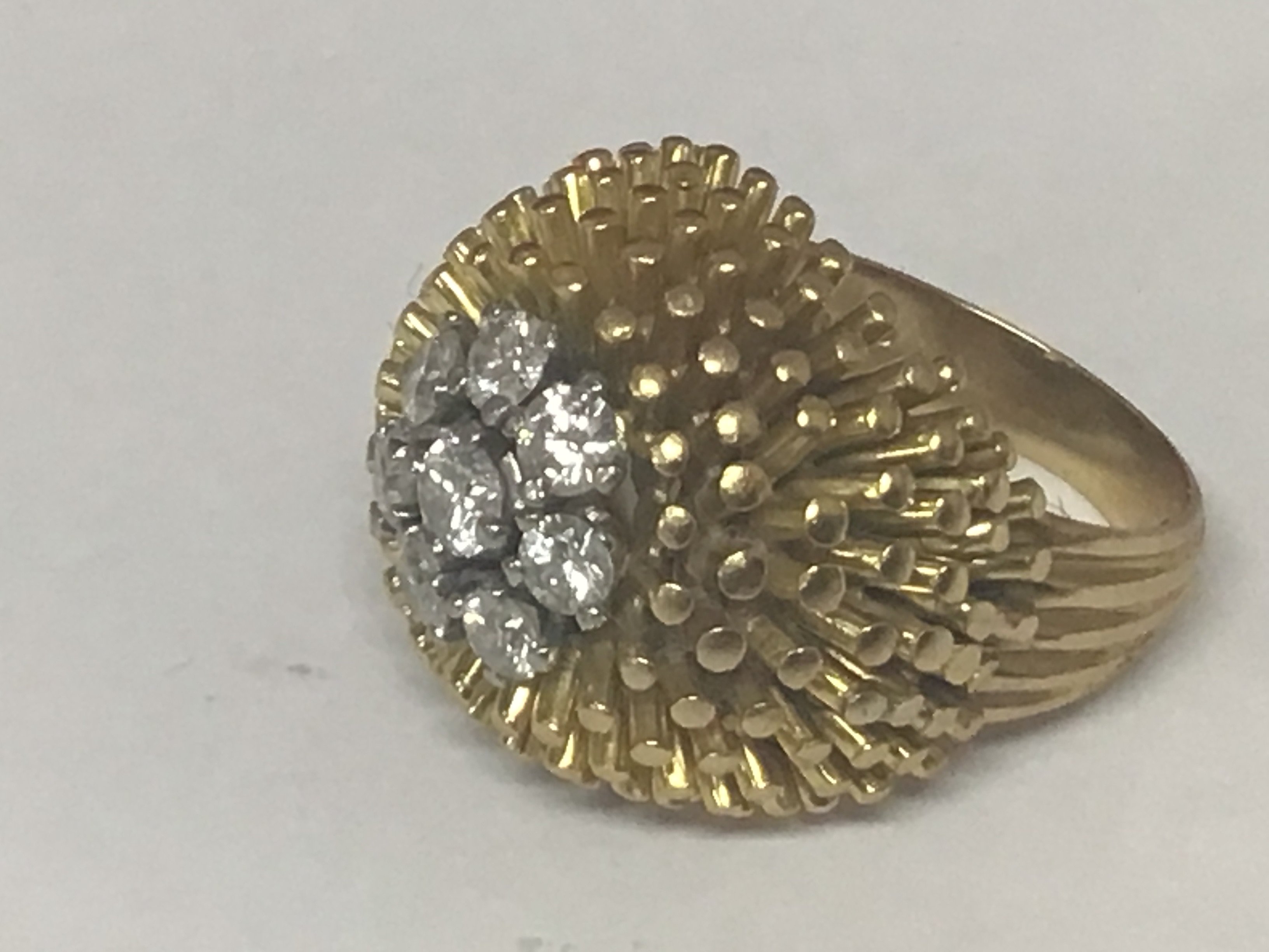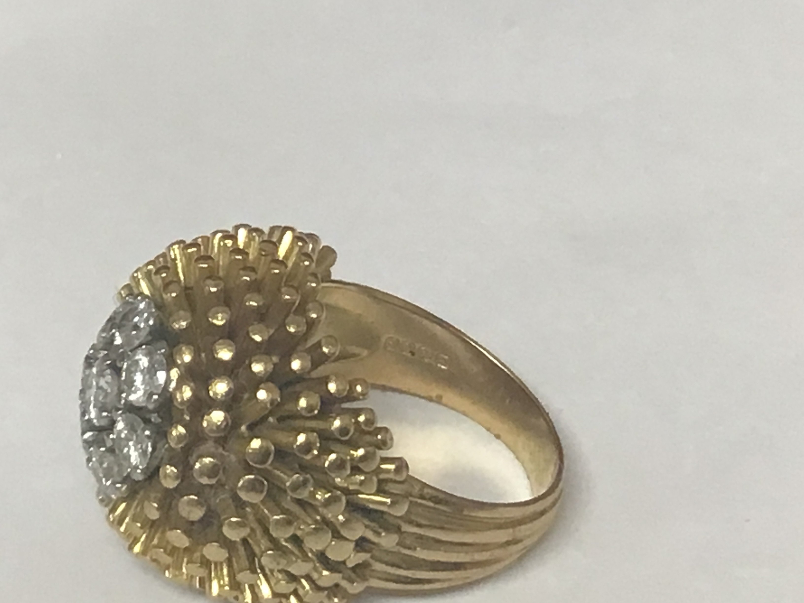 A quality 18carat yellow gold modern design ring set with a pattern of eight brilliant cut diamonds of good colour and clarity Weight 17.7g approximately ring size J-K