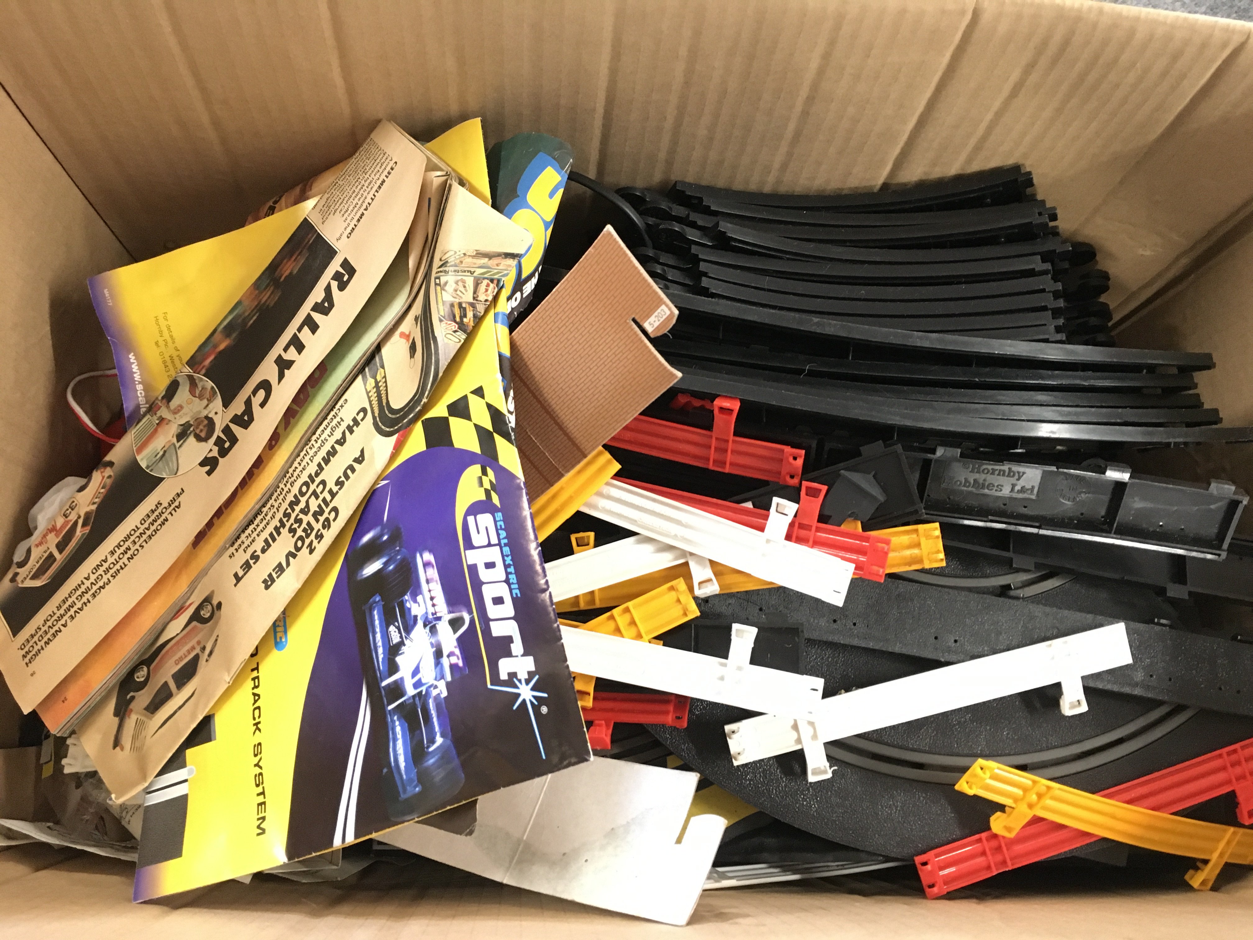 A Box Containing A Collection of Various Scalextric Parts and Spares Including A Boxed Aston Martin DBR9