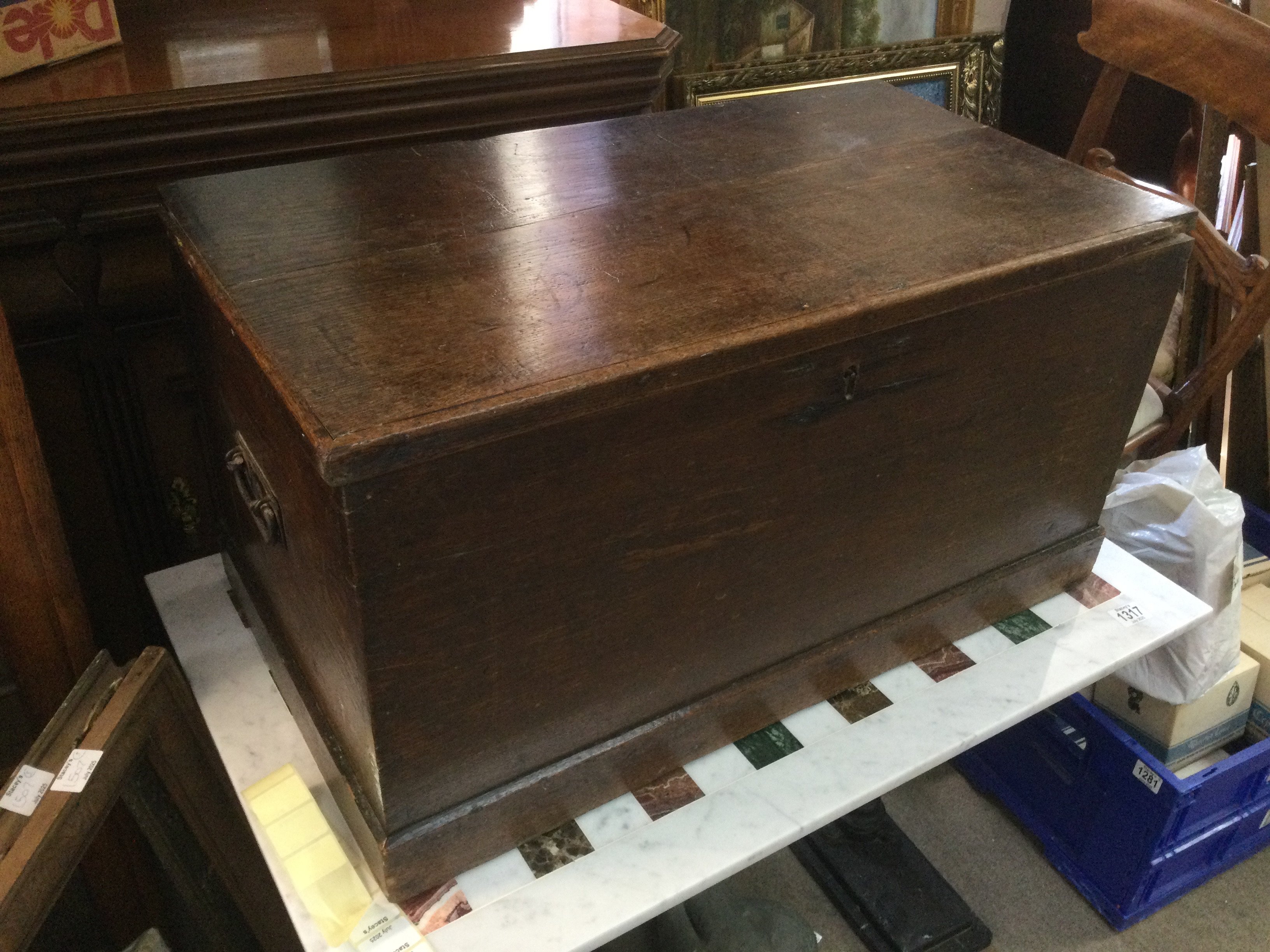 An oak trunk, approx 76cm x 42cm x 40cm. Shipping category D.