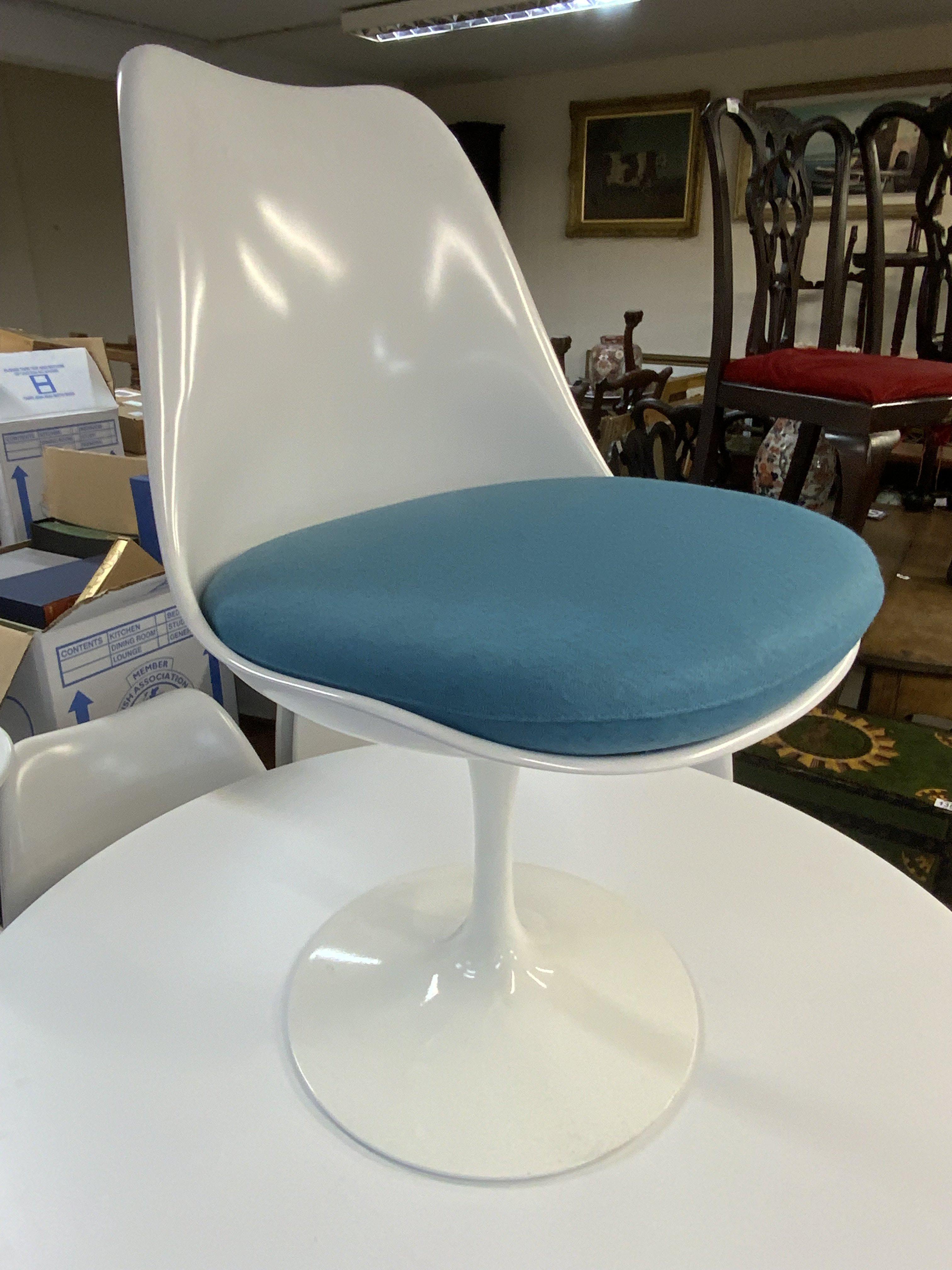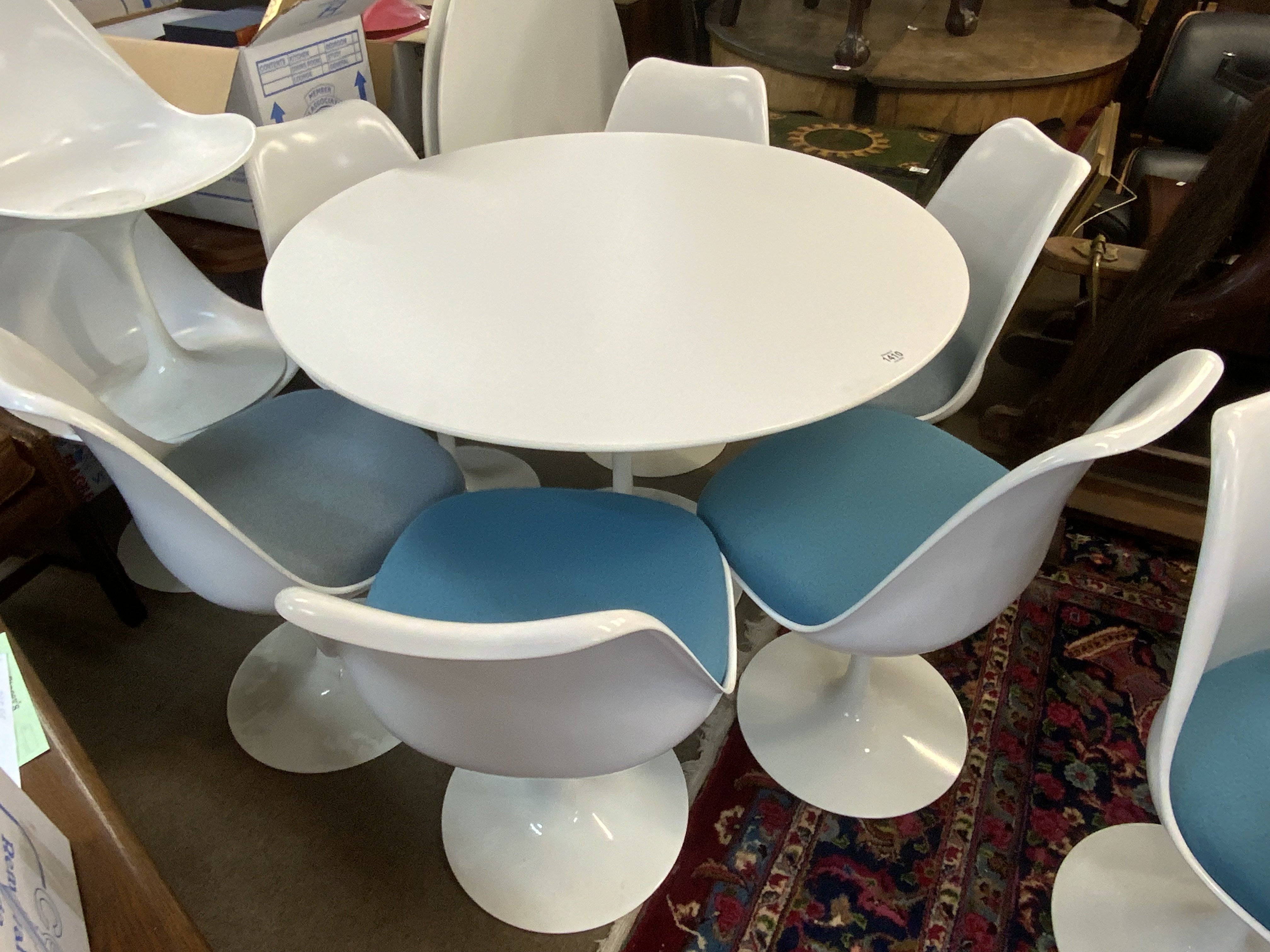 Mid Century Tulip dining suite (Table and 6 chairs) designed by Eero Saarinen 1956 (Finnish-American, 1910-1961) for Knoll, laminated top over a curved painted metal base, stamped 'Knoll Studio', 107cm diameter 73cm high, and six 'Tulip' chairs, each with a white plastic shell over a painted metal base. (Mixed Light blue / turquoise blue upholstered cushions).