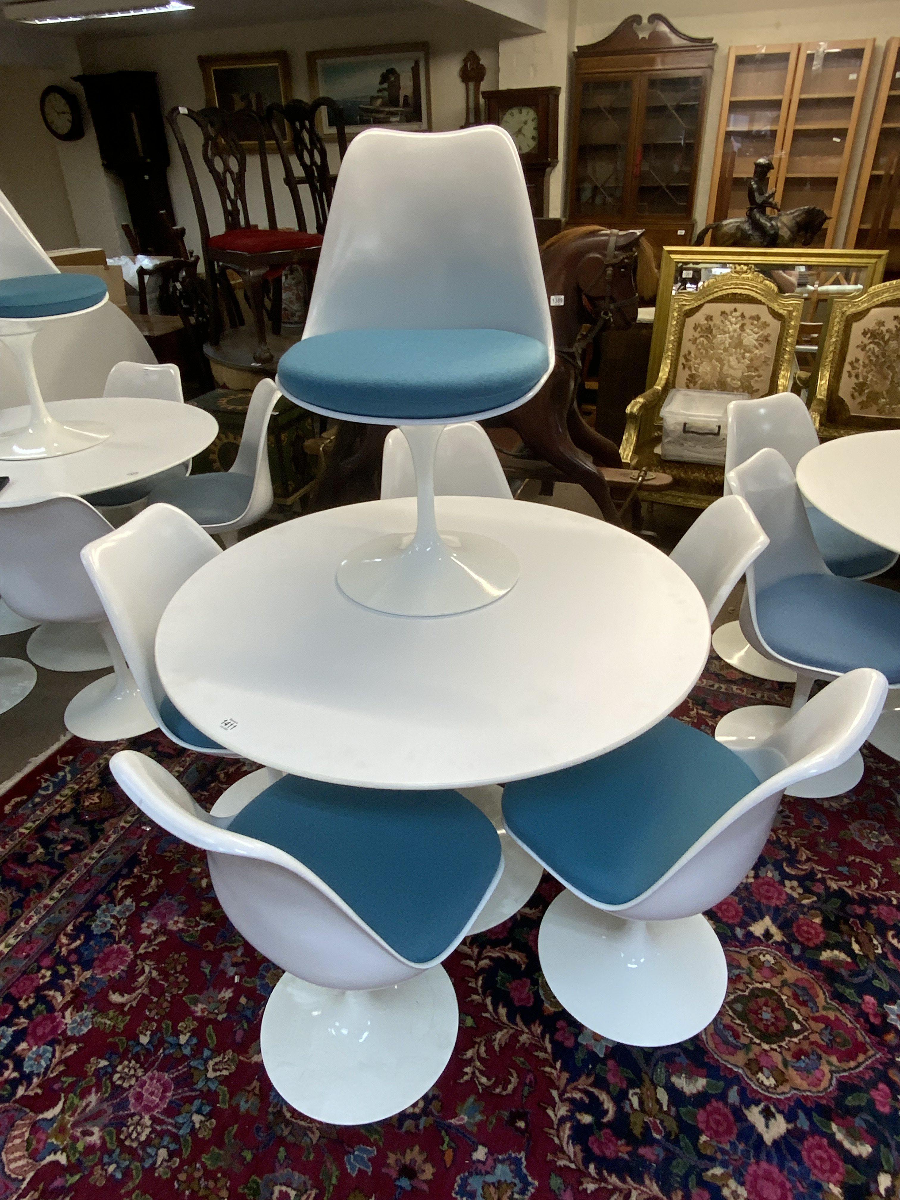 Mid Century Tulip dining suite (Table and 6 chairs) designed by Eero Saarinen 1956 (Finnish-American, 1910-1961) for Knoll, laminated top over a curved painted metal base, stamped 'Knoll Studio', 107cm diameter 73cm high, and six 'Tulip' chairs, each with a white plastic shell over a painted metal base. (Mixed Light blue / turquoise blue upholstered cushions).