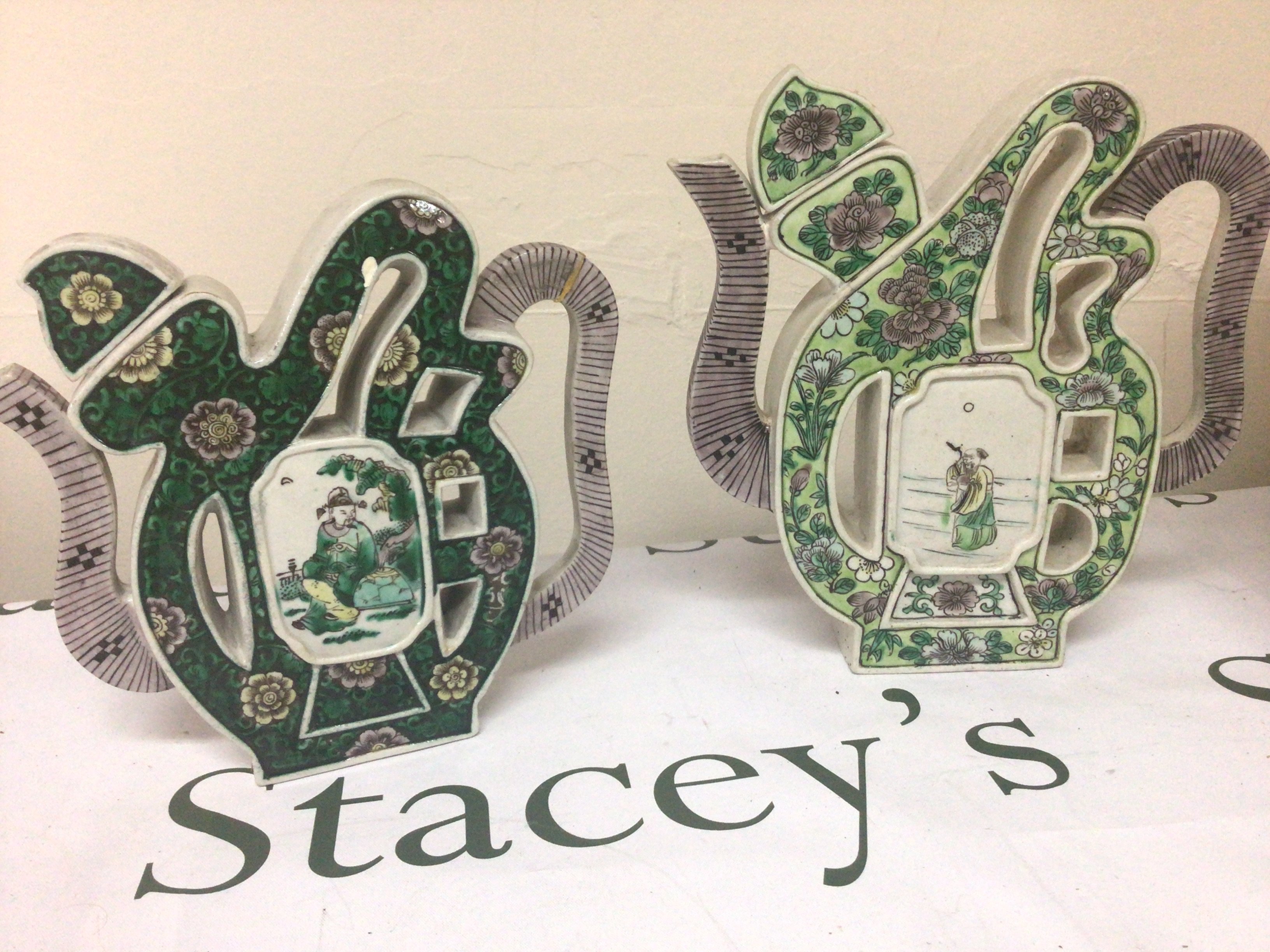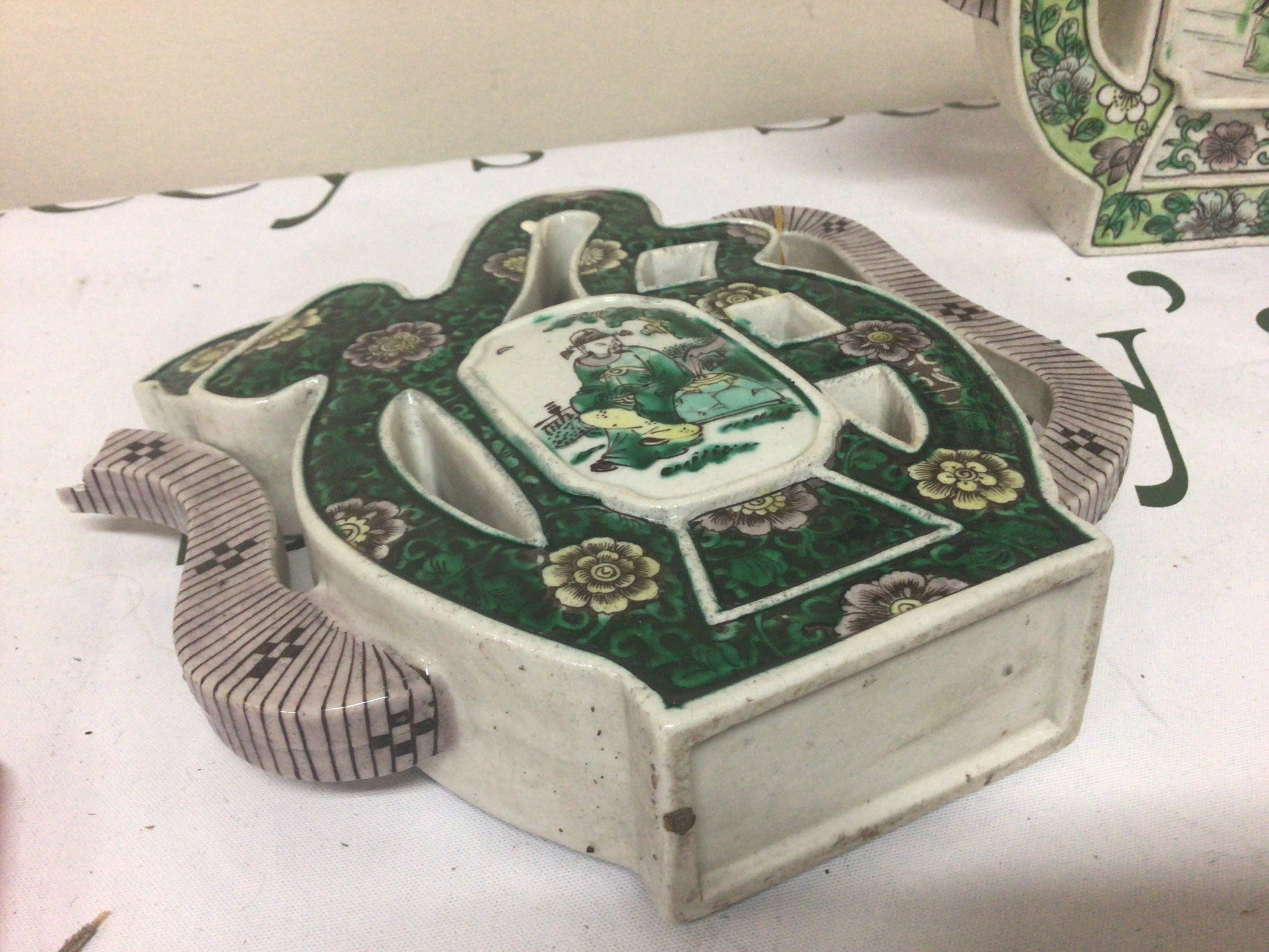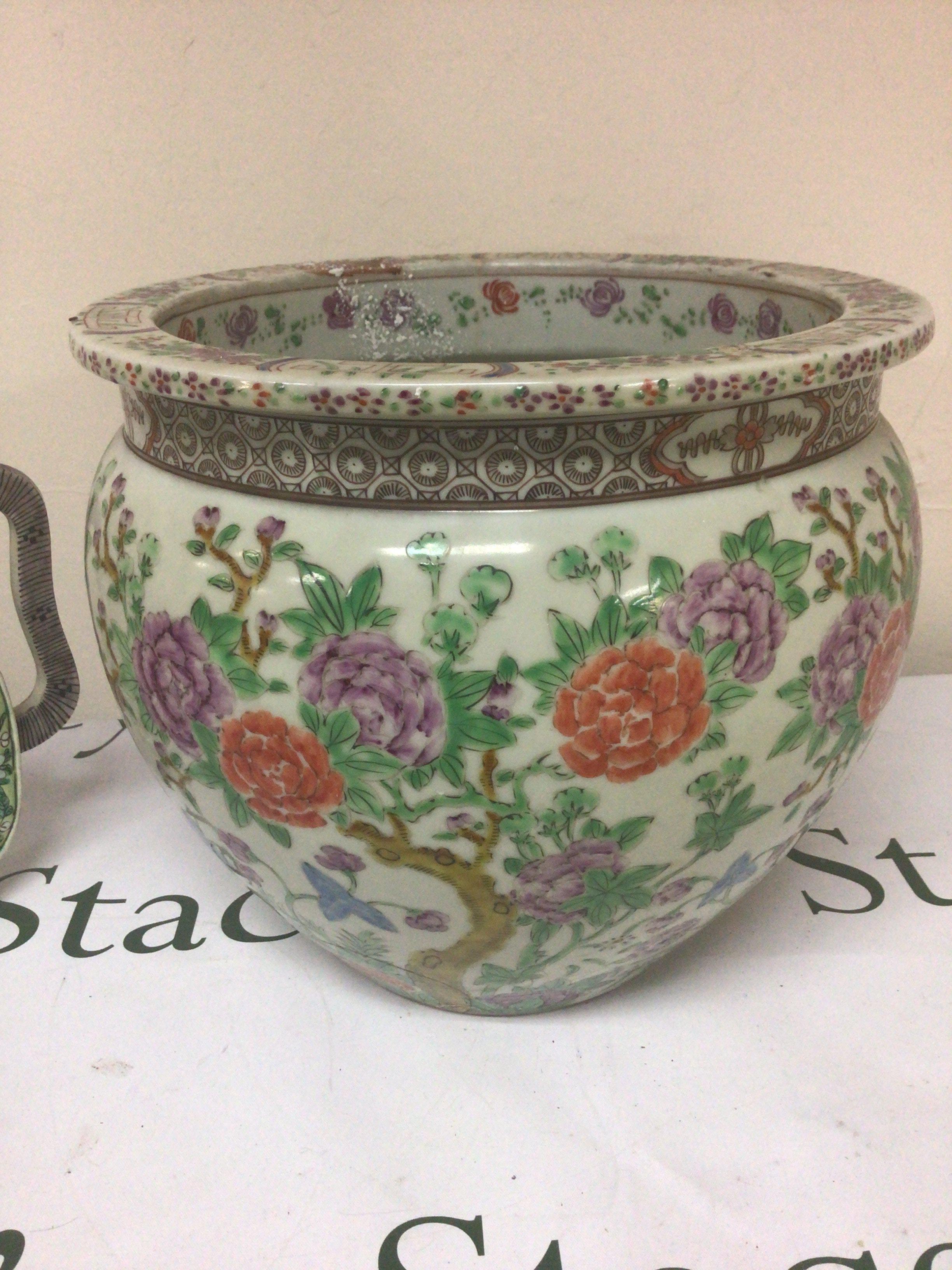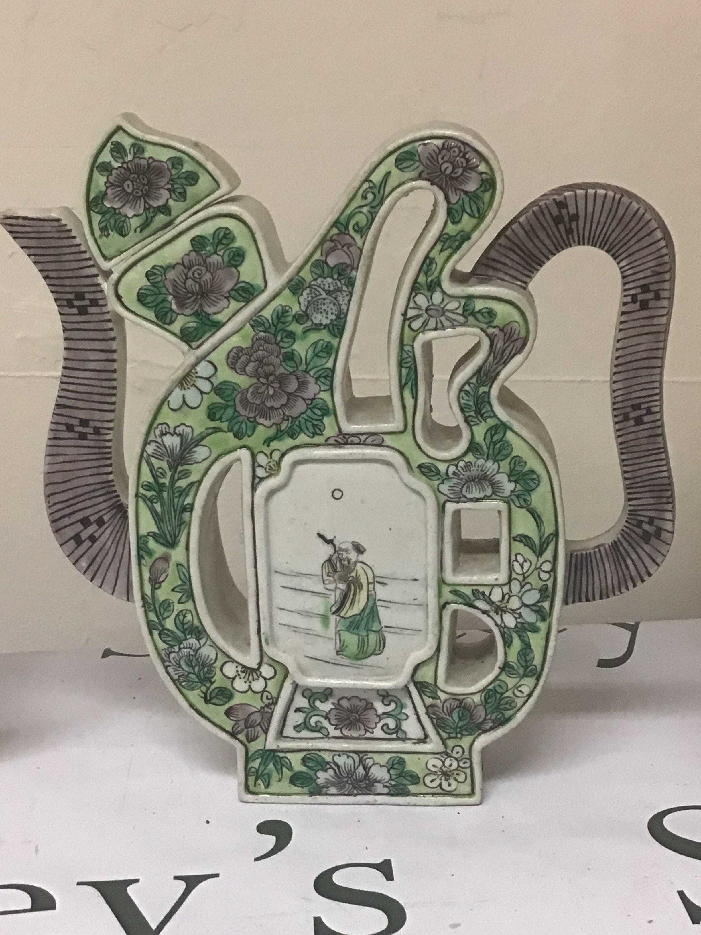 Two unusual shaped late Republic Chinese tea pots and a jardiniere (some damage)