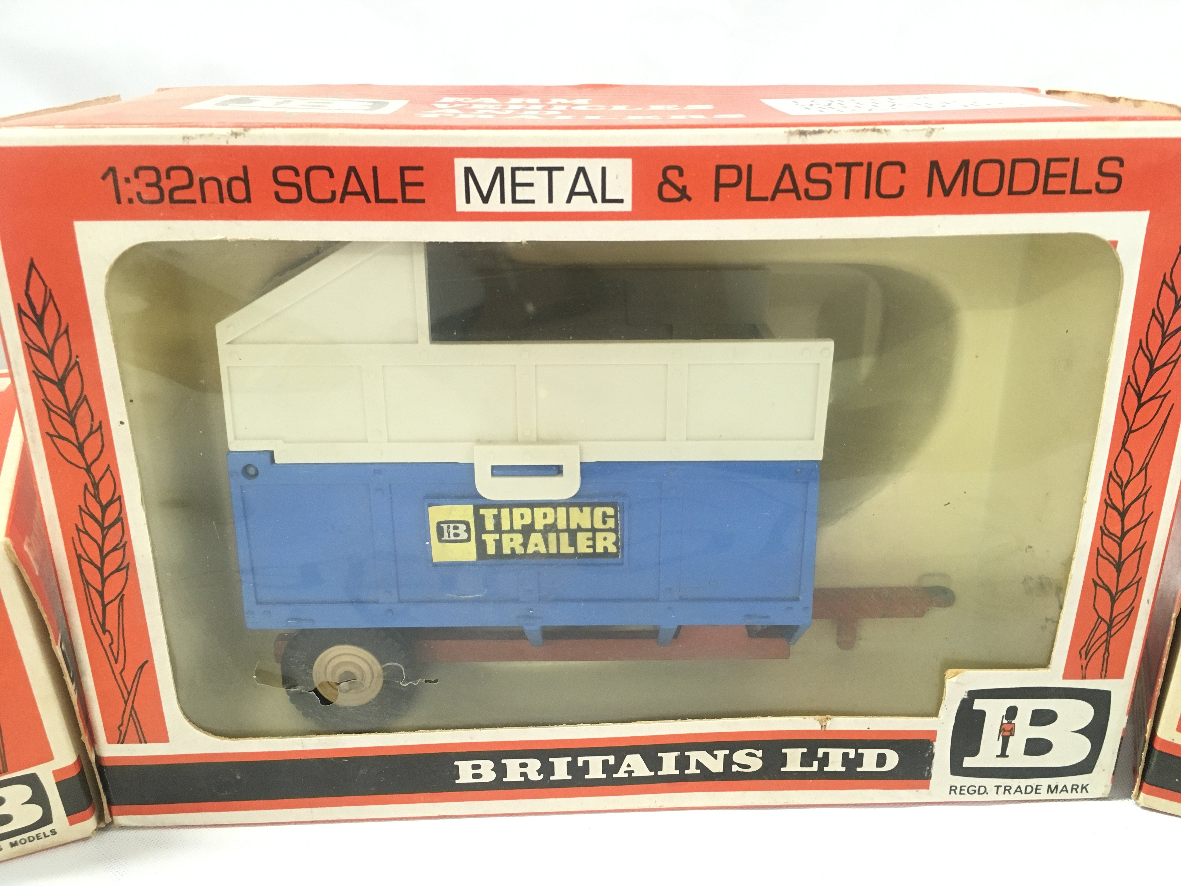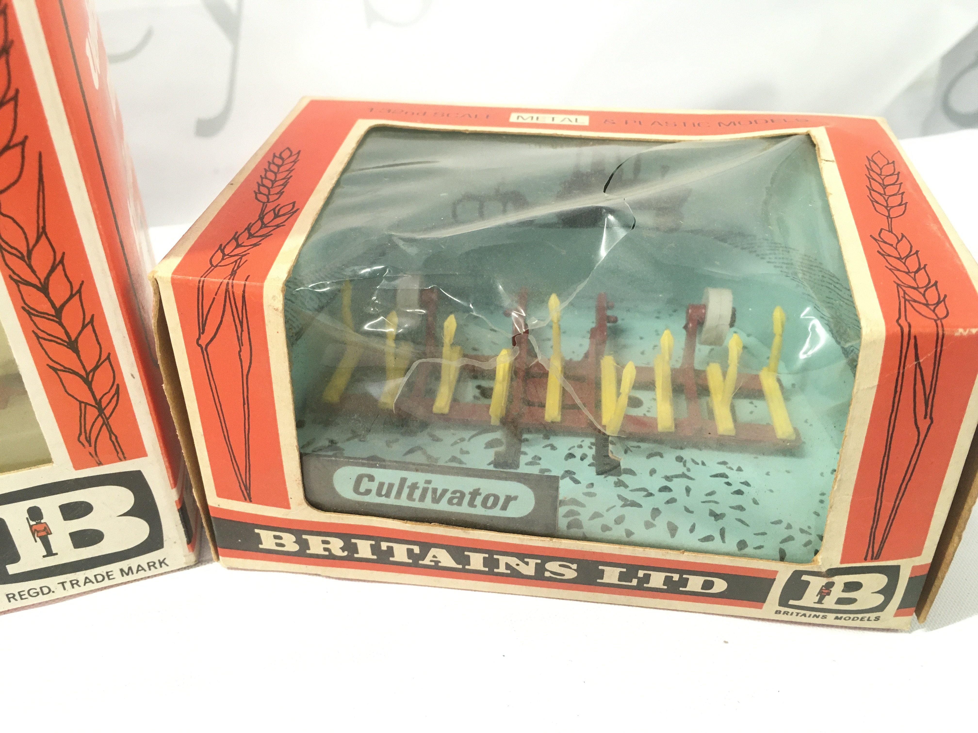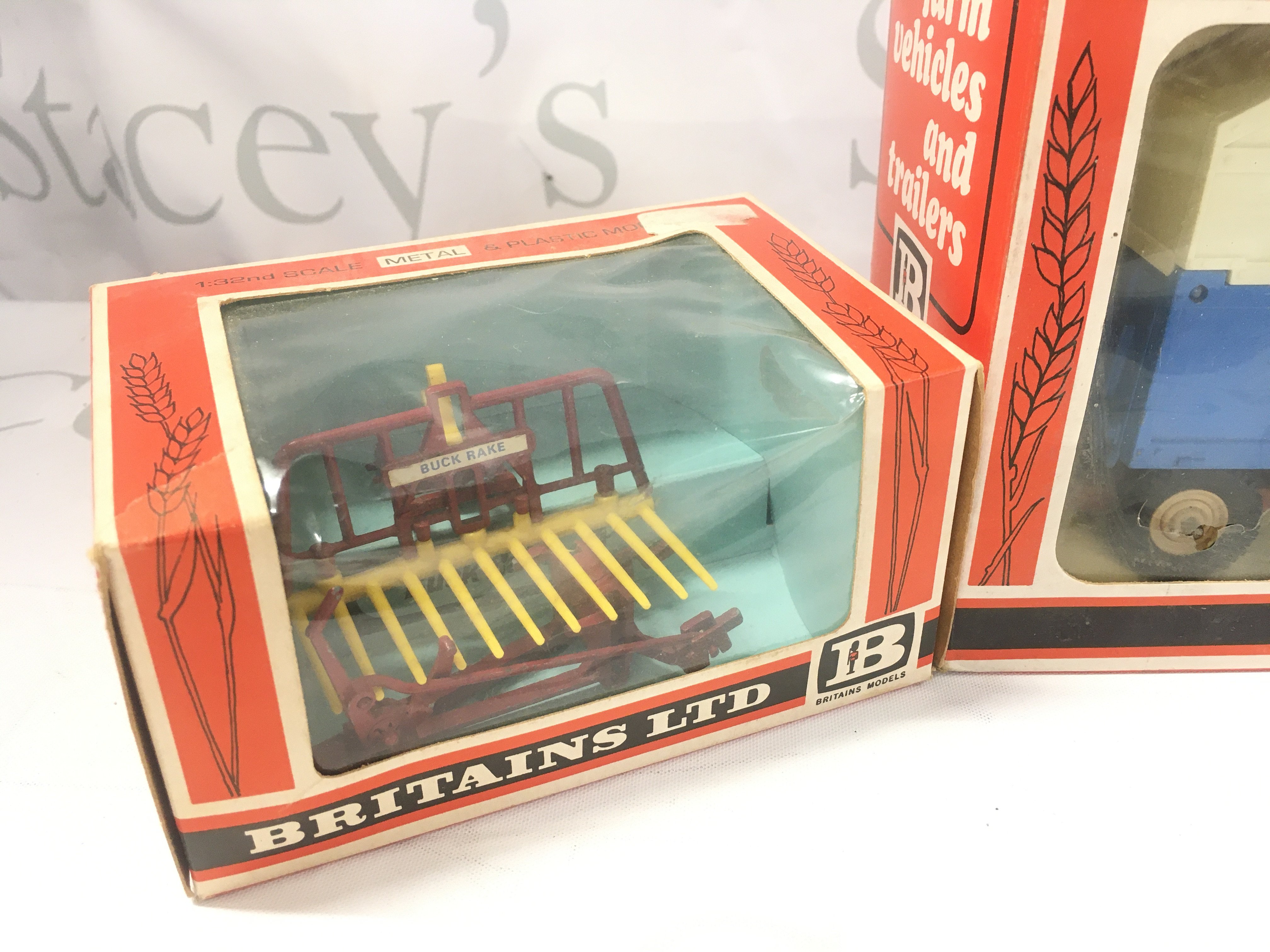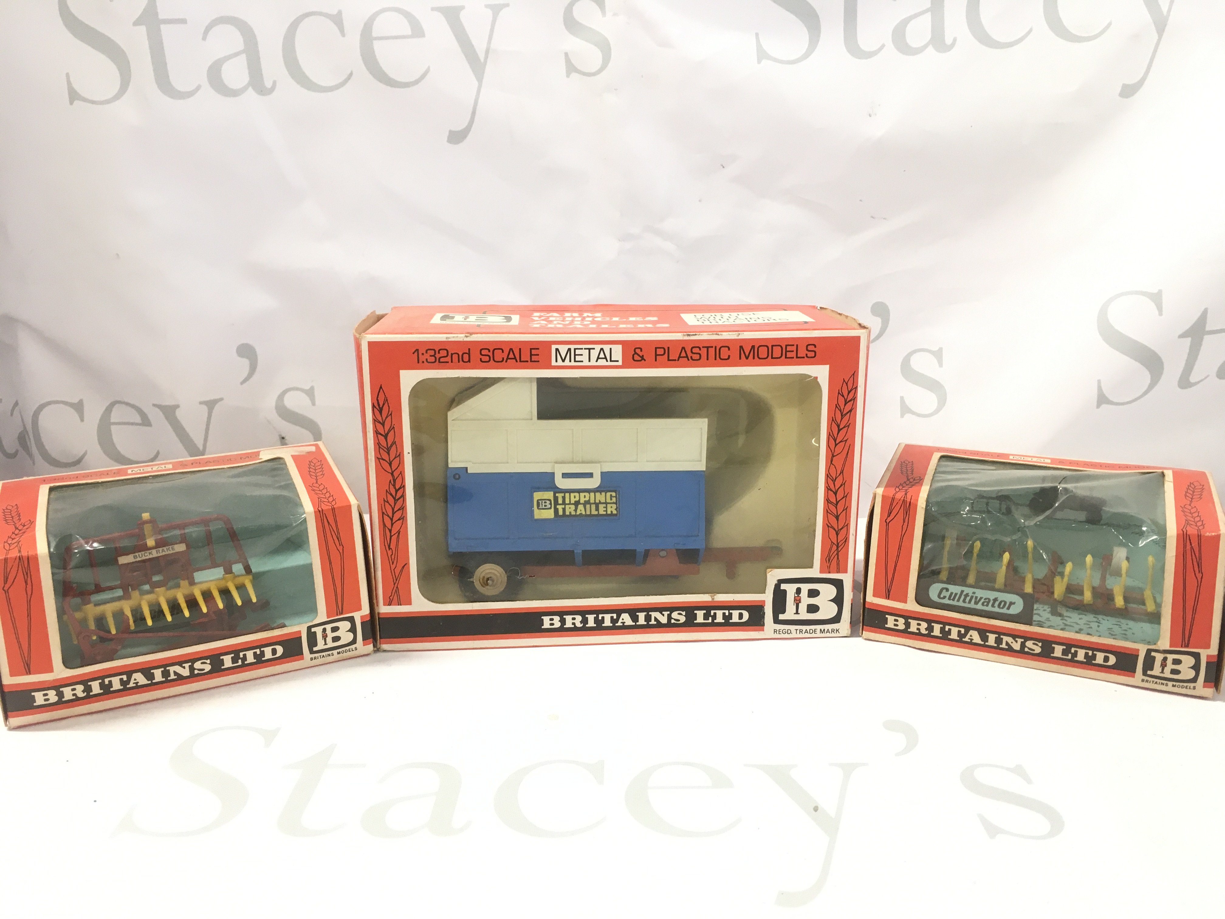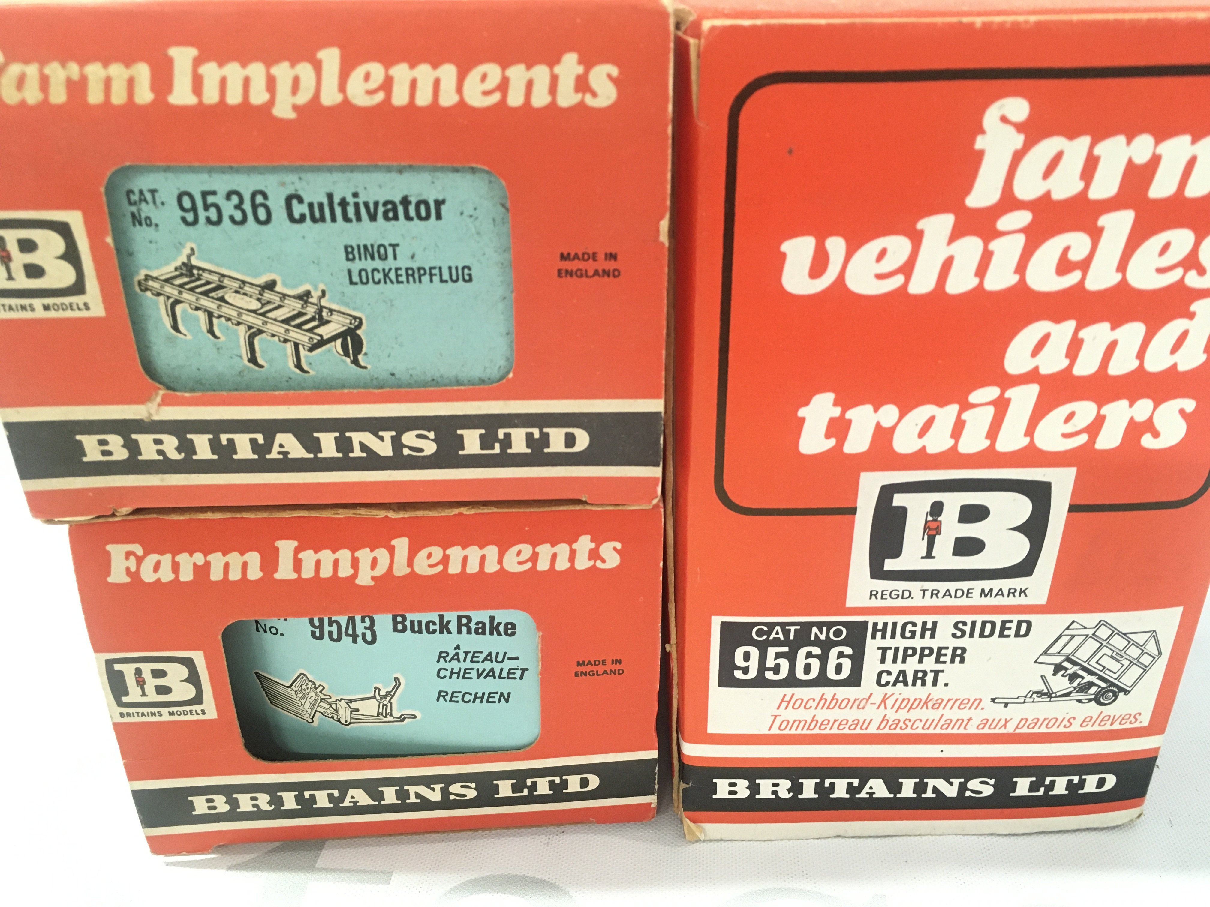 A Boxed Britains Buck Rake #9542. A Cultivator #9536 And A High Sided Tipper Cart #9566.