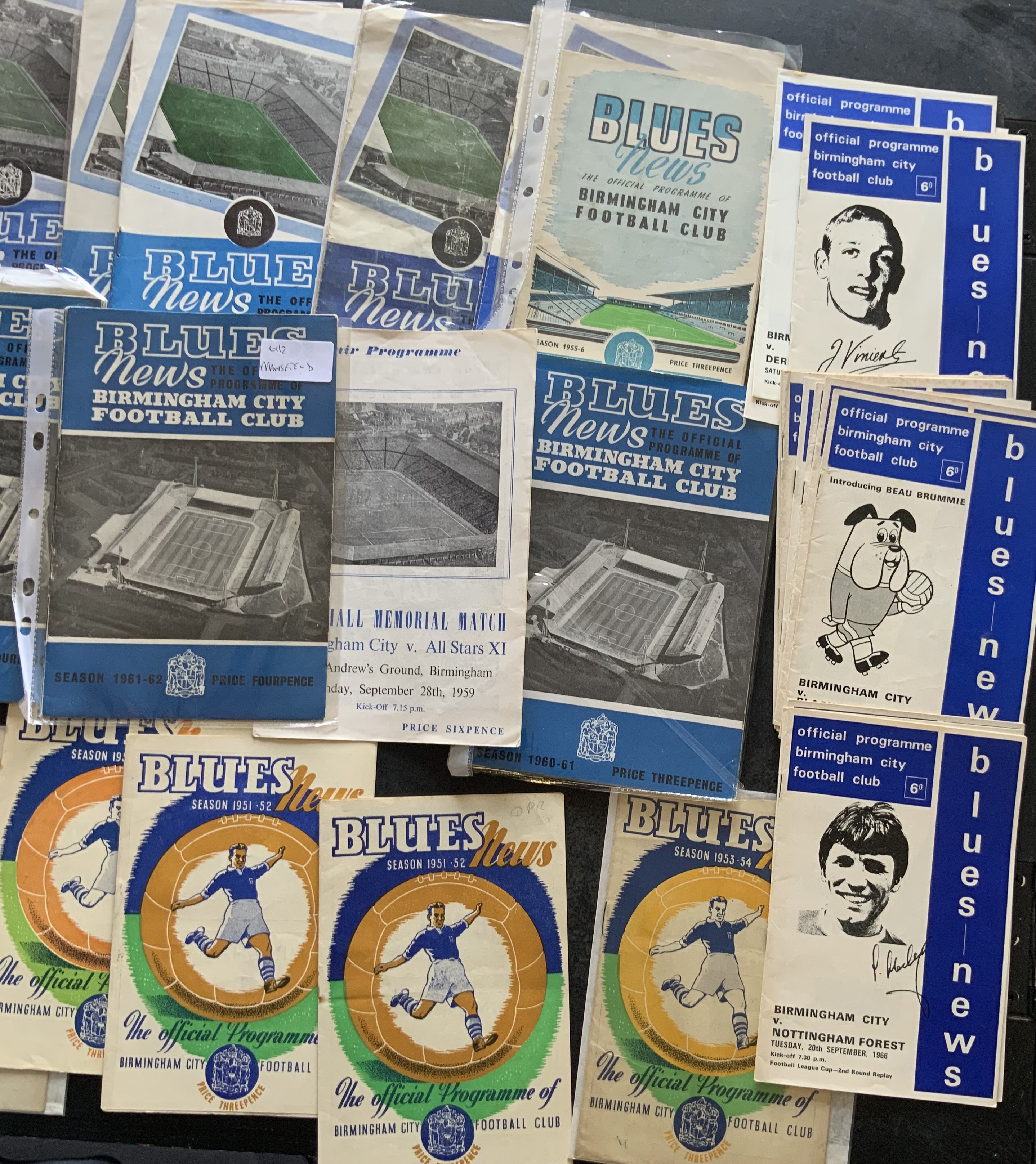 Barnsley + Birmingham Football Programme Collection: Barnsley collection covering 6 x 1950s, 16 x 1960s. 90/1 Joyce Testimonial and 97/8 in both League and League Cup. Good with no duplication. Birmingham City collection from 1951/2 onwards including; 26 x 1950s, 48 x 1960s and 12 x 1970s onwards. An even spread through the 50's with 17 being 1955/6 or earlier. All leage or cup issues with the odd friendly noted. Only minor faults noted, condition is mostly good. (117)