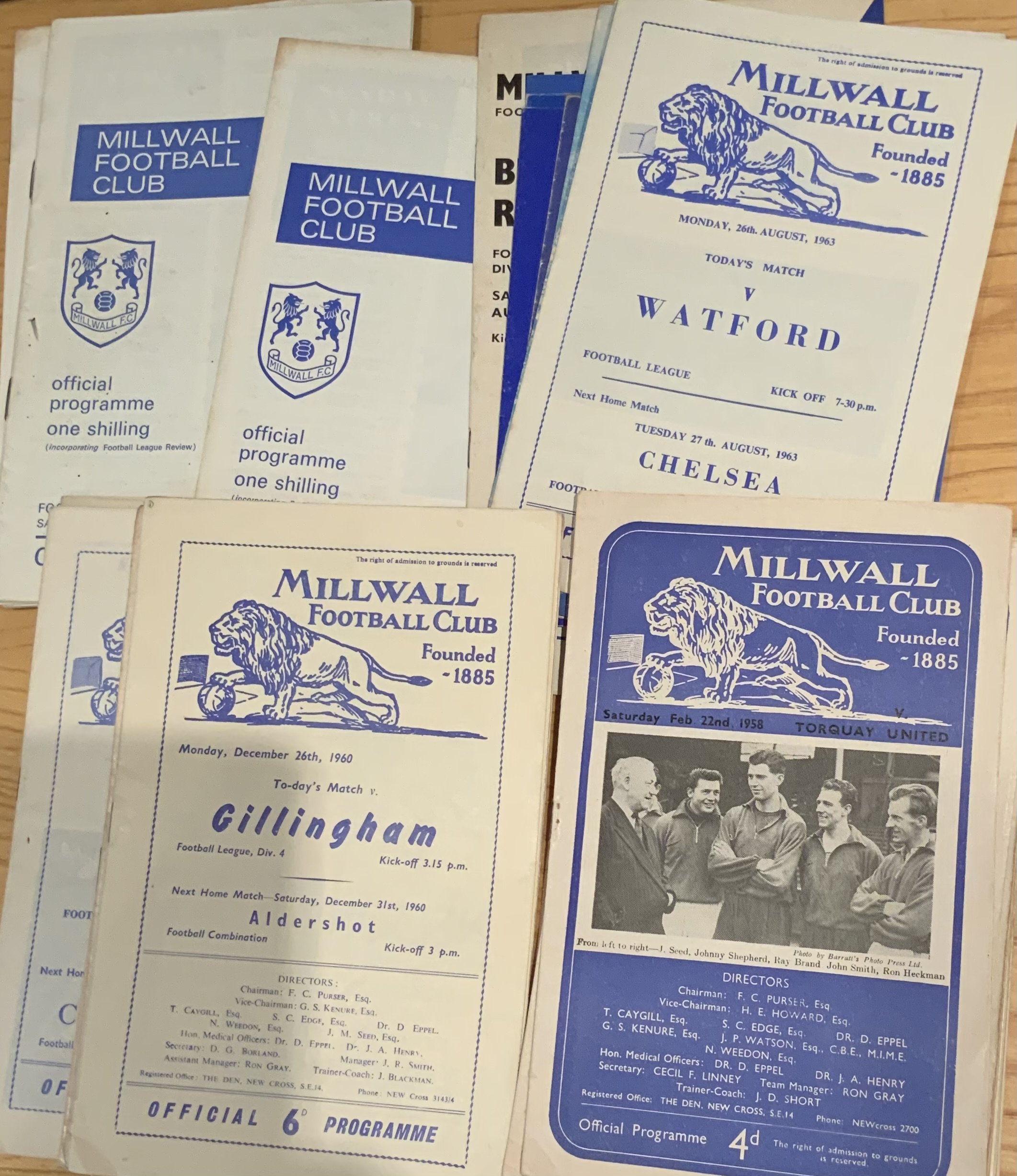 Middlesbrough + Millwall Football Programmes: Middlesbrough has 59/60 Scunthorpe, 31 x 1960s and includes 1961/2 Bonn Friendly and 9 x pink issues from 1962/3 season with four v Manchester Utd. Millwall has 45/46 Charlton, 49/50 Port Vale, 23 x 1950s, 29 x 1960s and includes friendlies v 66/67 Dundee, 55/56 QPR London Challenge Cup. Good with no duplication. (102)