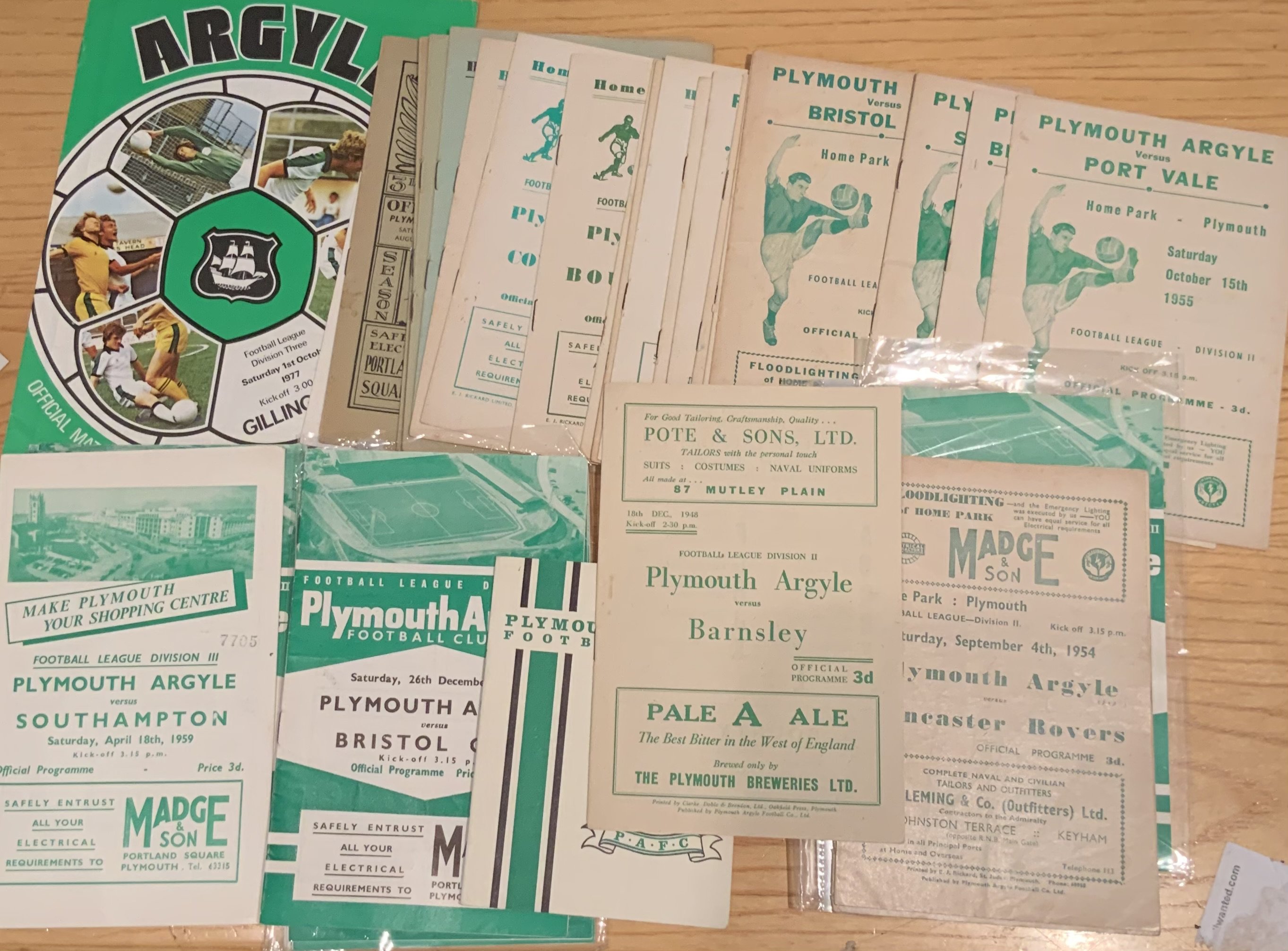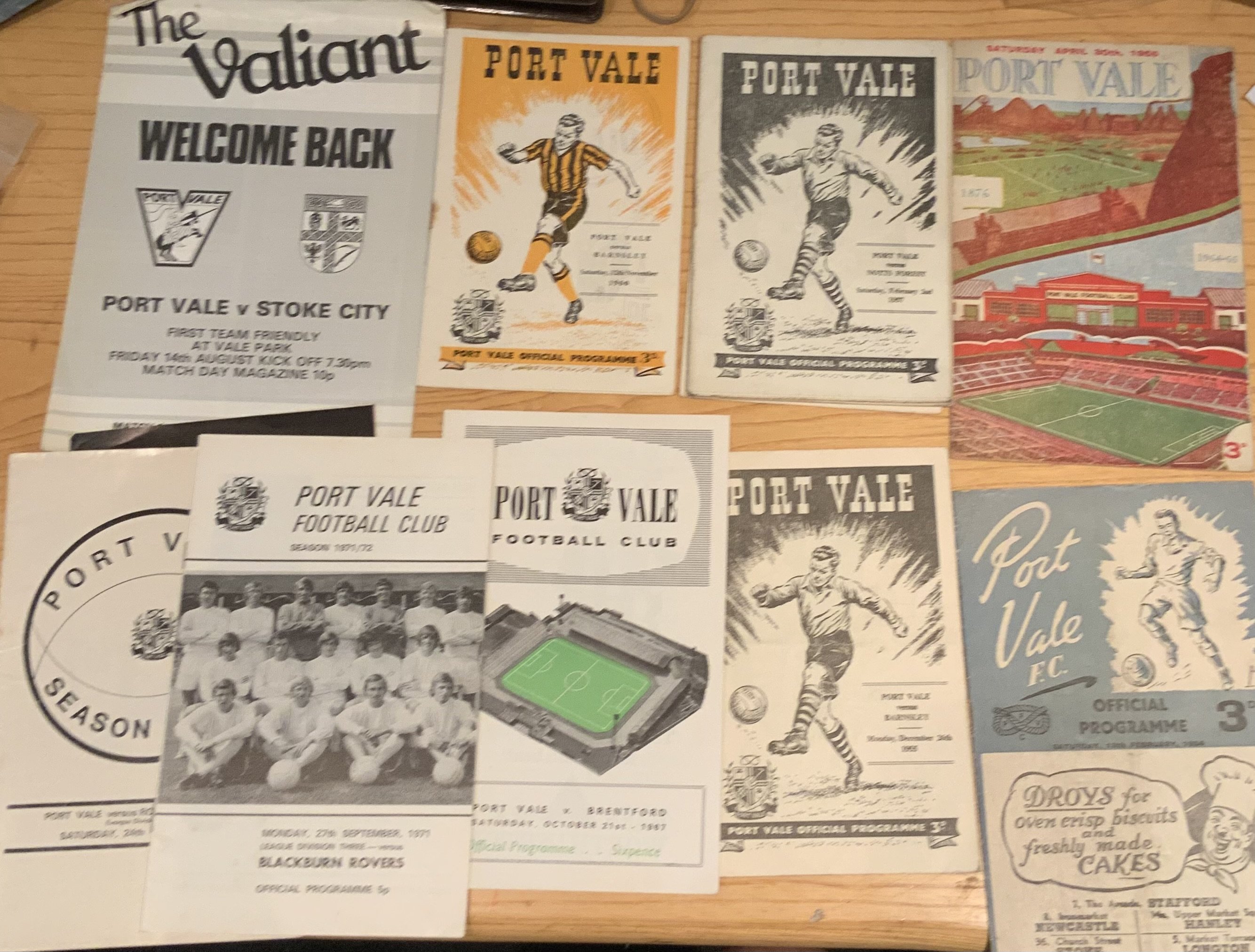Plymouth + Port Vale Football Programmes: Plymouth has 48/49 Barnsley, 28 x 1950s, 17 x 1960s and includes 54/55 Simmering, 55/56 West Ham. Port Vale has 7 x 1950s 13 x 1960s and includes 53/54 Scunthorpe, 58/59 Stoke Friendly and 1979/80 single sheet Forfar. Good with no duplication. (84)