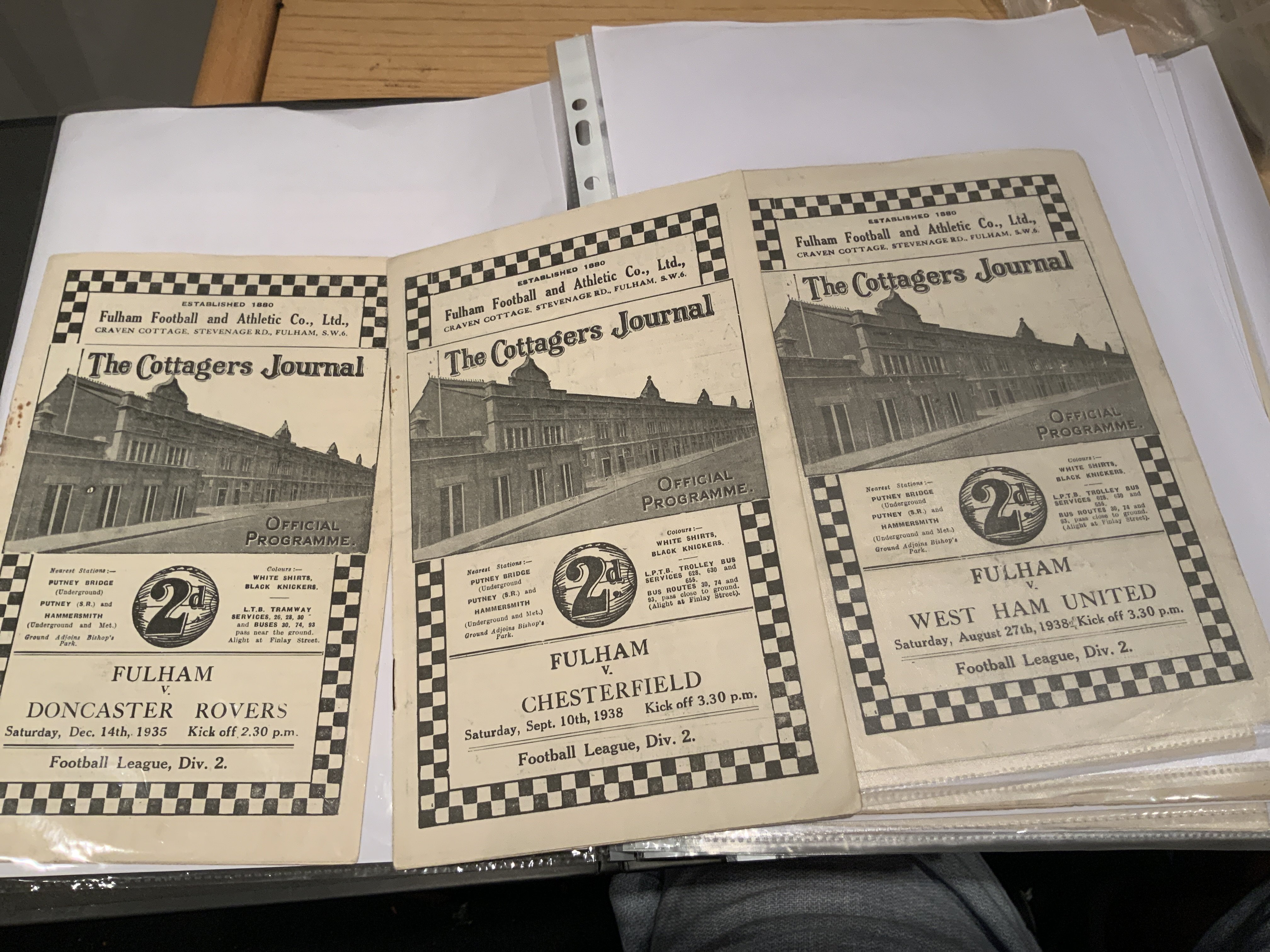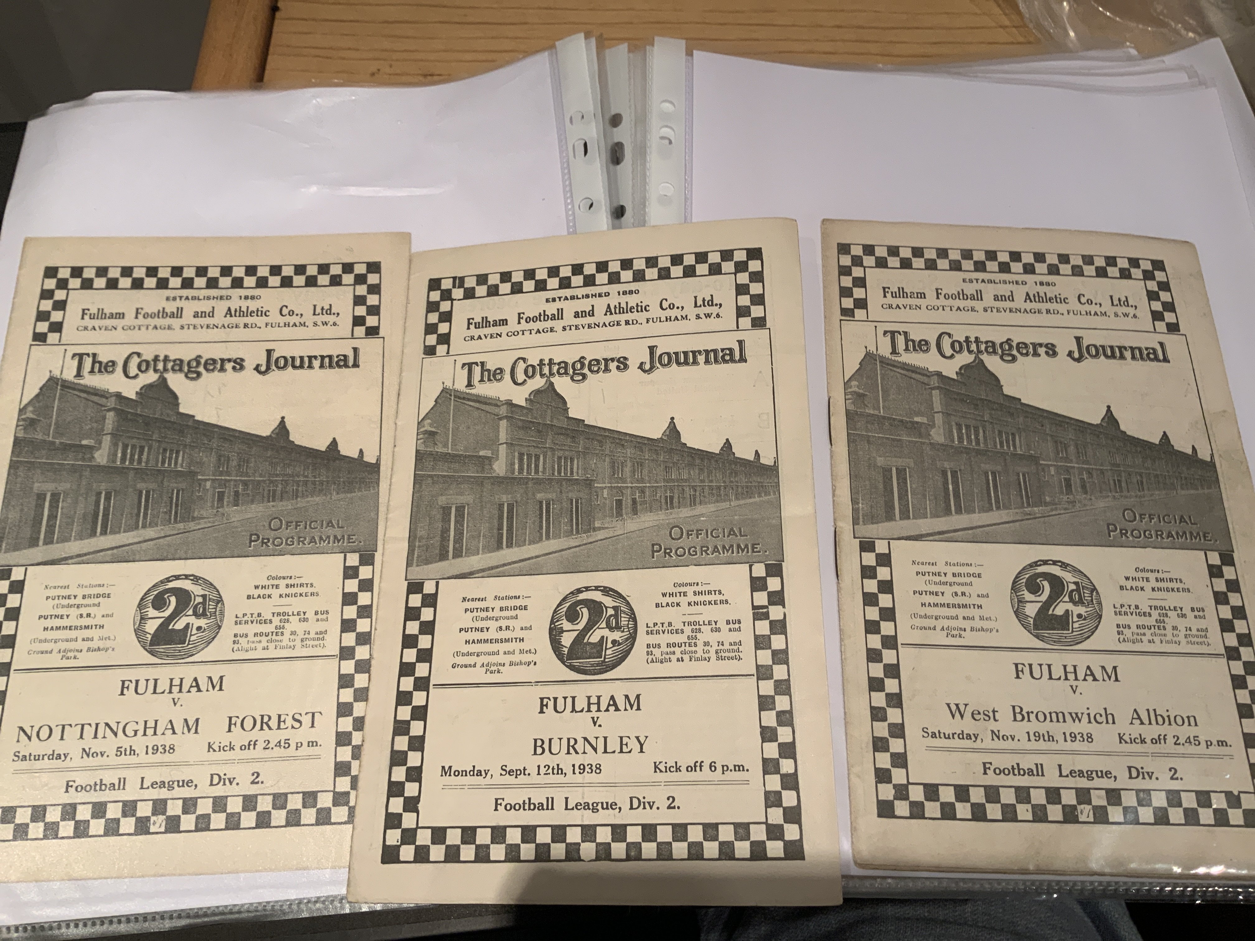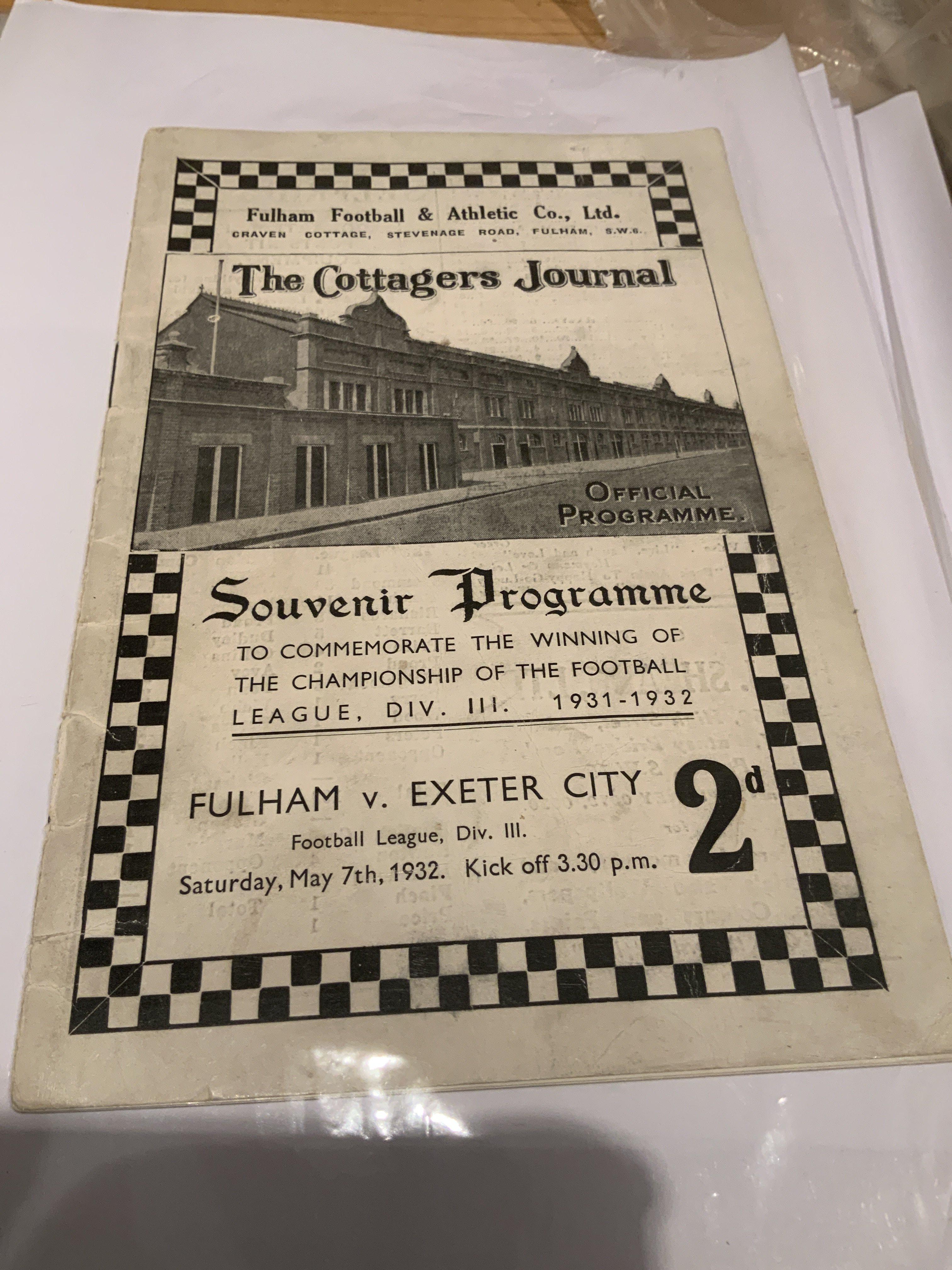 Fulham Home + Away Football Programme Collection: Pre war x 9 Including 31/32 Exeter Promotion Special which has 14 good autographs on the pen pictures inside. 8 mid to late war time. Complete seasons of homes 45/46 x 24, 46/47 x 25 and includrs fuel emergency and practice match, 47/48 x 26, 48/49 x 23, 49/50 x 25. 1950 x 160, 1960s x 200, 1970s x 177 plus 1980s x 115. Aways include 1940s x 32, 1950s x 82, 1960s x 164, 1970s x 172. Private collection with no duplication. Spotted handbooks and folders of benefit matches etc. Very good. (1238)