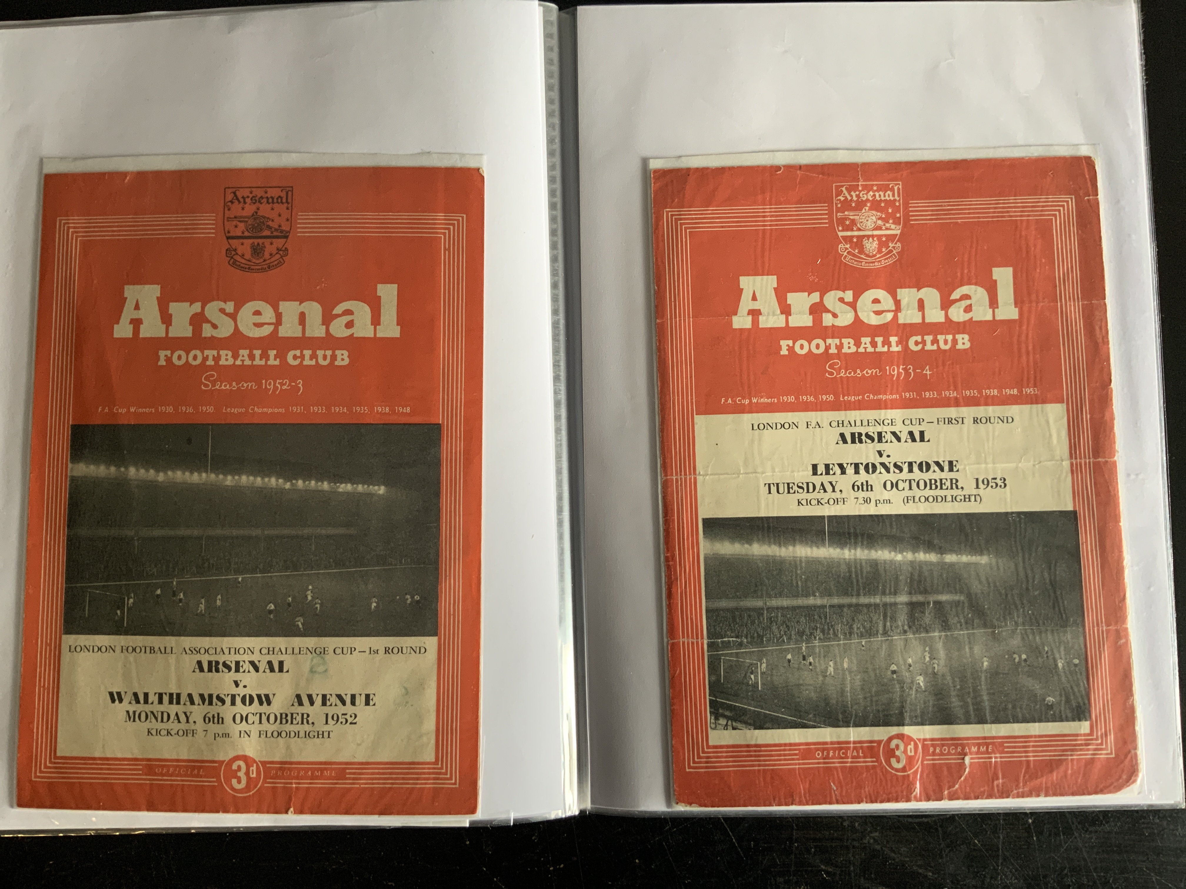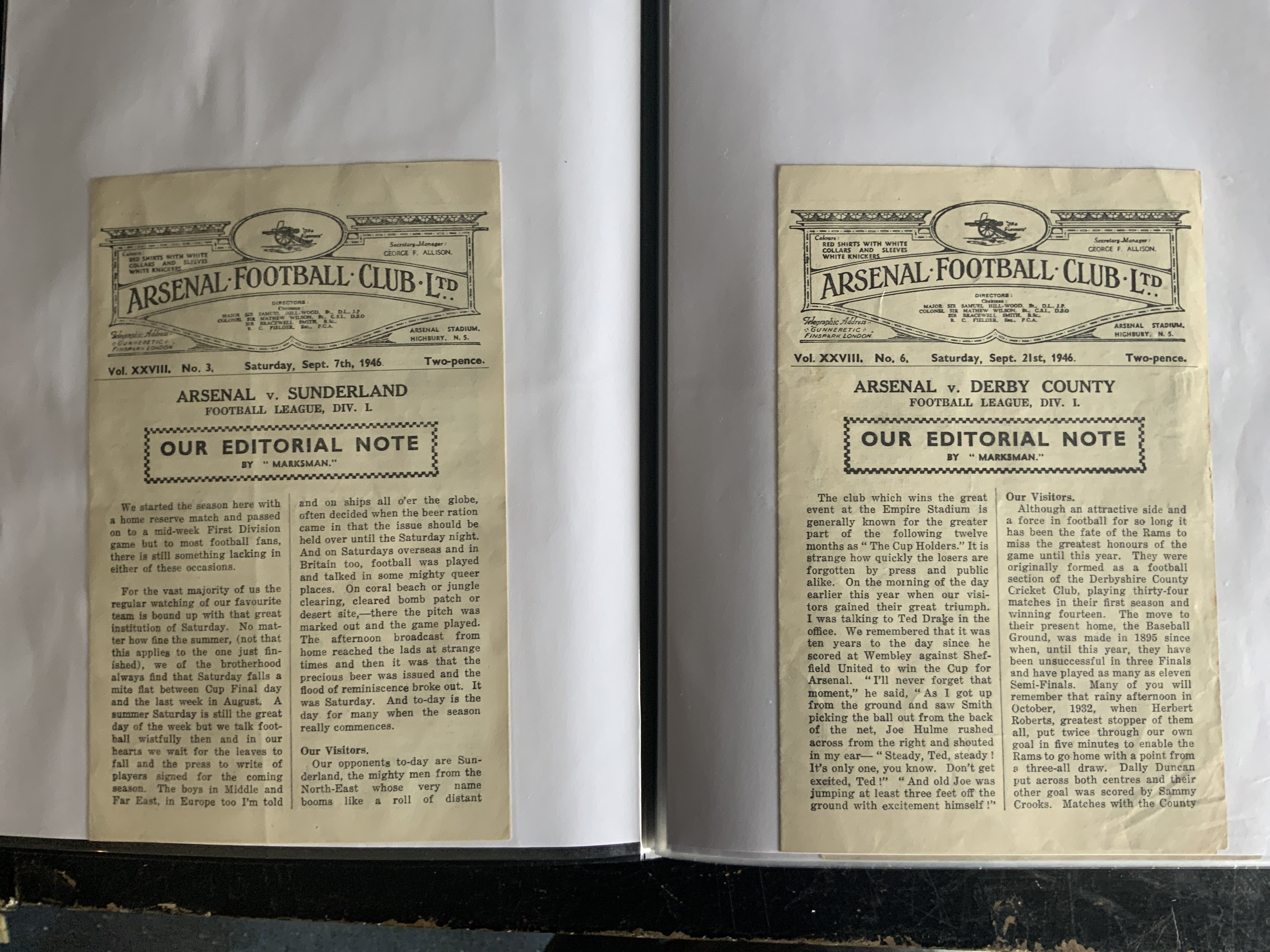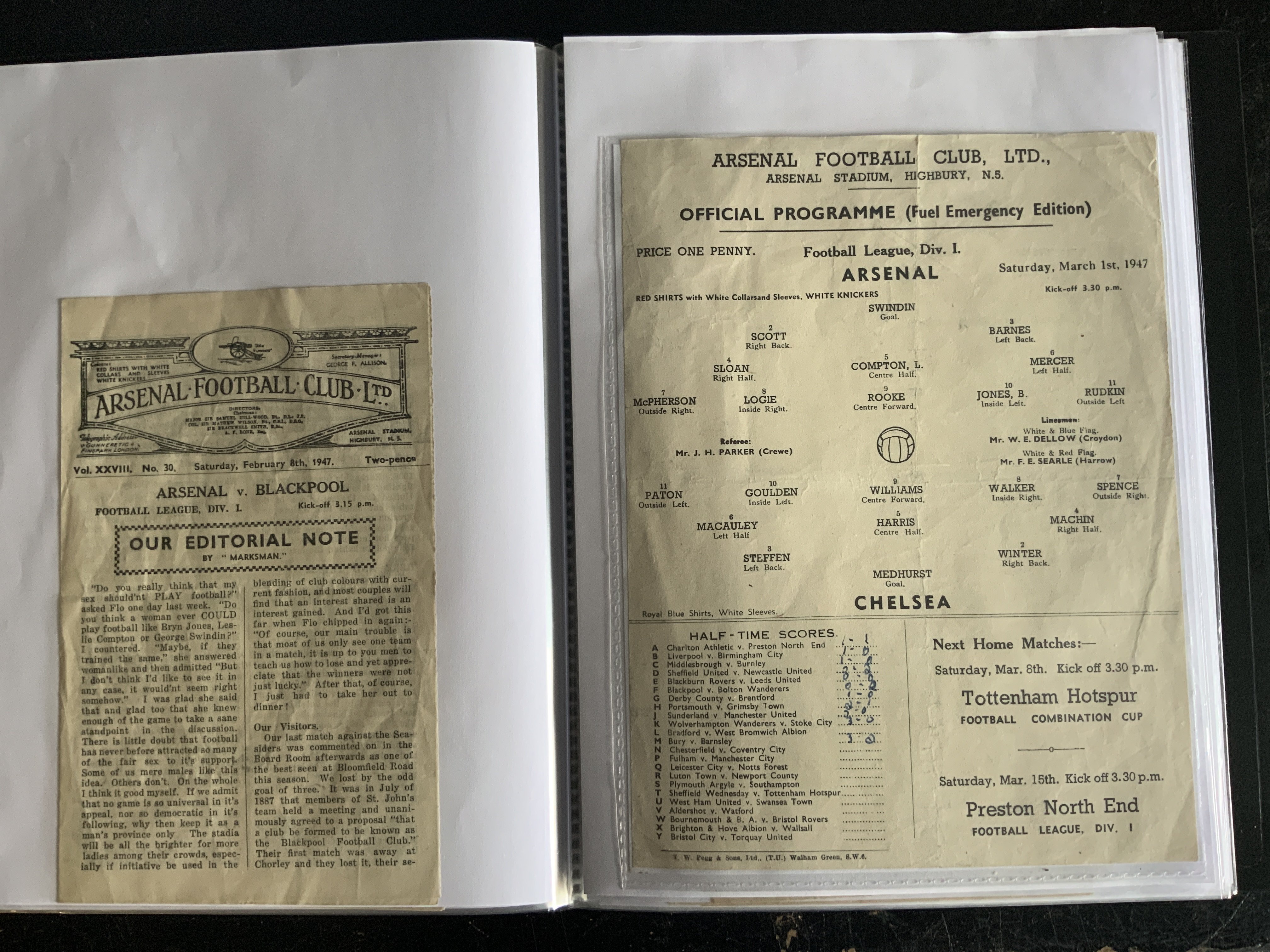 Arsenal Home Football Programme Collection: 46/47 x 22 in excellent condition which includes Chelsea fuel emergency Issue, Manchester Utd, Liverpool, Leicester friendly and only missing Leeds for all league matches. Other 1940s x 39, 1950s x 158, 1960s x 168 and a quantity of more modern with big match issues European, Last game at Highbury etc. C/W an excellent incomplete run of handbooks from 48/49 to 2012/13. (800+)