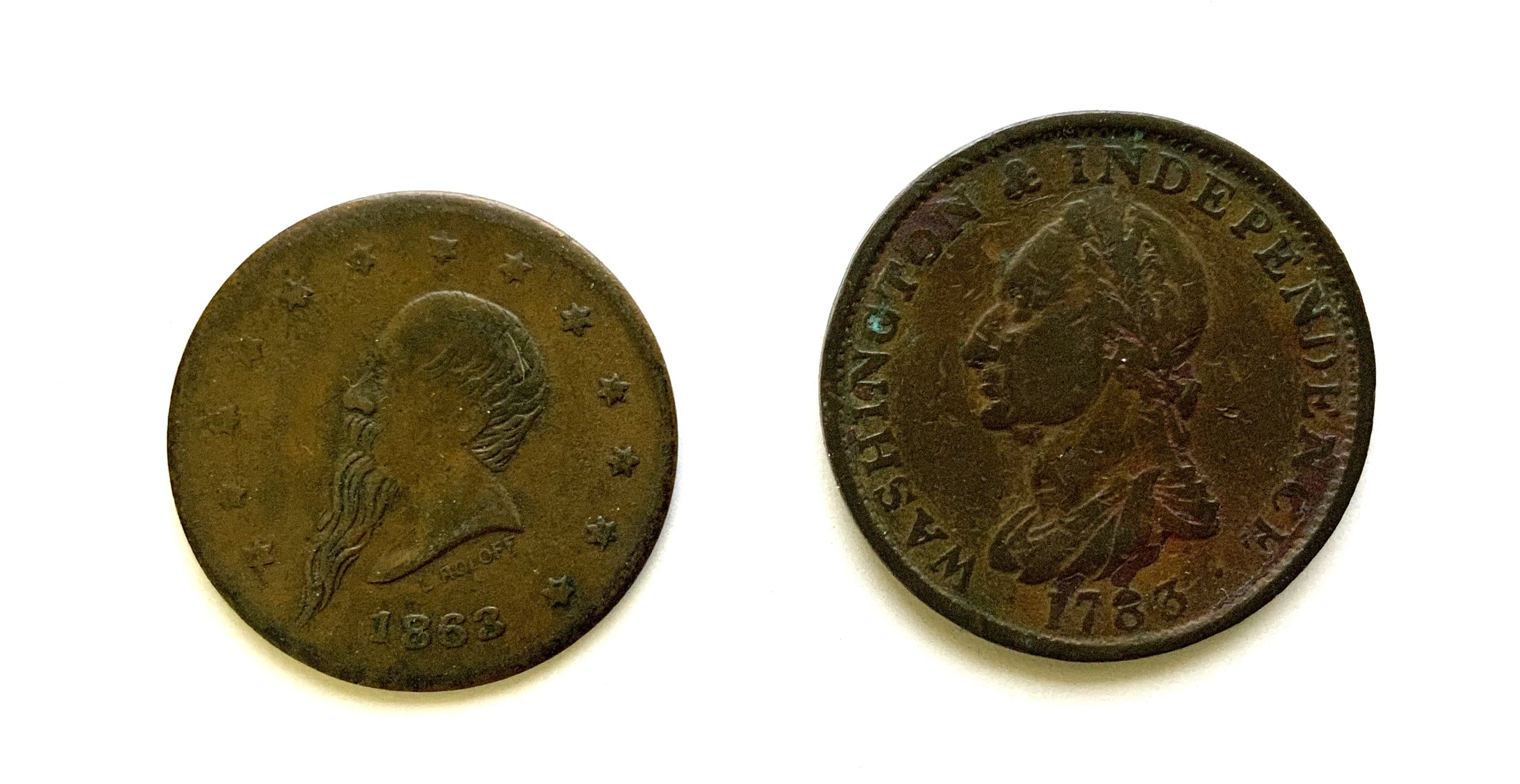 1863 Gustavus Lindenmueller New York Civil War US Trade Token Together with a Washington and Independence re-strike token.