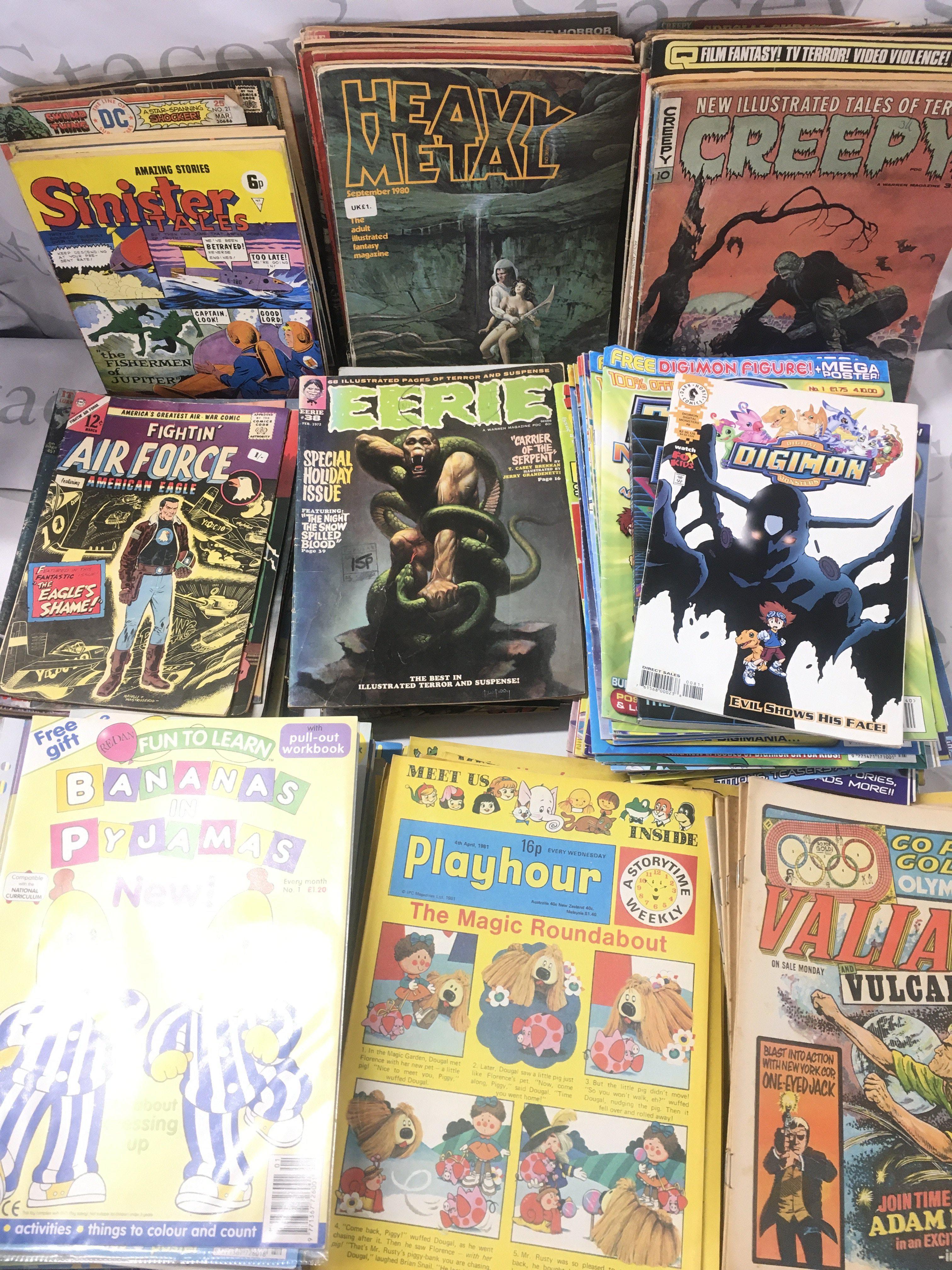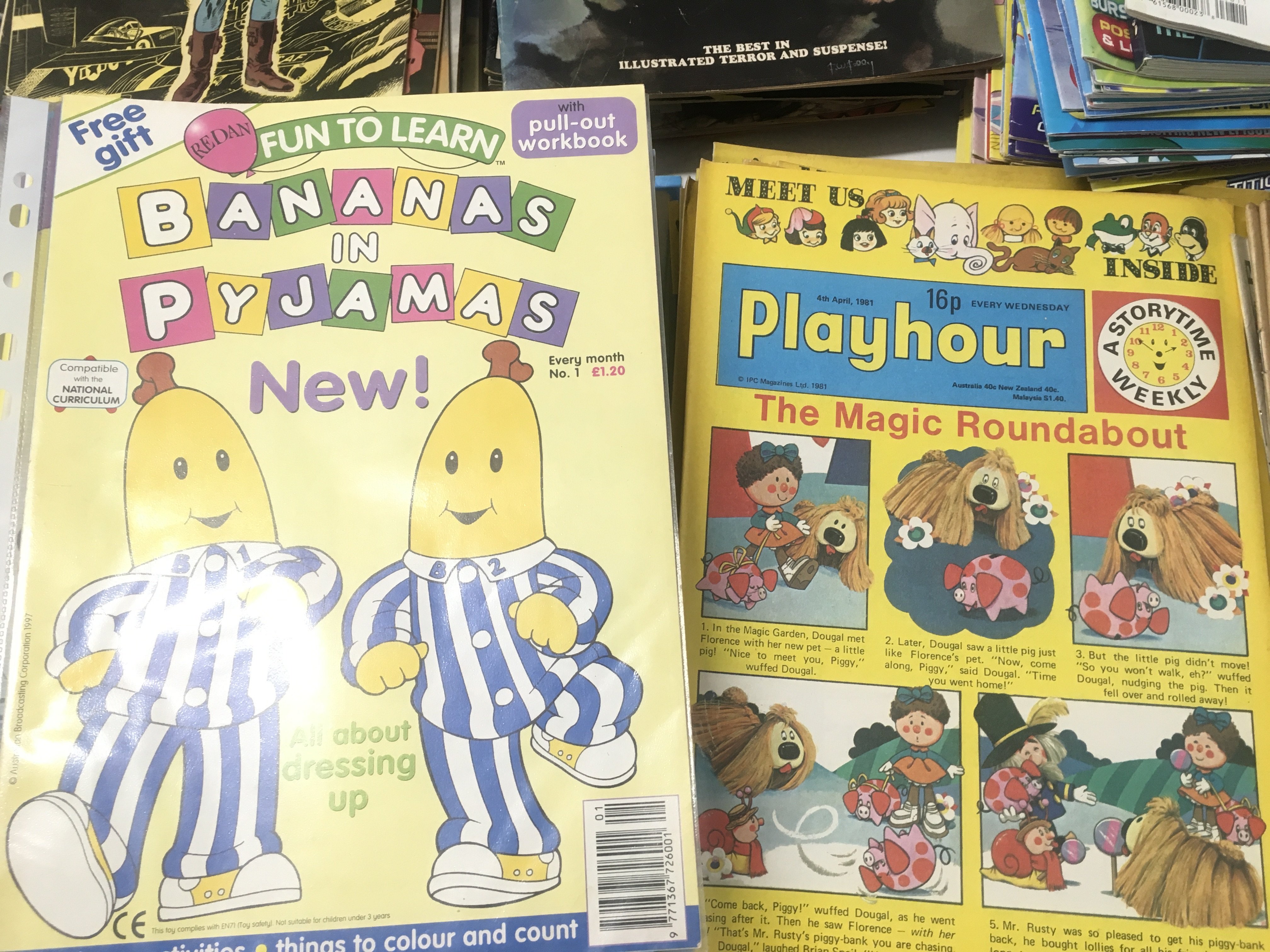 4 X Boxes Containing Various Comics. Bananas In Pyjamas #1.Digimon. Playhour. Valiant. World Of Knowledge. Look in. Etc. No Reserve. (4).