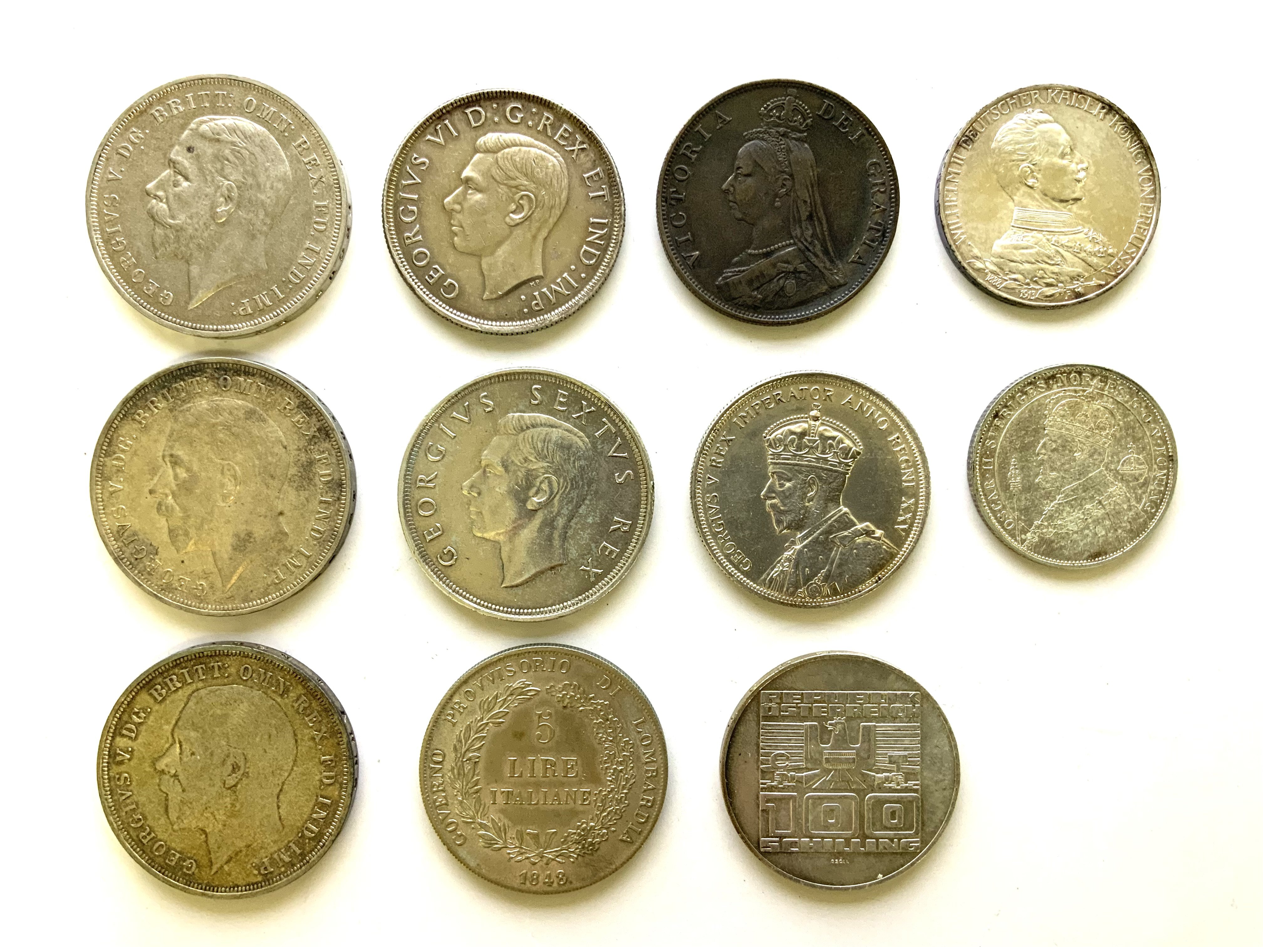 A Collection of British, Commonwealth and world silver coins to include 3 1935 crown edge inscription Regina XXV, 1889 Crown,1935 and 1937 Canada Dollar, 1949 South African 5 Shillings, 1913 Prussia Germany 3 Mark Silver coin, Swedish 1897 2 Kronor silver jubilee coin, 1977 Austrian 100 Schilling silver coin, 1848 Italian states 5 Lire silver coin.