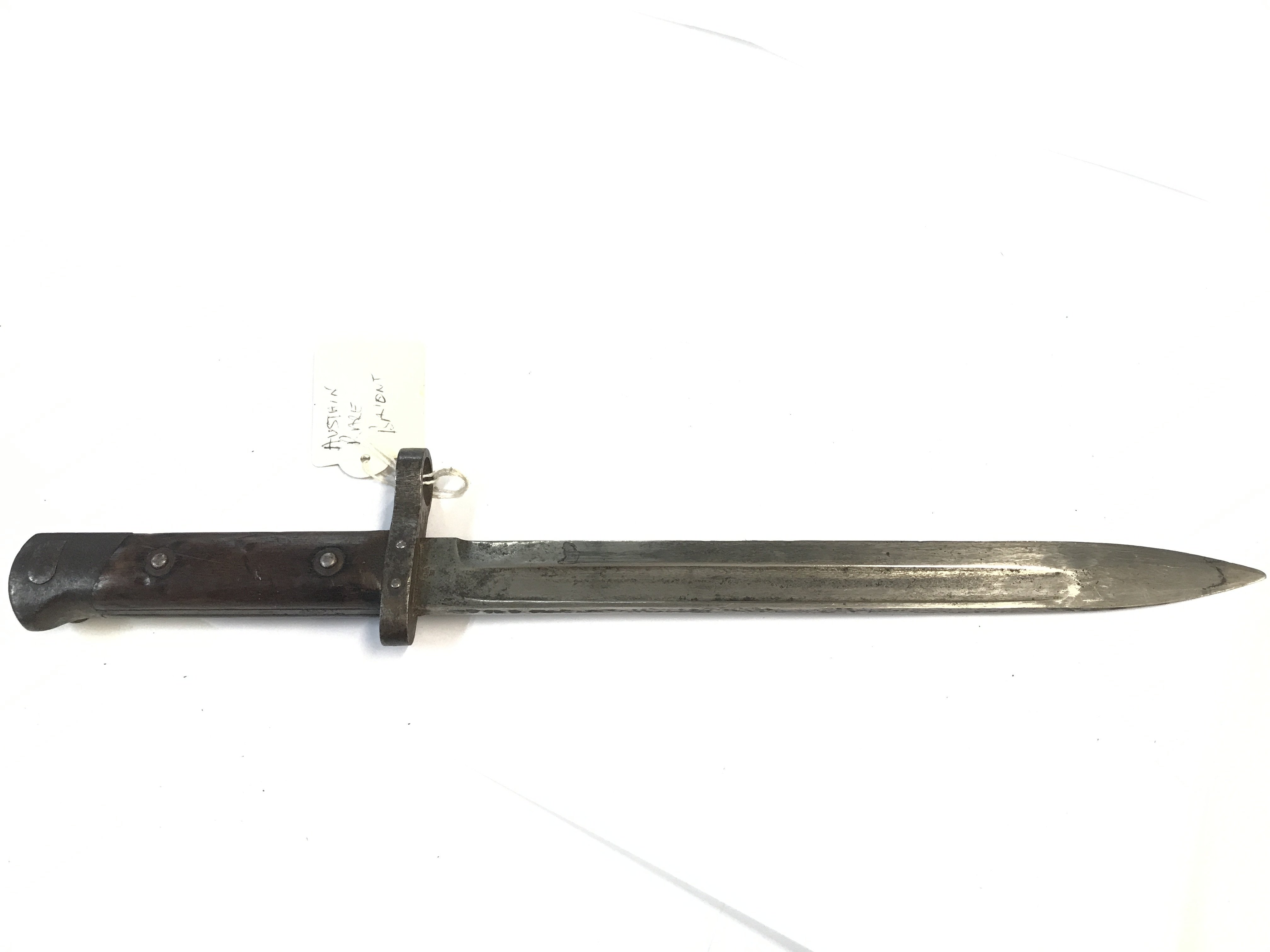 An Austrian Imperial German bayonet possible an early M84 model with wood grip steel scabbard some marks to the blade.
