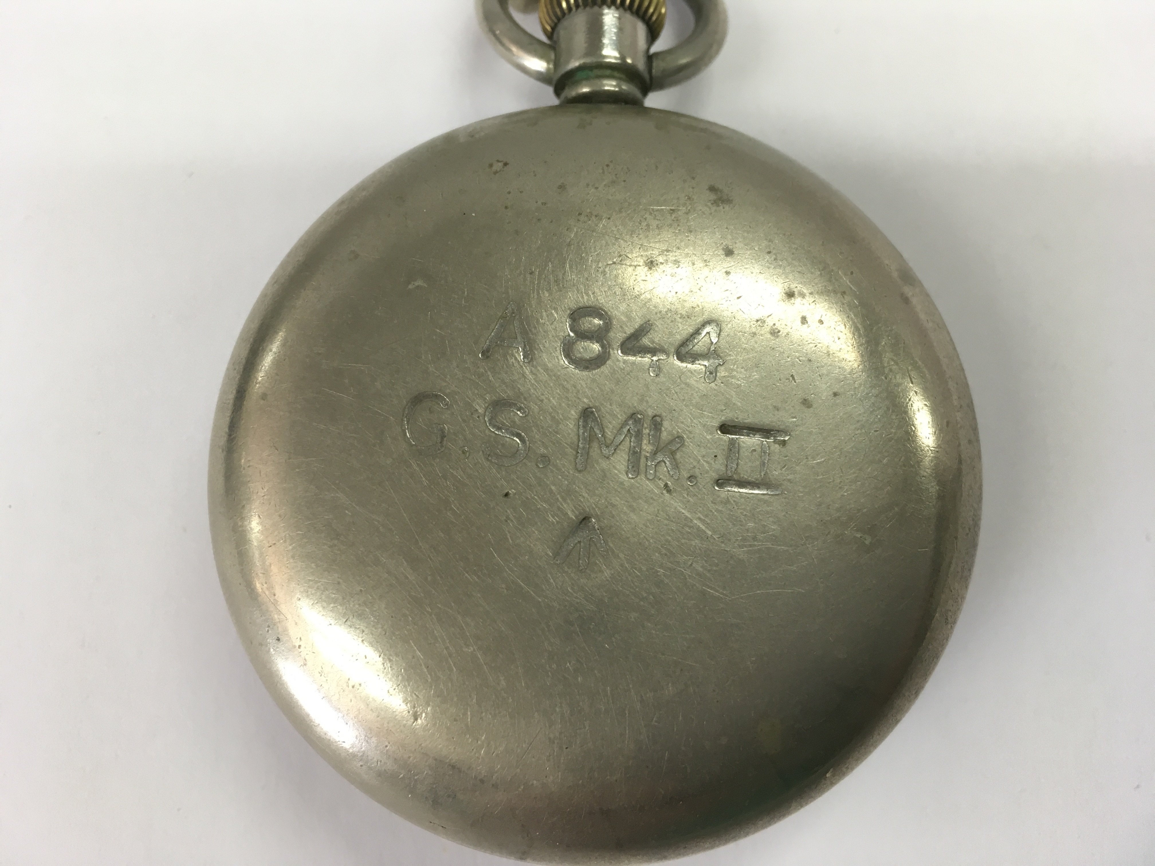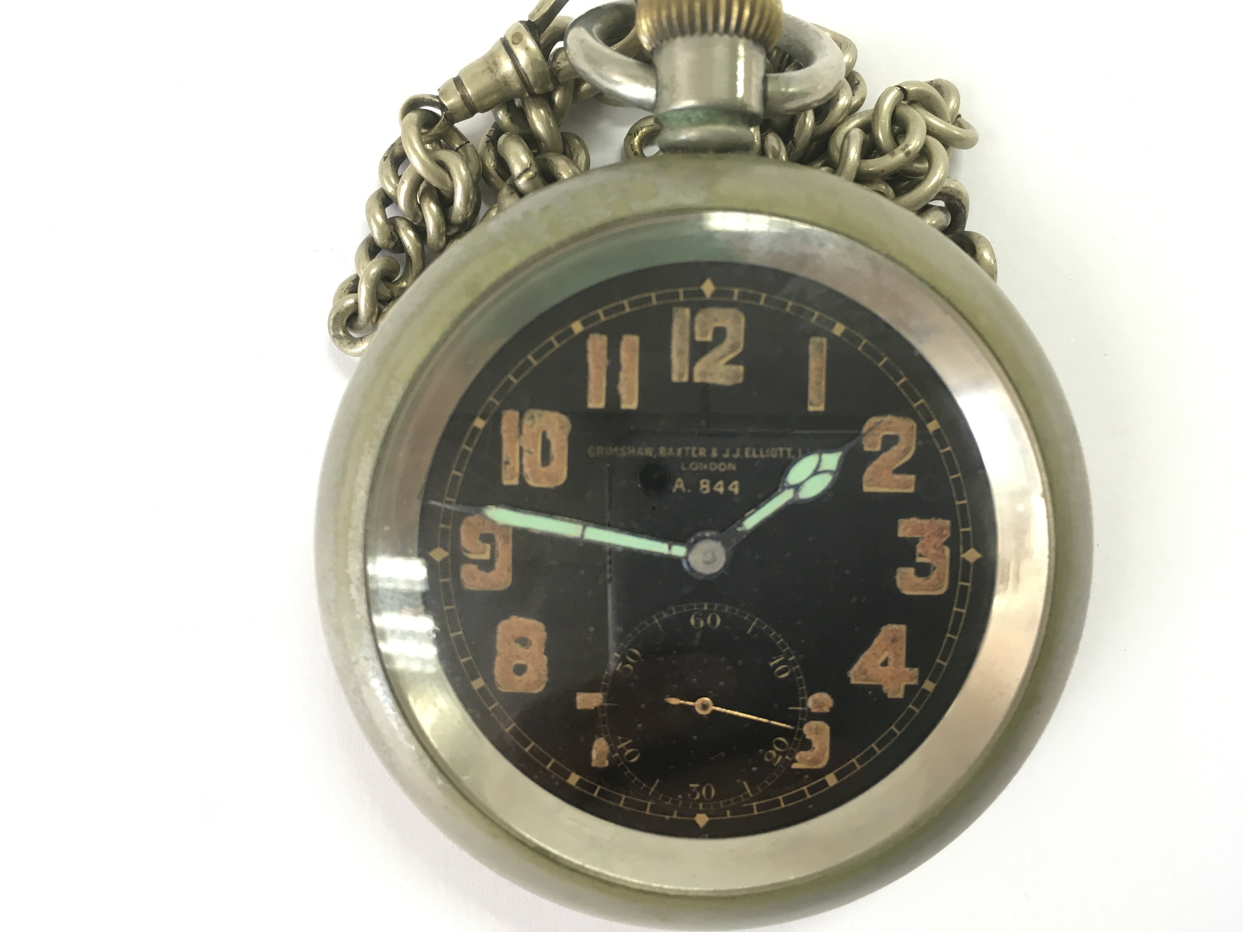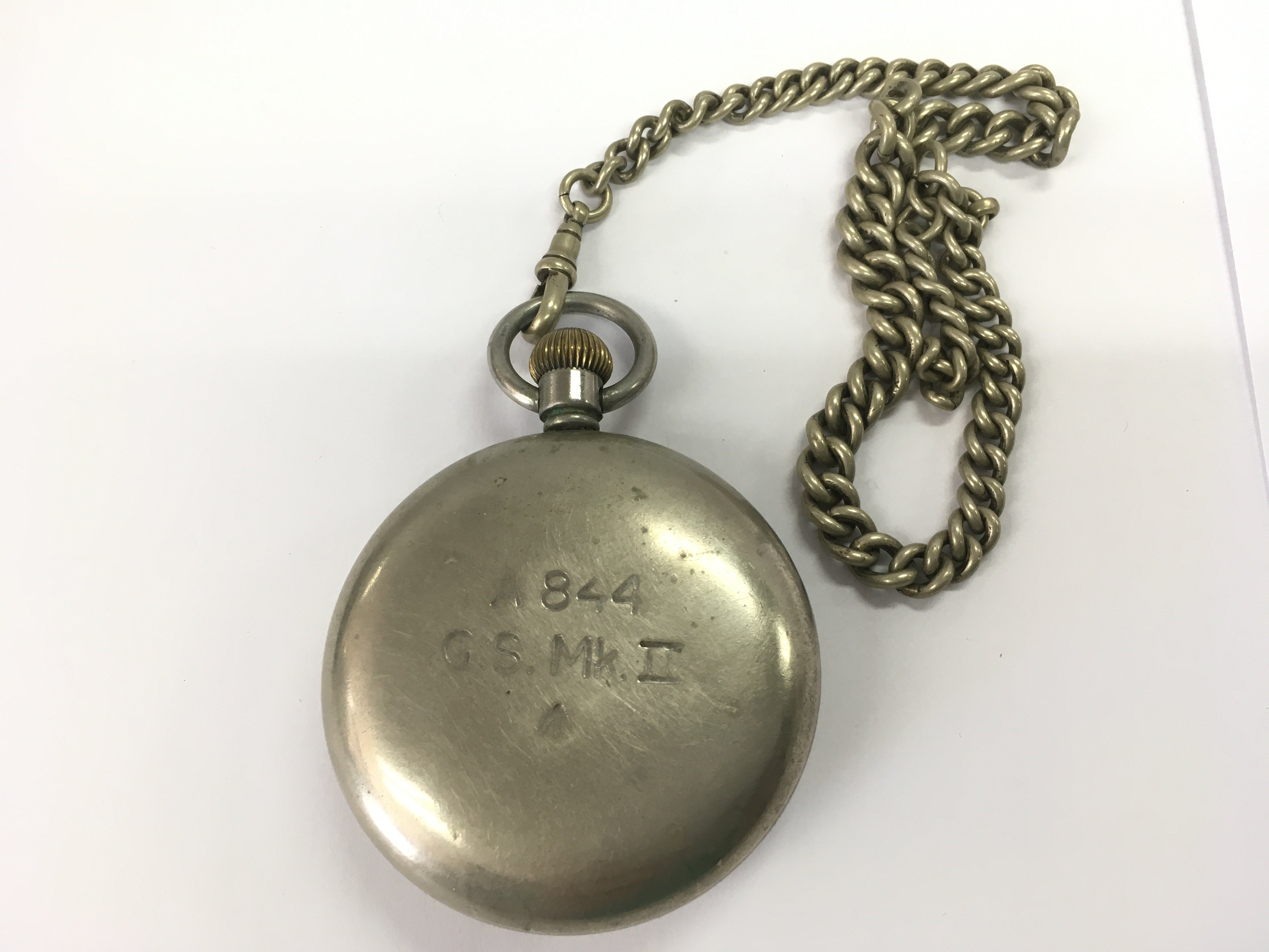A military pocket watch with chain attached. Winds and runs. Approximately 55mm diameter.