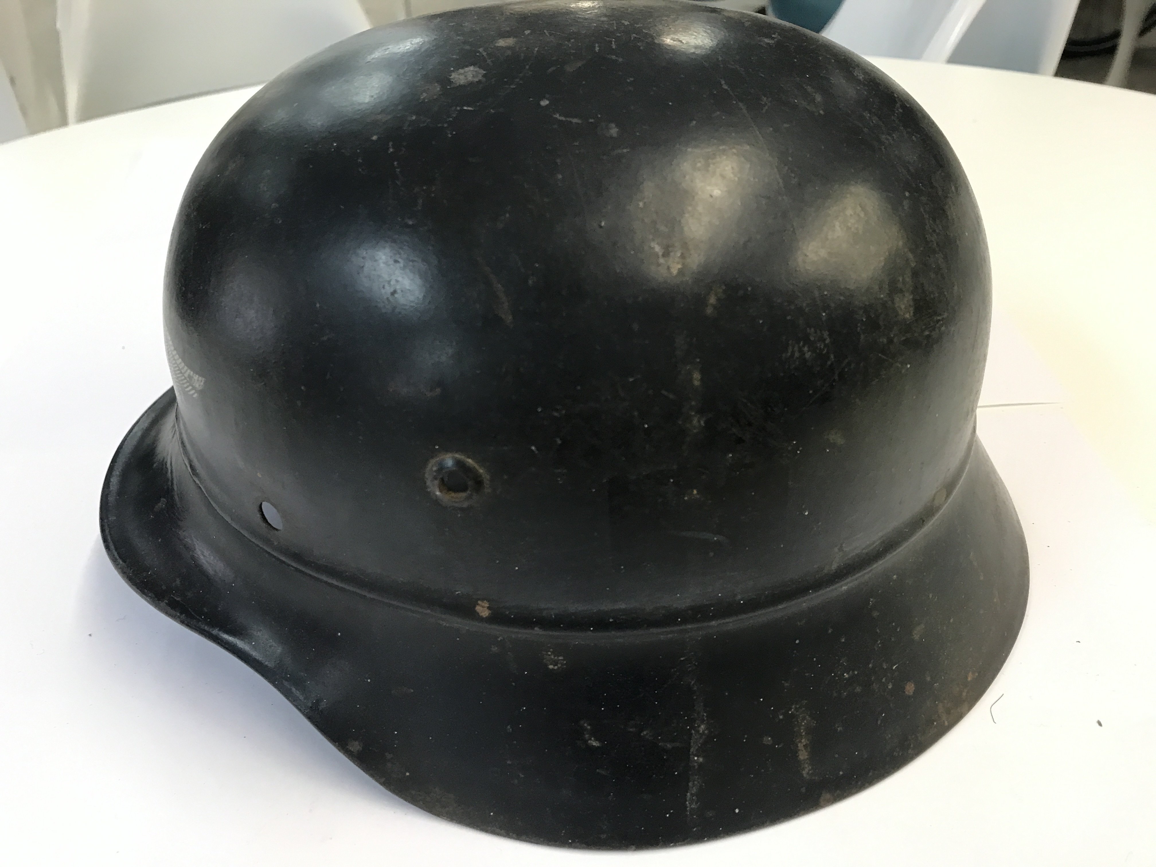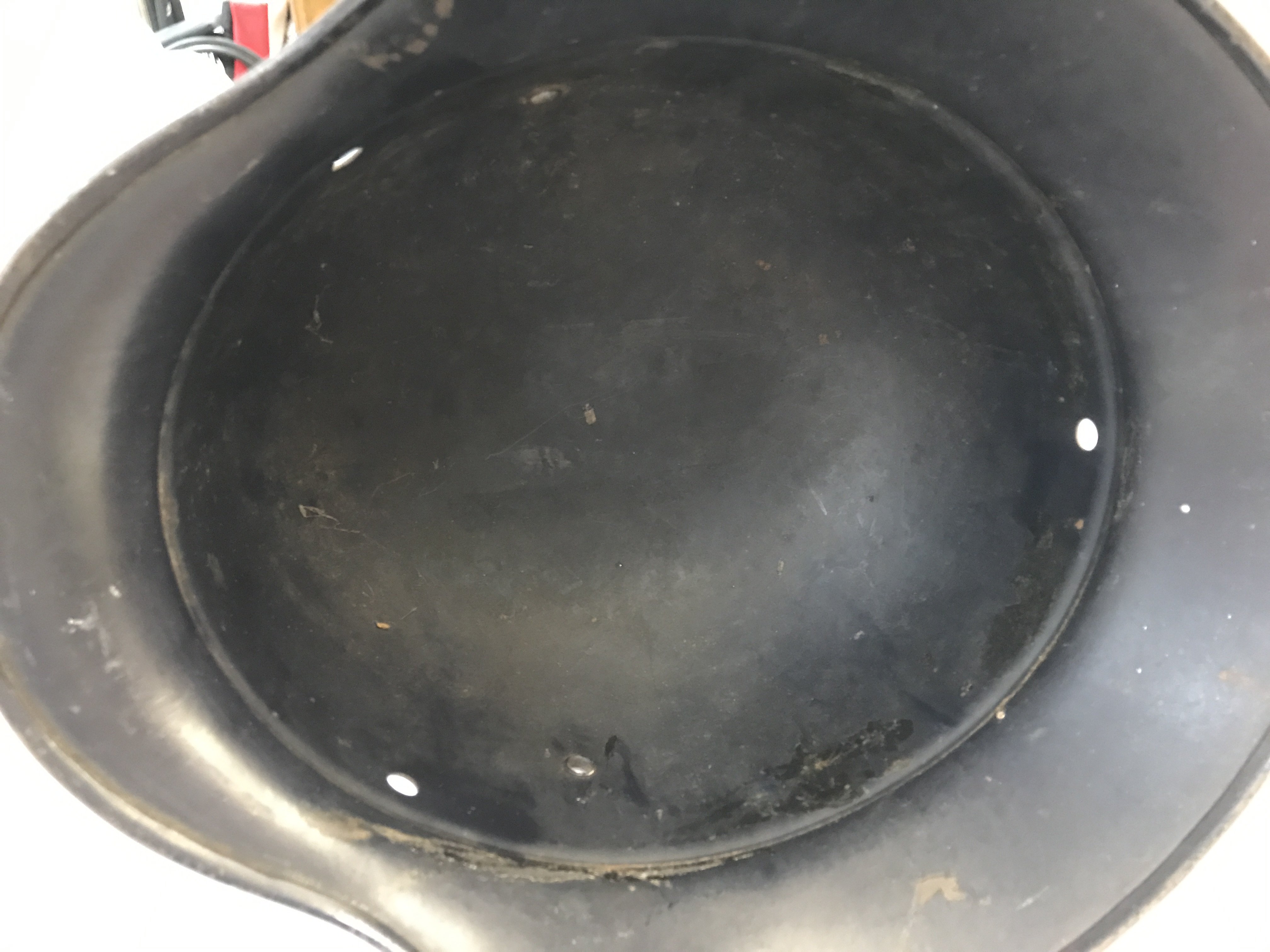 A German Third Reich Luftschutz fire helmet with no lining. With stamped EF64 and 675.