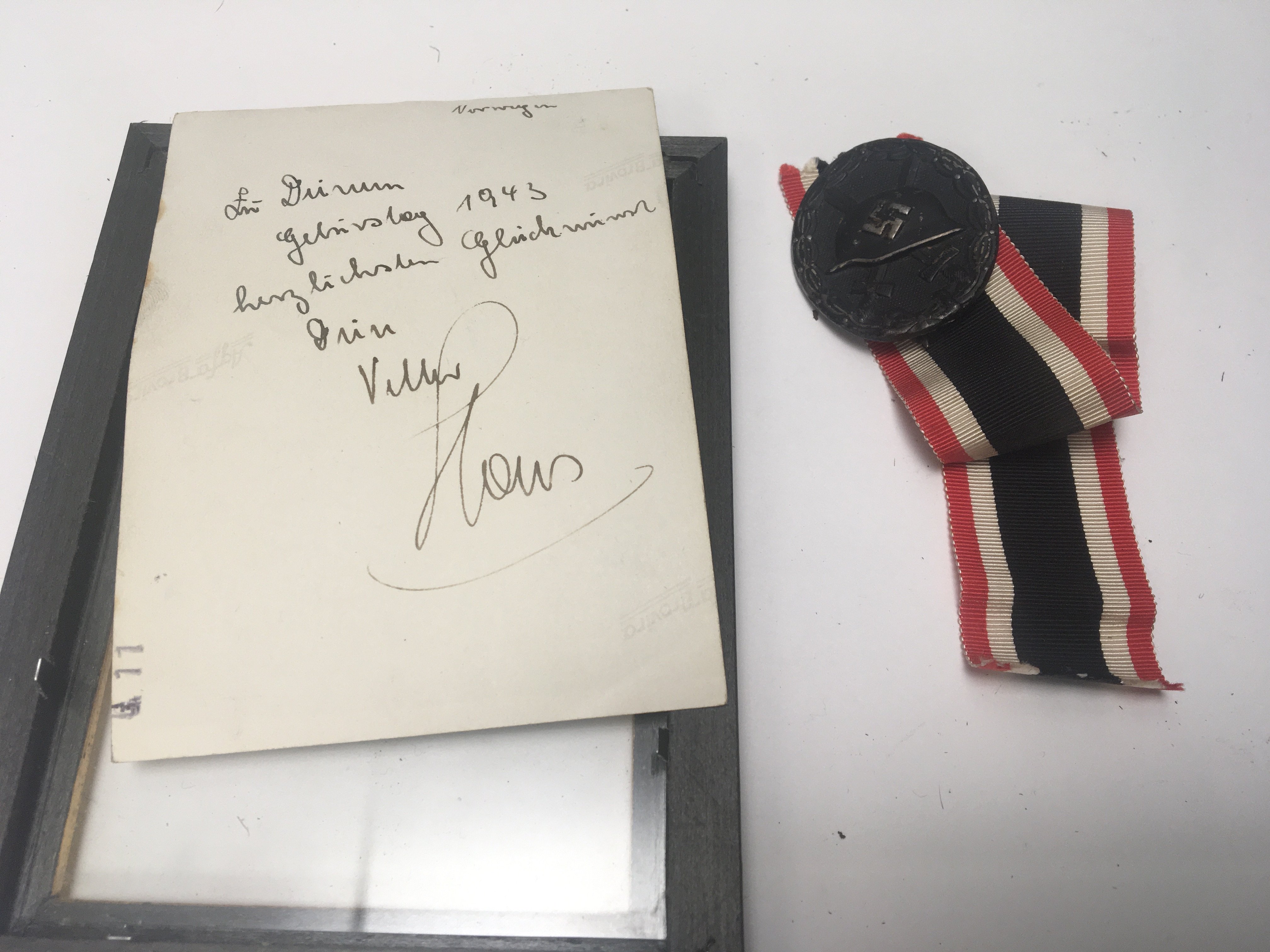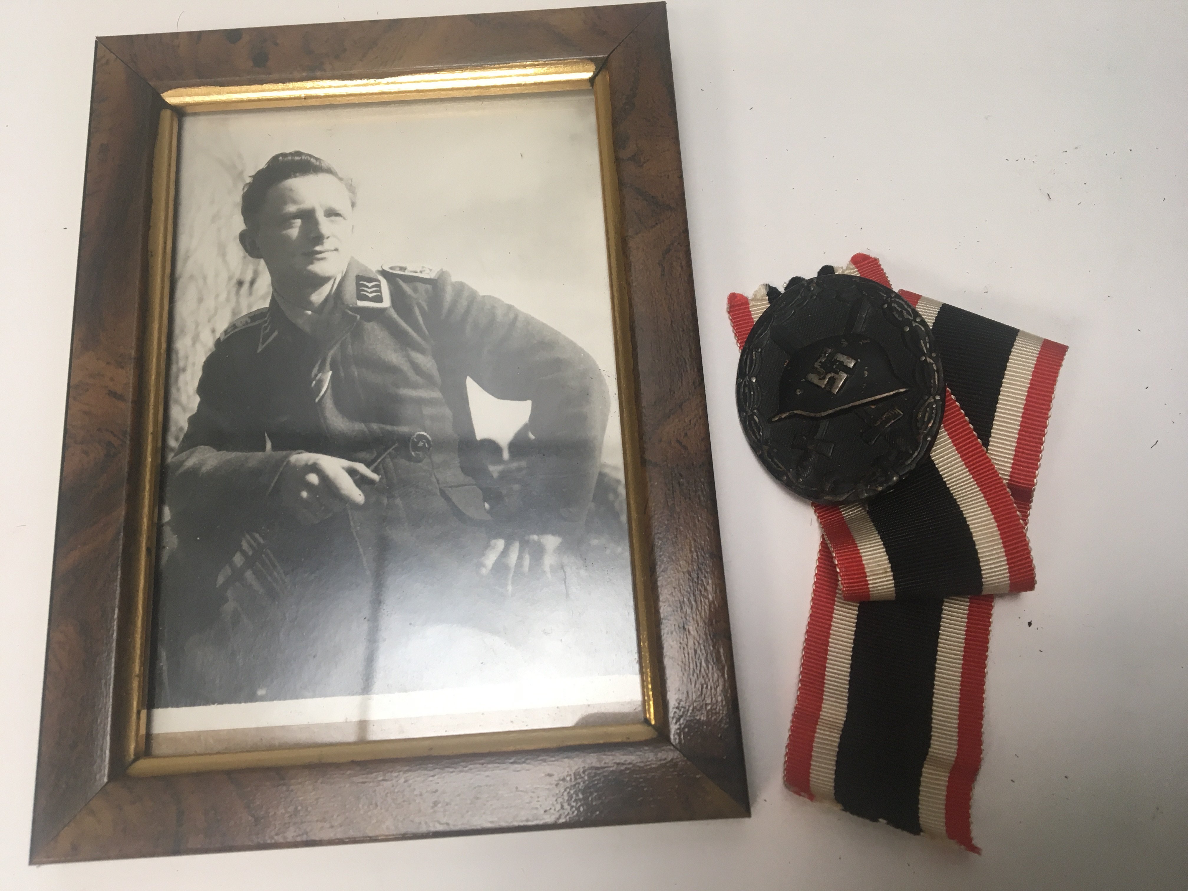 A German Third Reich Wound badge with medal ribbon and photograph of the recipient the reverse of the photo with hand written inscription 1943.