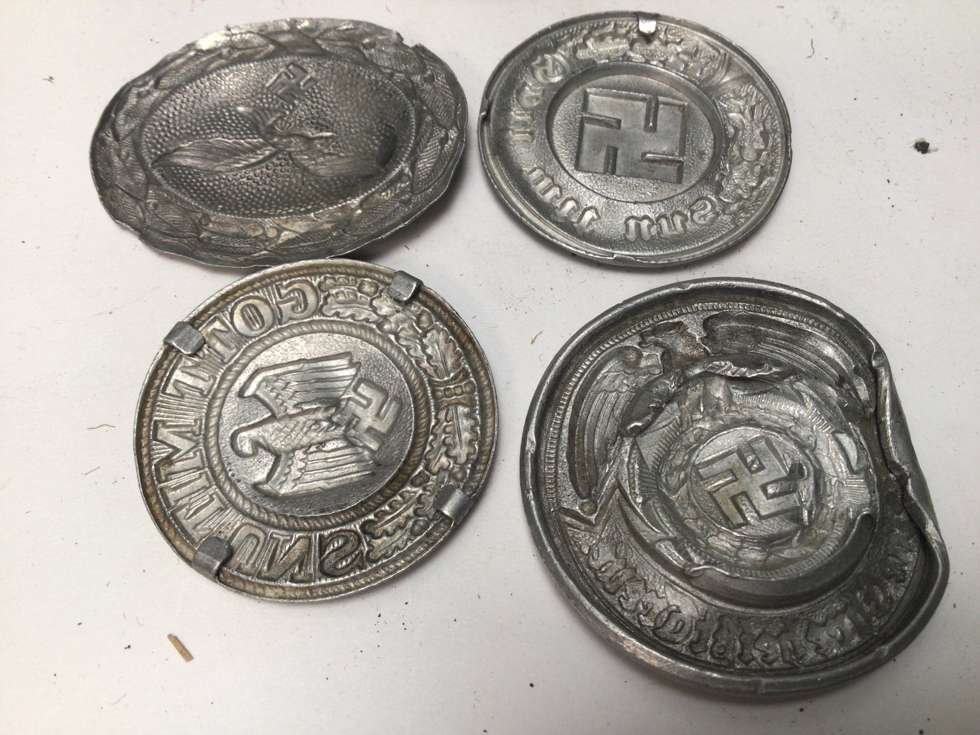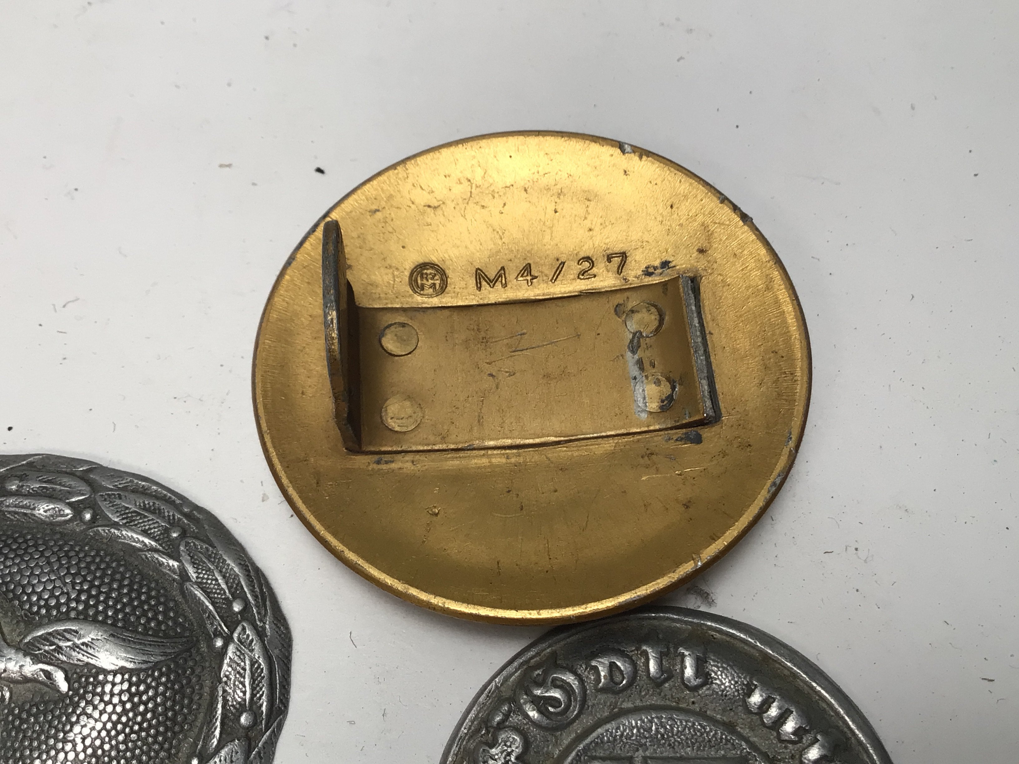 Four Aluminium pressed German Third Reich emblems including Luftwaffe and a gilt metal buckle the reverse with makers reference marks.