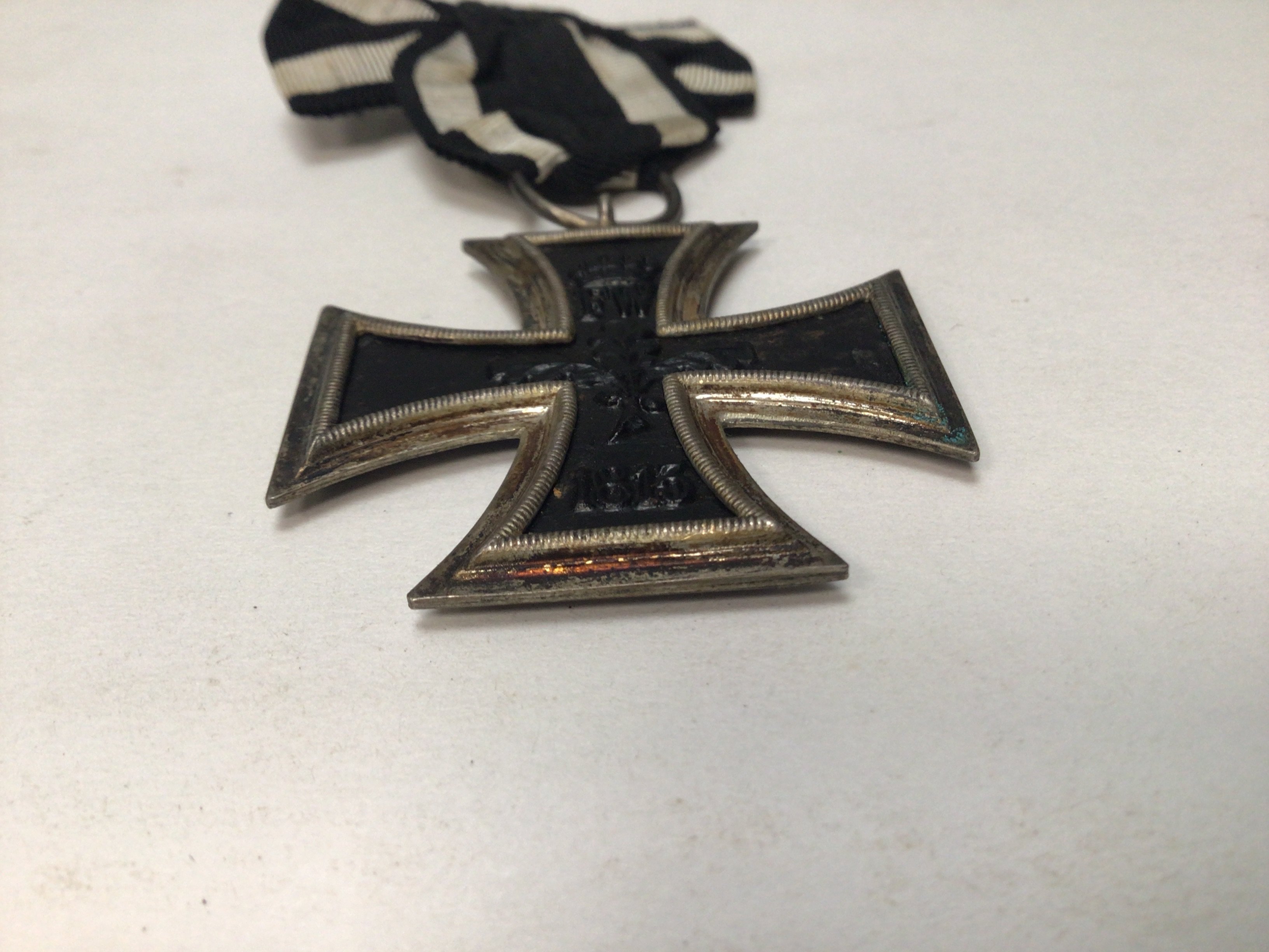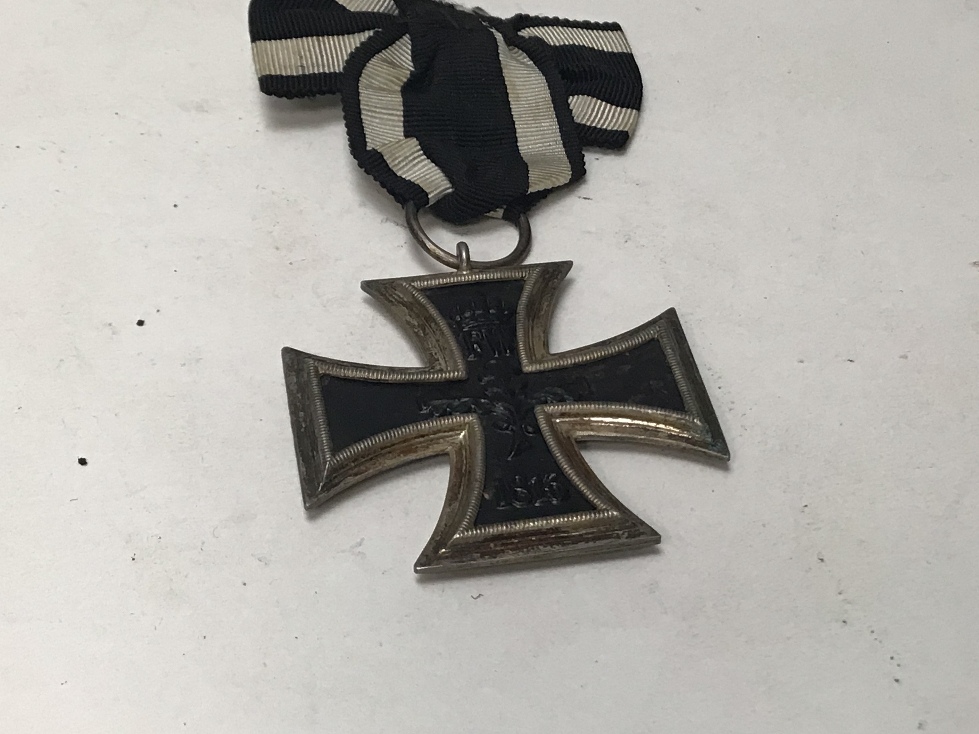 A German Imperial Iron cross with bow tied black and white ribbon.