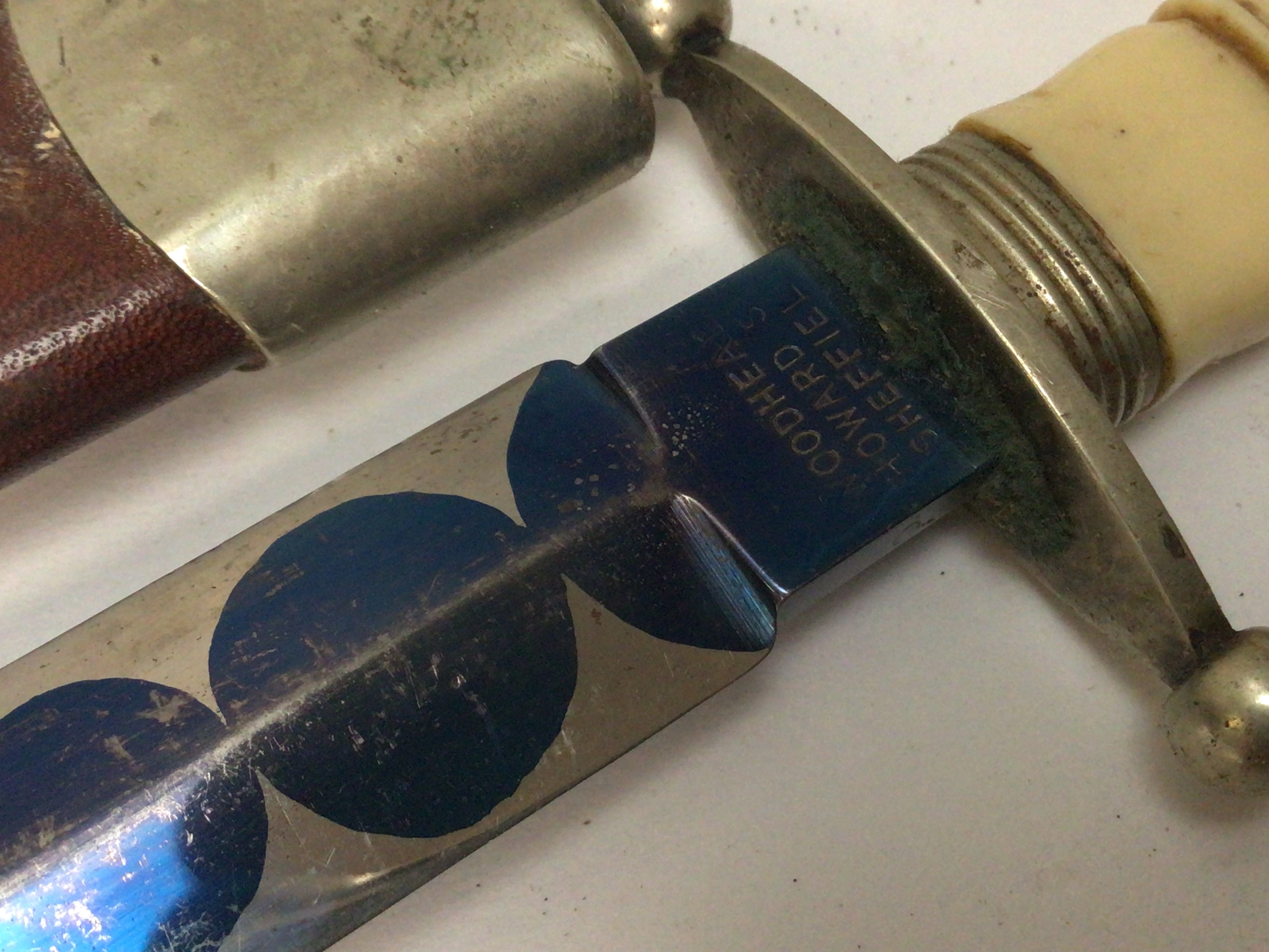 An unusual Presentation dagger the blade with a graduating blued circle pattern maker woodhead Sheffield. With a leather scabbard length 31cm