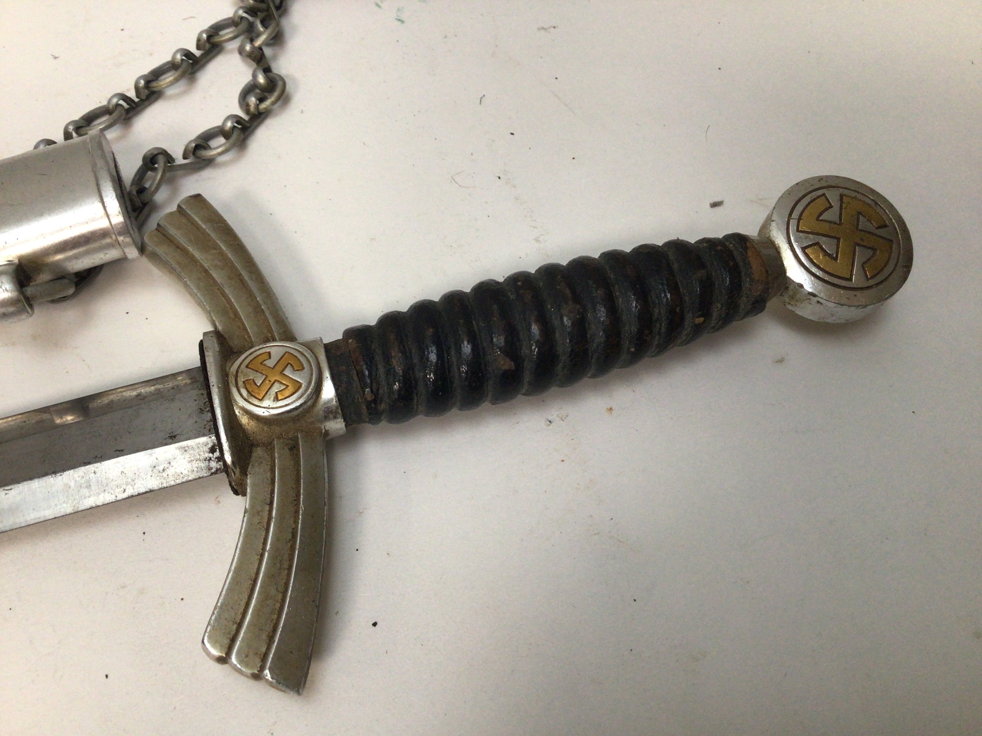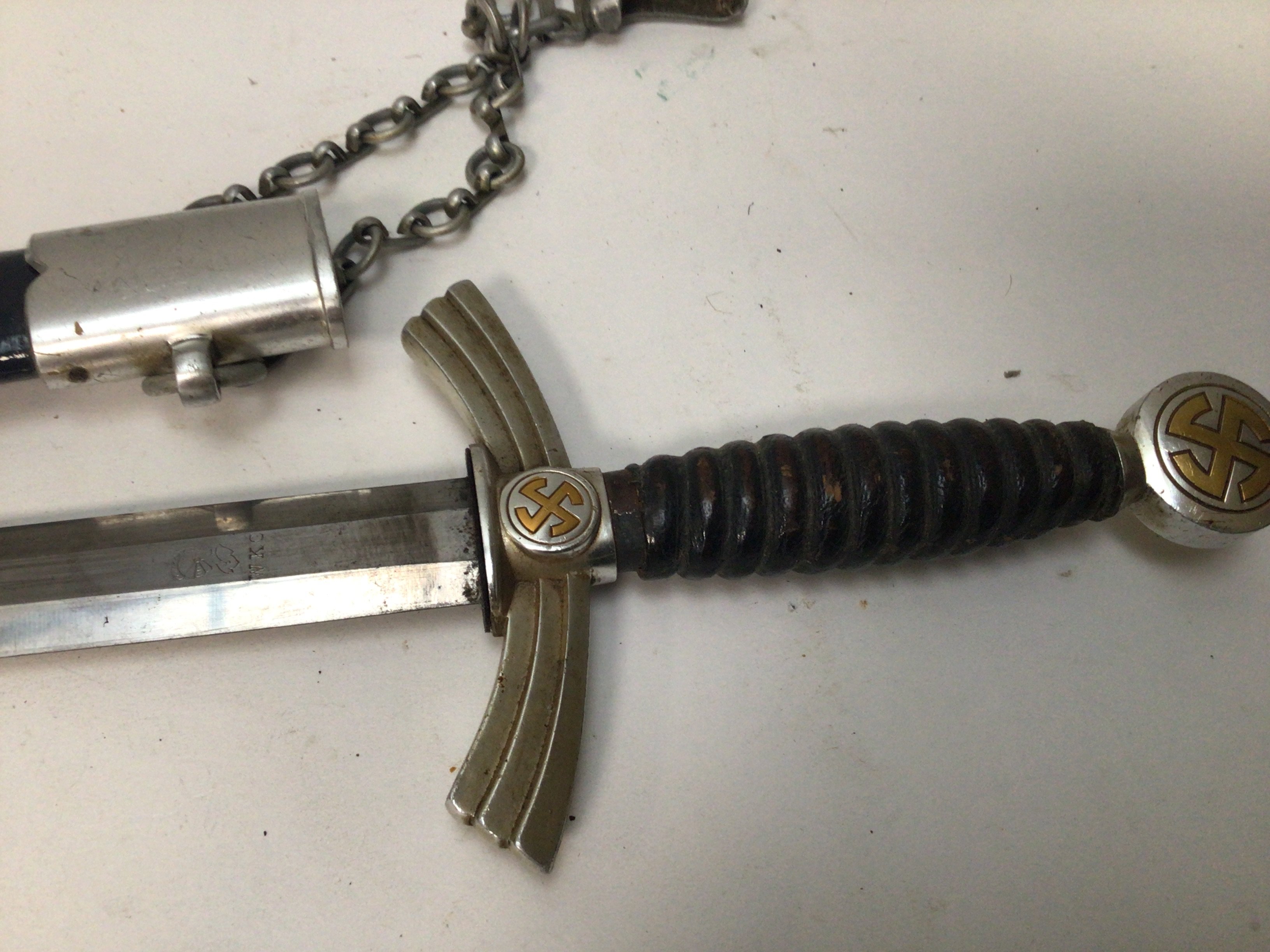 A German Third Reich first pattern Luftwaffa dagger with aluminium chain hanger makers stamp to the blade WKC leather and metal scabbed.
